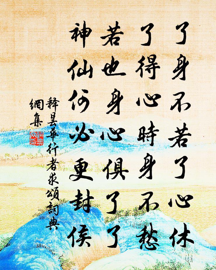 詩詞名句歷史字典書法欣賞書法字典國語詞典說文解字康熙字典古漢語字典標 題 作 者 詩 句 行者求頌作者:釋曇華 朝代:宋代行者求頌原文了身不若了心休,了得心時身不愁。若也身心俱了了,神仙何必更封侯。詩詞問答問:行者求頌的作者是誰?答:釋曇華問:行者求頌寫於哪個朝代?答:宋代釋曇華行者求頌書法欣賞行者求頌書法作品詩詞推薦壽城圍解制參向君玉貺以凱歌和韻二首李曾伯〔宋代〕誰知匕箸落轟雷,三月新城兩月圍。吉語雖傳淮鶴捷,驚心幾動海鷗機。公毋夸伐稱全璧,我為憂疑已佩韋。何處點絳唇張掄〔宋代〕浮世如何,問花何事花無語。夜來風雨。已送韶華暮。念此堪驚,得失休思慮。從今去。醉鄉深處。莫管流年度。浣溪沙趙長卿〔宋代〕露挹新荷撲鼻香。惱人更漏鄉浪浪。柳梳斜月上紗窗。小醉耳邊私語好,五雲樓閣羨劉郎。酒闌燭暗斷迴腸。雪後葛天民〔宋代〕冷蕊通幽信,孤山欠幾遭。杯因寒更滿,句到淡方高。雪滴晴檐雨,松翻夜壑濤。布衾雖似鐵,猶念早趨朝。趙十四兄見訪王昌齡〔唐代〕客來舒長簟,開閣延清風。但有無弦琴,共君盡尊中。晚來常讀易,頃者欲還嵩。世事何須道,黃精且養蒙。嵇康送友至飛雲渡林亮功〔宋代〕五里風濤路,人煙隔岸洲。去帆欹綠水,別棹會中流。西峴鐘聲曉,東山塔影浮。何人有機事,驚起一沙鷗。蕃有詩謝蕭伯和見訪伯和和之節推丈見而同作趙蕃〔宋代〕忽聞獨奏鳳將雛,三嘆遺音特未蕪。禁里端宜奉朝事,幕中那得尚平趨。臨流置酒高人意,叩戶求詩俗士無。迨此春日寄岳州從事李員外二首溫庭筠〔唐代〕苒弱樓前柳,輕空花外窗。蝶高飛有伴,鶯早語無雙。剪勝裁春字,開屏見曉江。從來共情戰,今日欲歸降。從小中條山王禹偁〔宋代〕崛起巨河邊,奔騰欲上天。遠臨滄海盡,高與太行連。大塊橫為脊,它山立似拳。土膏經舜耒,石險任秦鞭。洞黑採菊黃庭堅〔宋代〕一章南山有菊,於采其英。誰從汝往,視我惸惸。伊時之人,誰適有比。不與我謀,不知其已。二章薄言采之,遵京西市放生池墓銘佚名〔唐代〕龜言市,蓍言水。閒吟四首邵雍〔宋代〕予年四十七,已甫知命路。豈意天不絕,生男始為父。且免散琴書,敢望大門戶。萬中盡如此,何用過憂懼。和吳仲庶寄李子儀蘇頌〔宋代〕五紀修戎好,重關四向開。村郊縱牛馬,戰地長蒿萊。過客朝連暮,征軺去復回。元侯勤主禮,一一倒瓶罍。小重山王哲〔元代〕堪嘆犢兒堪嘆牛。若還省我語,是同流。性如燈燭命如油。相滋引,明焰出山頭。照破一齊休。前程除險路,沒深二色桃花方回〔宋代〕阮郎溪上醉腮融,驀忽深紅又淺紅。料得金閨描繡樣,一花成換幾針茸。倅車送海棠張九成〔宋代〕瘴雨蠻煙西復東,海棠嶺下占春風。清肌本自同梅潔,暈臉應知是酒紅。澹著燕脂春未透,半勻胡粉日初烘。此花閒居釋行海〔宋代〕閒拈白拂坐筠床,靜聽幽禽弄夕陽。滿地落花春已闌,深林只有蕙蘭香。次韻袁起岩常熟道中三絕句范成大〔宋代〕使君橫槊賦詩回,斷取天風海雨來。采筆從今閒不得,雪花梅蕊一時開。題國清寺劉知過〔宋代〕野人游遍天台寺,究竟招提此最奇。十里遠排清蔭入,五峰如按畫圖窺。隋初便有高僧傳,火後都亡過客詩。重到傷秋齊己〔唐代〕旦暮餘生在,肌膚十分無。眠寒半榻朽,立月一株枯。夢已隨雙樹,詩猶卻萬夫。名山未歸得,可惜死江湖。名句推薦天長路遠魂飛苦,夢魂不到關山難。李白《長相思·其一》 下馬登鄴城,城空復何見。岑參《登古鄴城》 回樂烽前沙似雪,受降城外月如霜。李益《夜上受降城聞笛》 雲中君不見,竟夕自悲秋。馬戴《楚江懷古三首·其一》 書劍時將晚,丘園日已暮。孟浩然《田園作》 用人之道,又當以心術為本也。宋濂、王褘《元史·列傳·卷六十八》 事君數,斯辱矣;朋友數,斯疏矣。孔子弟子《論語·里仁篇》 聖人之道,為而不爭。老子《老子·德經·第八十一章》 情共天涯秋黯,朱橋鎖深巷。吳文英《解蹀躞·醉雲又兼醒雨》 清風徐來,水波不興。蘇軾《前赤壁賦》