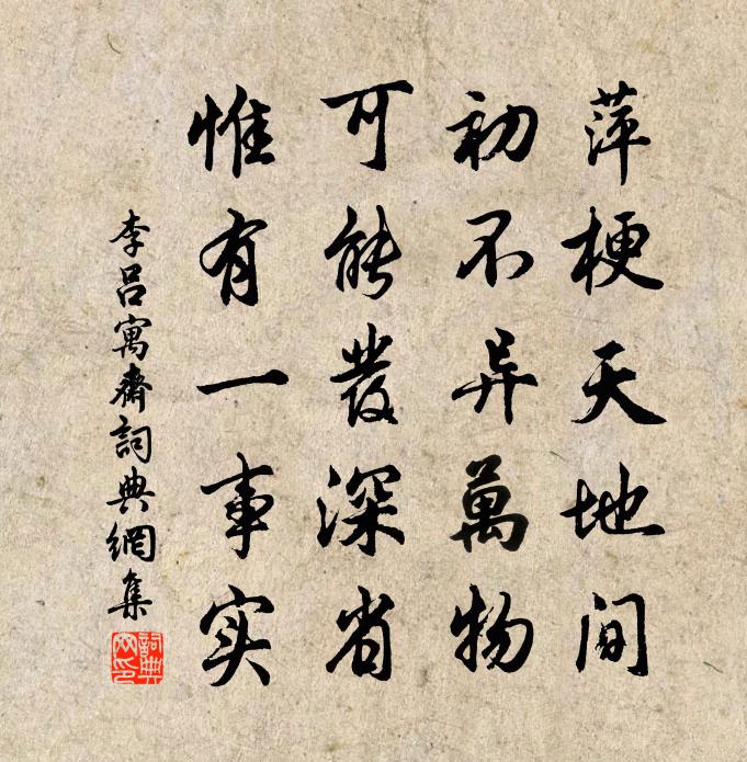 詩詞名句歷史字典書法欣賞書法字典國語詞典說文解字康熙字典古漢語字典標 題 作 者 詩 句 寓齋作者:李呂 朝代:宋代寓齋原文萍梗天地間,初不異萬物。可能發深省,惟有一事實。詩詞問答問:寓齋的作者是誰?答:李呂問:寓齋寫於哪個朝代?答:宋代李呂寓齋書法欣賞寓齋書法作品詩詞推薦野石岩吳鎰〔宋代〕夏夜深如秋氣清,夢迴風露濕桃笙。慚忻月色分山色,所恨蛙聲亂水聲。送萬大歸長沙王昌齡〔唐代〕桂陽秋水長沙縣,楚竹離聲為君變。青山隱隱孤舟微,白鶴雙飛忽相見。贈鳳翔柳司錄朱慶餘〔唐代〕杏園北寺題名日,數到如今四十年。點檢生涯與官職,一莖野竹在身邊。呈茅一霽先生黃庚〔宋代〕前輩凋零盡,如公尚典型。為僧眉獨白,見客眼長青。教子成三俊,傳家有六經。我來問奇字,應許扣柴扃。寄張季思翁卷〔宋代〕荊吳中隔萬山遙,那得相逢話寂寥。長憶梅花好時節,訪君船泊古楓橋。踏沙行 王 隱五香圖,作圓象墨,寫梅張雨〔元代〕中,韓明善有月上影娥池,人在眾香國一聊,今予為易玄賦之玉鏡台前,看花如霧。交柯接葉紛無數。春寒約住柳高陽台 西湖春感張炎〔宋代〕接葉巢鶯,平波卷絮,斷橋斜日歸船。能幾番游,看花又是明年。東風且伴薔薇住,到薔薇、春已堪憐。更悽然。新安殷明府家樂方響方乾〔唐代〕葛溪鐵片梨園調,耳底丁東十六聲。彭澤主人憐妙樂,玉杯春暖許同傾。次韻徐伯遠木芙蓉王之道〔宋代〕千林搖落見孤芳,銷得詩人賦拒霜。高壓菊花還獨步,靜窺池水試新妝。自憐衰病追歡懶,忽睹騷吟引興長。何必臣恭和御製昨秋曲宴近體詩一首繕寫投進冒瀆周必大〔宋代〕寰游不為菊叢生,觀宴元因谷順成。閣御芙蓉稱曼壽,殿開選德奏和聲。玉觴未飲心先醉,寶墨遙瞻眼倍明。身在書感陸游〔宋代〕俗學方嘩世,遺經寖已微。斯文未雲喪,吾道豈其非。拔本寧餘力,迷途幸識歸。新涼起衰疾,燈火耿郊扉。禪人並化主寫真求贊釋正覺〔宋代〕識得本真,不隨生滅。霽雲磨空,秋波濯月。浣溪沙 壽南陽周文卿八十宋褧〔元代〕生長昇平鶴髮翁。兒郎衣采照方瞳。晨昏甘旨鳳城中。緩步不須鳩杖策,酡顏時藉蟻杯烘。懶將身世應非熊。示賀客二首錢時〔宋代〕得便宜是落便宜,幾萬人中有個知。此日冬窩無事客,埋頭更學十分痴。墨梅魏了翁〔宋代〕素王本自離緇涅,墨者胡為亂等差。玄里只知楊子白,皜中謾見聖人污。分付商岩譜此花。定風波黃庭堅〔宋代〕上客休辭酒淺深。素兒歌里細聽沈。粉面不須歌扇掩,閒靜,一聲一字總關心。花外黃鸝能密語。休訴。有花能得金沙泉陳岩〔宋代〕金能生水水涵金,本本源源造化心。幾許碎金隨水出,披沙終日若為尋。掛金索王玠〔元代〕三更雞叫,冬至陽初動。取坎填離,直向泥丸送。火運周天,爐內鉛投汞。九轉丹成,白雪飛仙洞。寄僧知乾裴說〔唐代〕貌高清入骨,帝里舊臨壇。出語經相似,行心佛證安。題人移牡丹黃庶〔宋代〕林上春來恰恰忙,安排顏色與春裝。栽培欲報應先發,根柢雖移不改芳。紅藥便心減價,黃蜂偷喜蜜添香。憑君剩名句推薦人生一世,草長一春。佚名《增廣賢文·上集》 綠酒初嘗人易醉。一枕小窗濃睡。晏殊《清平樂·金風細細》 挽弓當挽強,用箭當用長。杜甫《前出塞九首》 中州遺恨,不知今夜幾人愁。辛棄疾《水調歌頭·和馬叔度游月波樓》 紅樓隔雨相望冷,珠箔飄燈獨自歸。李商隱《春雨》 天際兩蛾凝黛,愁與恨、幾時極。韓元吉《霜天曉角·題採石蛾眉亭》 至長反短,至短反長,天之道也。呂不韋《呂氏春秋·論·似順論》 半床落月蛩聲病,萬里寒雲雁陣遲。曹雪芹《殘菊》 何事吟余忽惆悵,村橋原樹似吾鄉。王禹偁《村行·馬穿山徑菊初黃》 所志在功名,離別何足嘆。陸龜蒙《別離》