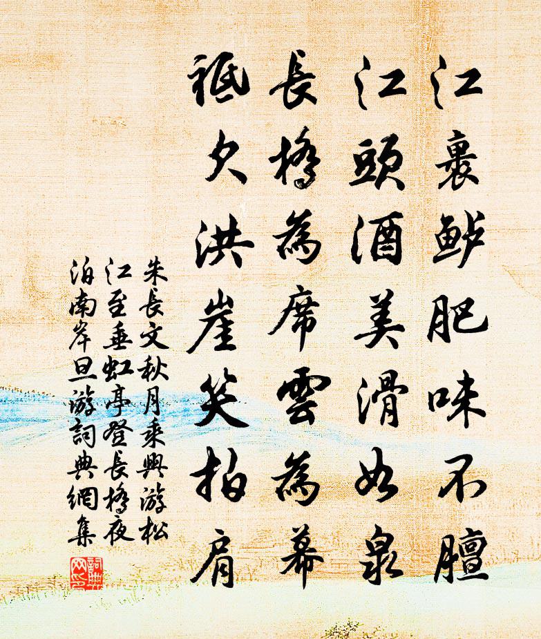 詩詞名句歷史字典書法欣賞書法字典國語詞典說文解字康熙字典古漢語字典標 題 作 者 詩 句 秋月乘興游松江至垂虹亭登長橋夜泊南岸旦游作者:朱長文 朝代:唐代原文江裹鱸肥味不膻,江頭酒美滑如泉。長橋為席云為幕,祗欠洪崖笑拍肩。詩詞問答問:《秋月乘興游松江至垂虹亭登長橋夜泊南岸旦游》的作者是誰?答:朱長文問:該詩寫於哪個朝代?答:唐代書法欣賞秋月乘興游松江至垂虹亭登長橋夜泊南岸旦游書法作品詩文賞析【原題】:秋月乘興游松江至垂虹亭登長橋夜泊南岸旦游寧境院因成十絕呈君勉且寄子通詩詞推薦虞美人·賦虞美人草辛棄疾〔宋代〕當年得意如芳草。日日春風好。拔山力盡忽悲歌。飲罷虞兮從此、奈君何。人間不識精誠苦。貪看青青舞。驀然斂次韻樂先生吳中見寄八首其范成大〔宋代〕幾多螻蟻與王侯,往古來今共一丘。遮莫功名掀宇宙,百年兩角寄蝸牛。采葛行吳泳〔宋代〕黃葛溪上生,青條谷中垂。薄言采其絲,緝彼綌與絺。縫作公子裳,遠寄閨人思。絺兮淒以風,不值當暑時。輕鮮習閒范成大〔宋代〕習閒成懶懶成痴,六用都藏縮似龜。雪已許多猶不飲,梅今如此尚無詩。閒看貓暖眠氈褥,靜聽猶寒叫竹籬。寂寞論詩三十首·二十九元好問〔金代〕池塘春草謝家春,萬古千秋五字新。傳語閉門陳正字,可憐無補費精神。武陵春佚名〔宋代〕柳綠花紅春爛熳。三生石修睦〔唐代〕聖跡誰會得,每到亦徘徊。一尚不可得,三從何處來。清宵寒露滴,白晝野雲隈。應是表靈異,凡情安可猜。永慶院送道原還儀真作詩要之王安石〔宋代〕歲暮青條已見梅,余花次第相爭開。淮南無此山林勝,作意春風更一來。挽鄭永福劉克莊〔宋代〕竹間梧畔故應佳,非但才高詩亦葩。世胄蚤通樞相譜,里人知是大魁家。誰言陶令才為米,不遣潘郎再種花。□□湘中館胡宏〔宋代〕館瞰瀟湘畫不成,波瀾入海是通津。風吹枕席清無夢,煙覆江城曉變春。柳色幾回輕別首,梅花偏見遠征人。誰能西江月薛式〔宋代〕一氣初回遇朔,鼎中神水溫溫。剛柔相會氣均勻。妙在無過渾沌。八卦循回循繞,推排九竅追奔。東西沈靜合朝昏魚相忘李石〔宋代〕通塗合西南,達人戒同異。二魚各自魚,是魚豈有二。濶處海茫茫,波濤適相戲。笑我湖上亭,鱗鬣紛族類。情知化人台易士達〔宋代〕富貴功名一窖塵,白頭人送黑頭人。若教總識玄玄理,劫火何曾焚法身。山水圖唐寅〔明代〕秋月攀仙桂,春風看杏花。一朝欣得意,聯步上京華。拋球樂詞劉禹錫〔唐代〕五彩繡團圓,登君玳瑁筵。最宜紅燭下,偏稱落花前。上客如先起,應須贈一船。春早見花枝,朝朝恨發遲。及看喜楊六侍御同宿(一喜下有與字)白居易〔唐代〕岸幘靜言明月夜,匡床閒臥落花朝。二三月里饒春睡,七八年來不早朝。濁水清塵難會合,高鵬低鷃各逍遙。眼看西湖徐僑〔宋代〕群巒回照紫瀰漫,坐攬湖光風不寒。最惜傍欄鳧鷺狎,往來不作眼生看。趙振文在城北廂兩月無日不游馬塍作歌美之請葉適〔宋代〕馬塍東西花百里,錦雲繡霧參差起。長安大車喧廣陌,問以馬塍雲未識。酴醾縛籬金沙牆,薜荔樓閣山茶房。高花游九鎖山張鎡〔宋代〕九鎖非凡境,煙雲路不分。山寒長帶雨,洞古不收雲。夜宿聽林鶴,晨炊摘野芹。黃冠皆好事,添注石爐熏。呈潘潭州十首趙蕃〔宋代〕梅花初出炯如冰,未許余花似我能。太息天公不加意,放教風雨苦侵陵。名句推薦譬猶使人負劍,而求其壽也。墨子《墨子·25章 節葬(下)》 此日六軍同駐馬,當時七夕笑牽牛。李商隱《馬嵬·其二》 請為父老歌,艱難愧深情杜甫《羌村三首·其三》 疏懶意何長,春風花草香。黃庭堅《菩薩蠻·半煙半雨溪橋畔》 故鄉歸去千里,佳處輒遲留。蘇軾《水調歌頭·安石在東海》 天涯海角悲涼地,記得當年全盛時。趙鼎《鷓鴣天·建康上元作》 荊吳相接水為鄉,君去春江正淼茫。孟浩然《送杜十四之江南 / 送杜晃進士之東吳》 勇於敢則殺,勇於不敢則活。文子《文子·卷五·道德》 卜以決疑,不疑何卜。李汝珍《鏡花緣·第十二回》 有梅無雪不精神,有雪無詩俗了人。盧梅坡《雪梅·其二》