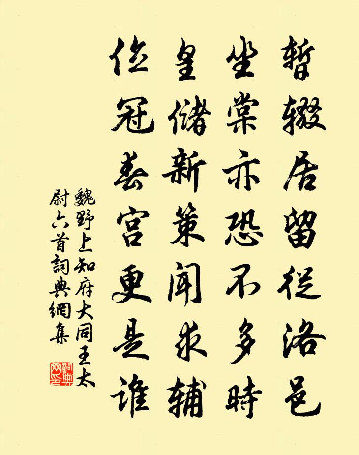 詩詞名句歷史字典書法欣賞書法字典國語詞典說文解字康熙字典古漢語字典標 題 作 者 詩 句 上知府大同王太尉六首作者:魏野 朝代:宋代上知府大同王太尉六首原文暫輟居留從洛邑,坐棠亦恐不多時。皇儲新策聞求輔,位冠春1|1宮更是誰。詩詞問答問:上知府大同王太尉六首的作者是誰?答:魏野問:上知府大同王太尉六首寫於哪個朝代?答:宋代魏野上知府大同王太尉六首書法欣賞上知府大同王太尉六首書法作品詩詞推薦仆至赤城英侍見訪好語瀾翻喜以成詩曹勛〔宋代〕閒中忙事厭營營,款段揚鞭訪赤城。問法未經雙澗路,彌天先見萬年英。繁陰成幄暑風薄,好草傳香朝雨晴。杖屨次梅評事韻朱長文〔唐代〕瓶盂瀟灑似禪家,任有籯金豈足夸。自入醉鄉頭不白,新詩何用祝蒼華。題繡川驛陸游〔宋代〕繡川池閣記曾游,落日欄邊特地愁。白首即今行萬里,淡煙依舊送孤舟。歸心久負鱸魚鱠,春色初回杜若洲。會買布袋贊釋紹曇〔宋代〕楖栗橫肩拖布袋,回頭轉腦小兒嬉。休言兜率宮中事,已被渠儂捉敗伊。題崇蘭圖二首陳與義〔宋代〕兩公得我色敷腴,藜杖相將入畫圖。我已夢中都識路,秋風舉袂不踟躕。紅黃賈似道〔宋代〕頭似珊瑚項班紅,翅如金箔肉帶黃。腿腳{外囗內昆}如玉色,秋蟲見了自慌張。次韻王適春雪二首蘇轍〔宋代〕春雪飄搖旋不成,依稀屨跡散空庭。山藏復閣猶殘白,日照南峰已半青。句韓縝〔宋代〕劍外吾能說,山川大抵同。君行在巴徼,民俗半夷風。句邵伯溫〔宋代〕南充到日黃柑熟,待摘霜包寄遠情。古斷腸曲三十首周端臣〔宋代〕壓髻慵簪雙鳳釵,傷心羞覷合歡鞋。折花暗卜郎音信,旋擊羅裙走下階。天門謠·牛渚天門險賀鑄〔宋代〕牛渚天門險,限南北、七雄豪占。清霧斂,與閒人登覽。待月上潮,平波灩灩,塞管輕吹新阿濫。風滿檻,歷歷數仆在會稽泛舟至剡中是時雪遲梅子煙外萬枝夾王銍〔宋代〕山回水轉碧玲瓏,月在群山四合中。香滿一船梅勝雪,休夸訪戴畫屏風。不食姑(一作贈山中女道士)張籍〔唐代〕幾年山里住,已作綠毛身。護氣常稀語,存思自見神。養龜同不食,留藥任生塵。要問西王母,仙中第幾人。龍門道中作邵雍〔宋代〕物理人情自可明,何嘗慼慼向平生。卷舒在我有成筭,用舍隨時無定名。滿目雲山俱是樂,一毫榮辱不須驚。侯門梅花張道洽〔宋代〕才有梅花便不同,一年清致雪霜中。疏疏籬落娟娟月,寂寂軒窗淡淡風。生長元從瓊玉圃,安排合在水晶宮。何須讀蘇叔黨汝州北山雜詩次其韻陸游〔宋代〕暑耘日炙背,寒耕泥沒腳;眾人占膏腴,我獨治磽确。力盡功未見,厥土但如昨,豈惟窘糠粞,直恐轉溝壑。今年送陳景初金陵持服舉族貧病煩君藥石之功王安石〔宋代〕舉族貧兼病,煩君藥石功。長安何日到,一一問歸鴻。新正張耒〔宋代〕春風浩浩春陽盡,老木生芽綠如豆。古巢老烏聲鴉鴉,南陂雨乾麥將秀。人家寒食無一月,青箬蒸魚競時節。白衫次楊樂道韻六首其四──後苑詳定書懷王安石〔宋代〕文墨由來妙禁中,家傳豈獨賦河東。平生聽想風聲早,數日追隨笑語同。御水新如鴨頭綠,宮花更有鶴翎紅。看花廢畦杜甫〔唐代〕秋蔬擁霜露,豈敢惜凋殘。暮景數枝葉,天風吹汝寒。綠沾泥滓盡,香與歲時闌。生意春如昨,悲君白玉盤。名句推薦支離東北風塵際,漂泊西南天地間。杜甫《詠懷古蹟五首·其一》 歲夜高堂列明燭,美酒一杯聲一曲。李頎《聽安萬善吹觱篥歌》 孤客傷逝湍,徒旅苦奔峭。謝靈運《七里瀨》 便覺眼前生意滿,東風吹水綠參差。張栻《立春偶成》 寫不成書,只寄得、相思一點。張炎《解連環·孤雁》 耕犁千畝實千箱,力盡筋疲誰復傷?李綱《病牛》 水晶簾不下,雲母屏開,冷浸佳人淡脂粉。晁補之《洞仙歌·泗州中秋作》 燕子不知人去也,飛認闌乾。韓疁《浪淘沙·莫上玉樓看》 扶桑已在渺茫中,家在扶桑東更東。韋莊《送日本國僧敬龍歸》 交河城邊鳥飛絕,輪台路上馬蹄滑。岑參《天山雪歌送蕭治歸京》