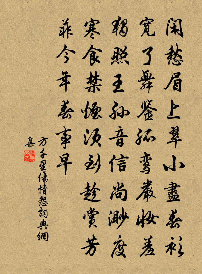 詩詞名句歷史字典書法欣賞書法字典國語詞典說文解字康熙字典古漢語字典標 題 作 者 詩 句 傷情怨作者:方千里 朝代:宋代傷情怨原文閒愁眉上翠小。盡春衫寬了。舞鑒孤鸞,嚴妝羞獨照。王孫音信尚渺。度寒食、禁菸須到。趁賞芳菲,今年春事早。詩詞問答問:傷情怨的作者是誰?答:方千里問:傷情怨寫於哪個朝代?答:宋代方千里傷情怨書法欣賞傷情怨書法作品詩詞推薦念奴嬌·西湖和人韻辛棄疾〔宋代〕晚風吹雨,戰新荷、聲亂明珠蒼璧。誰把香奩收寶鏡,雲錦紅涵湖碧。飛鳥翻空,游魚吹浪,慣趁笙歌席。坐中豪降龍曾鞏〔宋代〕降龍左右施襟裾,兩廊夾廟深渠渠。禮下天子一等爾,衣服居處何其殊。文旛列戟照私第,青紫若若官其孥。先後月坡亭李耆明見菊毛幵〔宋代〕我懷淵明真,千載猶神交。重吟九日詩,風節殊未凋。良辰不再舉,秋氣日以高。淒飈送落景,餘霞斂塵霄。萬象晨起雪作趙蕃〔宋代〕苦寒不成眠,哀哉何時旦。擁衣聽雞鳴,有類巢木鸛。窗明若彷彿,自起尋宿炭。殘爐星銷盡,束緼分鄰爨。頻年和吳龍圖韻五首有懷致政景仁侍郎文同〔宋代〕一生名籍占風流,為識莊環可自由。几杖未銷容早退,廟堂將近肯中休。有人把酒思高節,何處揮毫詠素秋。故國次韻子有賦著圖書所洪咨夔〔宋代〕富兒種卮敵花君,貧翁結柳呼奴星。物理虧盈蛇夔蚿,惟有讀花可以逃天刑。守玄老死天祿閣,巧宦三入承明庭。陳伯紀列岫三首曾豐〔宋代〕一塔數椽崖半腰,工夫蕈草意翛翛。青山雖老猶兒態,邂逅吾人喜飲醪。西江月姬翼〔元代〕覺性從來具足,天真本自完全。浮生多被眼睛瞞。並月空花繚亂。八識元從孰起,六根本是誰般。豁然打破這疑團滿庭芳劉處玄〔元代〕遇七修齋,庚申餐素,禮參旦望行香。時時念道,世夢頓然忘。三教經書為伴,真閒處、勝似貪忙。迷雲散,一輪水調歌頭(壽太守黃少卿。)葉路鈐〔宋代〕天啟黃旗運,復見漢黃香。名高黃榜,飛黃騰踏入鴛行。文彩蘇黃而上,政事龔黃而右,黃紙選循良。黃見眉間色殘夢陸游〔宋代〕少時鐵馬蹴河冰,老去摧藏百不能。風雨滿山窗未曉,只將殘夢伴殘燈。晚皈再度西橋四首楊萬里〔宋代〕皈近溪橋東復東,蓼花迎路舞西風。草深一鳥忽飛起,儂不覺他他覺儂。余為建陽令遣小吏王堪為西山翁之役翁留之仙劉克莊〔宋代〕去去尋師莫遠尋,蓬萊何處海深深。山房幸有棲身地,且讀西山夜氣箴。晨起陸游〔宋代〕初日破蒼煙,零亂松竹影。老夫起燒香,童子行汲井。平生水雲身,不墮車馬境。願言學龐公,全家事幽屏。挽王學正葉大年〔宋代〕書劍當年游上都,賢關蟲篆校諸儒。文華燦燦九苞鳳,俊氣駸駸千里駒。妙質競誰揮堊漫,白頭空此死樵蘇。遺編寒食雨中楊冠卿〔宋代〕晚風一再老狼籍,春去匆匆不可尋。蜂蝶亦如人意薄,便無訊息到牆陰。山中早起劉乙〔唐代〕雞調扶桑枝,秋空隱少微。闊雲霞並曜,高日月爭輝。若厥開天道,同初發帝機。以言當代事,閒辟紫宸扉。書孫僅甘棠集後王禹偁〔宋代〕新集甘棠盡雅言,獨疑陳杜指根源。一飛事往名雖屈,六義功成道更尊。骨氣向人蹲獬豸,波濤無敵瀉崑崙。明年與曾公路呂少馮飲曾會卷舟中吳則禮〔宋代〕百年久付一毫端,異縣追隨得自寬。聲入浦雲歌扇麗,影浮江月酒樽寒。黃花窈窕且經眼,白髮蕭條初映冠。共倚送史館學士楊億閩中迎侍王禹偁〔宋代〕迎侍閩川去路長,才名官職過歐陽。翰林貴族夸東榻,史館清銜慶北堂。別酒正逢寒菊綻,歸舟應見早梅香。拾遺名句推薦望極春愁,黯黯生天際。柳永《蝶戀花·佇倚危樓風細細》 算陰晴,渾似幾番,渭城故人離會。吳文英《永遇樂·乙巳中秋風雨》 此情可待成追憶?只是當時已惘然。李商隱《錦瑟》 井蛙不可以語于海者,拘於虛也;夏蟲不可以語於冰者,篤於時也莊子《莊子·外篇·秋水》 新秋逢閏,鵲橋重駕,兩度人間乞巧。顧太清《鵲橋仙·雲林矚題閏七夕聯吟圖》 那作商人婦,愁水復愁風。李白《長干行二首》 月色入高樓,相思兩處愁。秋瑾《菩薩蠻·寄女伴》 習俗移志,安久移質。荀子《荀子·儒效》 胸中有誓深于海,肯使神州竟陸沉?鄭思肖《二礪》 明朝掛帆席,楓葉落紛紛。李白《夜泊牛渚懷古》