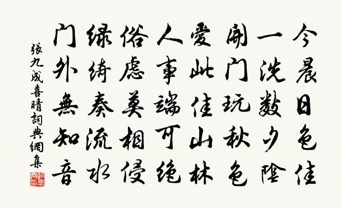 詩詞名句歷史字典書法欣賞書法字典國語詞典說文解字康熙字典古漢語字典標 題 作 者 詩 句 喜晴作者:張九成 朝代:宋代喜晴原文今晨日色佳,一洗數夕陰。開門玩秋色,愛此佳山林。人事端可絕,俗慮莫相侵。綠綺奏流水,門外無知音。詩詞問答問:喜晴的作者是誰?答:張九成問:喜晴寫於哪個朝代?答:宋代張九成喜晴書法欣賞喜晴書法作品詩詞推薦浪淘沙慢·曉陰重周邦彥〔宋代〕曉陰重,霜凋岸草,霧隱城堞。南陌脂車待發,動門欲飲乍闋。正拂面垂楊堪攬結,掩紅淚、玉手親折。念漢浦離句錢惟演〔宋代〕小雨郊原連苦霧,夕陽樓閣照丹楓。送連庶宋祁〔宋代〕之子遠參卿,勞勞千里行。素衣因客變,華發看秋生。遇鯉頻為訊,逢蒪試作羹。塵埃半通綬,何地免將迎。感時一首再用前韻呈元詔久善文彧郭印〔宋代〕我傷天缺無人補,四海嬰兒失其母。北人躍馬渡黃河,請和使者空旁午。二君北去宗族從,國祚千鈞垂一縷。天心程隱君輓詩魏了翁〔宋代〕歲凶瓶粟罄,屋破褚衣單。地寂鳥烏樂,天高鴻雁寒。墳前晚生桂,露下草摧蘭。只把存耕處,令人反覆看。贊歷代天師第三十一代諱時修字朝英白玉蟾〔宋代〕是個清都一散郎,凝神聚氣煉丹陽。片雲孤鶴無蹤跡,半夜風寒萬里霜。樂大夫輓詞五首駱賓王〔唐代〕可嘆浮生促,吁嗟此路難。丘陵一起恨,言笑幾時歡。蕭索郊埏晚,荒涼井徑寒。誰當門下客,獨見有任安。蒿里游委羽山李景文〔宋代〕王國風塵暗,仙山景物新。龍宮逾紫禁,鶴寓遠朱輪。冰融溪上日,花發洞門春。一似桃源路,從今學避秦。司徒侍中杜正獻公輓辭五首蘇頌〔宋代〕卜築東畿謝事還,冥鴻高蹈孰能攀。朝廷寵遇三公禮,園館優遊十載閒。此日精誠騎列宿,他時歌詠嘆頹山。慮終送從弟郢東歸孟郊〔唐代〕爾去東南夜,我無西北夢。誰言貧別易,貧別愁更重。曉色奪明月,征人逐群動。秋風楚濤高,旅榜將誰共。卜運算元·燕子不曾來蔣春霖〔清代〕燕子不曾來,小院陰陰雨。一角闌乾聚落花,此是春歸處。 彈淚別東風,把酒澆飛絮。化了浮萍也是愁,莫向題法相岩鄭域〔宋代〕法相具諸相,寶方無定方。突兀虎豹立,嵌空蛟龍藏。入地轉輪遠,透天圓竇光。何人鑒混沌,擲棄官路傍。書情寄詩友李中〔唐代〕默默誰知我,裴回野水邊。詩情長若舊,吾事更無先。芳草人稀地,殘陽雁過天。靜思吟友外,此意復誰憐。出塞李新〔宋代〕城頭落日黃雲起,斷草飛蓬滿千里。紅塵一騎踏高回,半夜驅兵渡遼水。馬蹄行盡關山月,燕然山下沙如雪。負戈送賀遂員外外甥王維〔唐代〕南國有歸舟,荊門溯上流。蒼茫葭菼外,雲水與昭丘。檣帶城烏去,江連暮雨愁。猿聲不可聽,莫待楚山秋。游劉阮洞釋慧遠〔宋代〕雲深露冷無人到,小徑陰雲翠欲迷。吊罷神仙古時跡,亂峰影裹聽猿啼。余永顏輓詞樓鑰〔宋代〕戶外諸生屨,門前長者車。柳袍空自染,瓶粟竟無儲。隱行刑宗黨,清風照晨閭。沉冥誰為表,賴有子云書。和育王十二題靈鰻井李覯〔宋代〕田苗自枯槁,井鰻人所禱。若教龍有靈,此魚何足道。水龍吟(夢)楊樵雲〔宋代〕多情不在分明,繡窗日日花陰午。依依雲絮,溶溶香雪,覷他尋路。一滴東風,怎生消得,翠苞紅栩。被疏鐘敲斷改秩注縣西歸過上饒見太守同年莫郎中曾豐〔宋代〕集英殿前始相識,公已策名上通籍。銀章朱紱爛映身,鑠我青前黯無色。上饒城裡重相望,公已厭直辭周行。皂蓋名句推薦常有江南船,寄書家中否。王維《雜詩三首》 天南地北雙飛客,老翅幾回寒暑。元好問《摸魚兒·雁丘詞 / 邁陂塘》 繁枝容易紛紛落,嫩葉商量細細開。杜甫《江畔獨步尋花七絕句》 料峭春風吹酒醒,微冷,山頭斜照卻相迎。蘇軾《定風波·三月七日》 秋蕭索。梧桐落盡西風惡。黃機《憶秦娥·秋蕭索》 形影忽不見,翩翩傷我心。曹植《雜詩六首·其一》 兒童相見不相識,笑問客從何處來。賀知章《回鄉偶書二首·其一》 嬌艷輕盈香雪膩,細雨黃鶯雙起。張泌《滿宮花·花正芳》 那堪旅館經殘臘,只把空書寄故鄉。王建《維揚冬末寄幕中二從事》 善用兵者不以短擊長,而以長擊短。司馬遷《史記·淮陰侯列傳》
