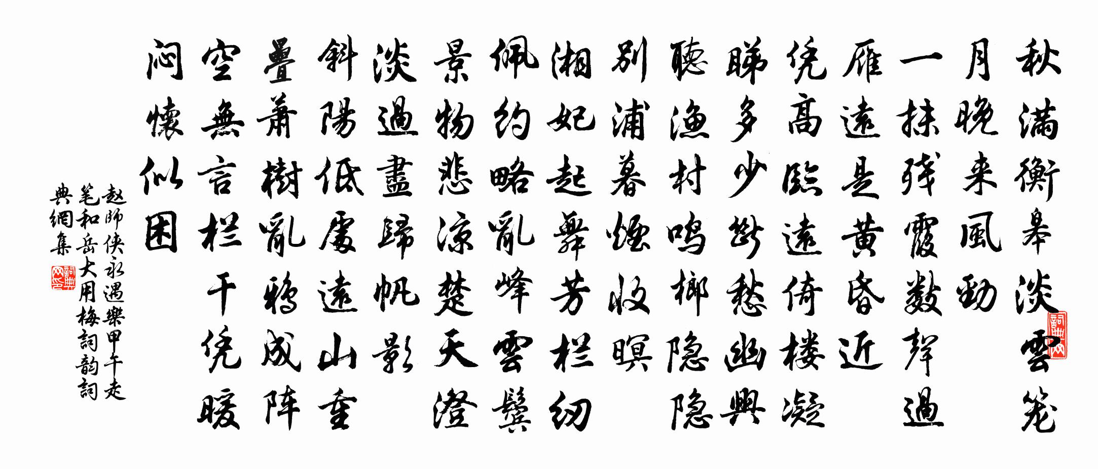 詩詞名句歷史字典書法欣賞書法字典國語詞典說文解字康熙字典古漢語字典標 題 作 者 詩 句 永遇樂(甲午走筆和岳大用梅詞韻)作者:趙師俠 朝代:宋代原文秋滿衡皋,淡雲籠月,晚來風勁。一抹殘霞,數聲過雁,遠是黃昏近。憑高臨遠,倚樓凝睇,多少斷愁幽興。聽漁村、鳴榔隱隱,別浦暮煙收暝。湘妃起舞,芳欄紉佩,約略亂峰雲鬢。景物悲涼,楚天澄淡,過盡歸帆影。斜陽低處,遠山重疊,蕭樹亂鴉成陣。空無言,欄乾憑暖,悶懷似困。詩詞問答問:《永遇樂(甲午走筆和岳大用梅詞韻)》的作者是誰?答:趙師俠問:該詩寫於哪個朝代?答:宋代問:該詩是什麼體裁?答:詞書法欣賞永遇樂(甲午走筆和岳大用梅詞韻)書法作品詩詞推薦別友人宋伯仁〔宋代〕菊花村晚雁來天,同住蘭舟未十年。今日送君須盡醉,離人獨上洞庭船。鎖窗寒/瑣寒窗程先〔宋代〕雨洗紅塵,雲迷翠麓,小車難去。淒涼感慨,未有今年春暮。想曲江水邊麗人,影沈香歇誰為主。但兔葵燕麥,風早春會王逵主人得蓬字李端〔唐代〕今年華鬢色,半在故人中。欲寫無窮恨,先期一醉同。綠叢猶覆雪,紅萼已凋風。莫負歸山契,君看陌上蓬。依韻和胡使君書事范仲淹〔宋代〕都督再臨橫海鎮,集仙遙輟內朝班。清風又振東南美,好夢多親咫尺顏。坐嘯樓台凌皓月,行春鼓吹入青山。太平送杭州使君蘇內相先生某用先生舊詩方丈仙人李廌〔宋代〕四海李元禮,龍門多俊良。英英郭有道,一揖遂生光。畫鷁凌雲波,仙舟水雲鄉。此心徒皦皦,千里共蒼蒼。山居雜詩元好問〔金代〕鷺影兼秋靜,蟬聲帶晚涼。陂長留積水,川闊盡斜陽。又和前韻十首廖行之〔宋代〕客舍袁安雪壅扉,清標廩廩詎容欺。如今凍解梅無恙,還似高眠甑不炊。醉中作陸游〔宋代〕宦遊三十載,舉步亦看人。愛酒官長罵,近花丞相嗔。湖山今入手,風月始關身。少吐胸中氣,從教白髮新。盡山亭張嵲〔宋代〕南嶺與北岑,千同萬峰起。木末置危亭,眾山窮表里。游三游洞游洞之日有亭吏乞詩既為留三絕句於蘇軾〔宋代〕一徑繞山翠,縈紆去似蛇。忽驚溪水急,爭看洞門呀。滑磴攀秋蔓,飛橋踏古槎。三扉迎北吹,一穴向西斜。嘆息約沖晦宿東山禪寺精舍先寄楊蟠〔宋代〕上人合動林間興,吾恨衰遲學謝安。納屐操筇那有限,吹雲落雨漫無端。先憑報信春枝破,預想分題雪屋寒。林下雪晴項安世〔宋代〕顛風圍屋暖盈襟,滿意成霜卻做陰。昨夜風休寒徹骨,曉霜呼日上平林。王元渤自湖楚歸贈之曾幾〔宋代〕南池荷葉疊青錢,玉山門外君著鞭。南池荷葉成青繖,問君東遊何當返。聞道湖州又楚州,舊隱故鄉宜款款。清晨句徐似道〔宋代〕化成銀地佛應喜,移下玉樓天不知。次韻道潛南康見寄蘇轍〔宋代〕一葉追隨魚與龍,紅粳白酒幸年豐。也知山色遙相待,苦畏君詩欲見攻。乘興風帆終日去,尋幽蠟屐及春同。請君秋光釋文珦〔宋代〕秋光已過半,風氣日淒緊。鴻雁復來賓,燕鶯無留影。遊子於此時,感物念鄉井。縱使夢能歸,歸塗難歷省。鵲橋仙晁端禮〔宋代〕從來因被,薄情相誤,誤得人來已怕。那回時、有願不昏沈,甚近日、依前又也。你莫撋就,偎隨人便,卻騎牆兩春暮王叔安〔宋代〕坐看飛溜落檐牙,吟里風吹鬢腳斜。洛下牡丹無買處,一枝空插杜鵑花。和王教授謙叔述郡圃韻陳傅良〔宋代〕守邊豈無事,治圃亦有說。朝看士飲羽,暮與客投轄。且以示多暇,且以勞同列。我生腸九回,世故肱三折。環堵送餘姚知縣陳最寺丞葉清臣〔宋代〕舊見恩初渥,新遊刃久虛。官曹鵲樹下,民版象耕餘。山迥人逢麂,江清客厭魚。送君多悵望,雲外是親居。名句推薦是故置本不安者,無務豐末。墨子《墨子·02章 修身》 冰雪林中著此身,不同桃李混芳塵;王冕《白梅》 山光悅鳥性,潭影空人心。常建《題破山寺後禪院》 千古興亡多少事?悠悠。不盡長江滾滾流。辛棄疾《南鄉子·登京口北固亭有懷》 迴廊四合掩寂寞,碧鸚鵡對紅薔薇。李商隱《日射》 南風吹其心,搖搖為誰吐?王冕《墨萱圖·其一》 鹿車何日駕,歸去潁東田。歐陽修《秋懷》 學而不厭,誨人不倦。孔子弟子《論語·述而篇》 前慮不定,後有大患。司馬遷《史記·蘇秦列傳》 無半點閒愁去處,問三生醉夢何如。喬吉《折桂令·七夕贈歌者》