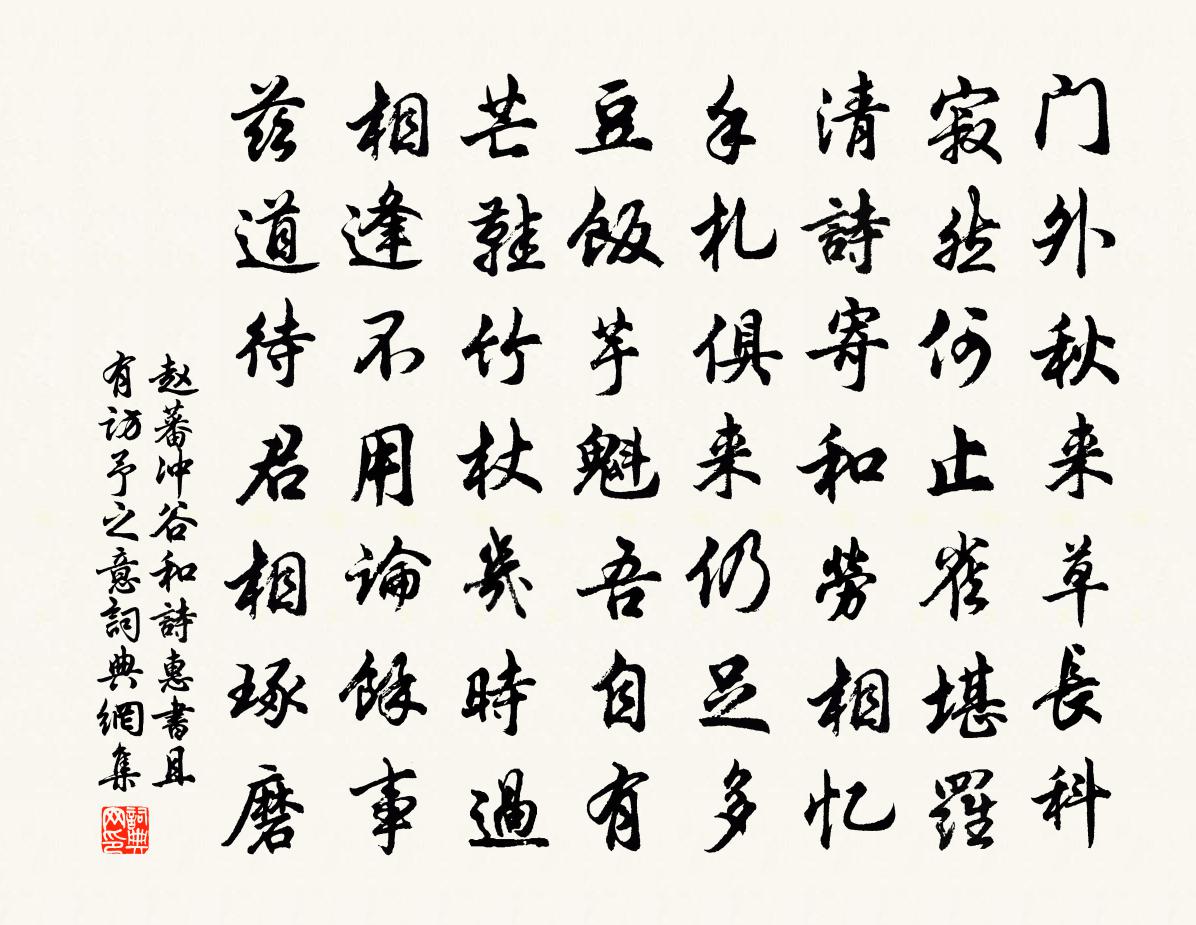 詩詞名句歷史字典書法欣賞書法字典國語詞典說文解字康熙字典古漢語字典標 題 作 者 詩 句 沖谷和詩惠書且有訪予之意作者:趙蕃 朝代:宋代沖谷和詩惠書且有訪予之意原文門外秋來草長科,寂然何止雀堪羅。清詩寄和勞相憶,手札俱來仍足多。豆飯芋魁吾自有,芒鞋竹杖幾時過。相逢不用論餘事,茲道待君相琢磨。詩詞問答問:沖谷和詩惠書且有訪予之意的作者是誰?答:趙蕃問:沖谷和詩惠書且有訪予之意寫於哪個朝代?答:宋代趙蕃沖谷和詩惠書且有訪予之意書法欣賞沖谷和詩惠書且有訪予之意書法作品詩詞推薦詠怪石蘇軾〔宋代〕家有粗險石,植之疏竹軒。人皆喜尋玩,吾獨思棄捐。以其無所用,曉夕空嶄然。碪礎則甲斮,砥硯乃枯頑。於繳從蕭君來茶二首趙蕃〔宋代〕舊傳漢殿三眠柳,燒燭仍聞照海棠。草木困春人可奈,政煩茗椀為禁當。入採石鄭獬〔宋代〕始飲秦淮水,已湔京洛纓。自嫌塵土跡,恐污江山清。太虛淡秋影,霜物尤疏明。擬問白雲公,貰此秋岩耕。次韻何子聞安靜觀李流謙〔宋代〕日壓茅檐醉擁蓑,靜聽寒溜奏雲和。深藏本自身全路,瞪眎元知語不多。紫府地嚴須一到,蒼崖文古要重磨。新宮正月六日作陸游〔宋代〕上天四序分寒燠,以漸相尋不相瀆。今年立春七日耳,暖景溫風何迫促。群蛙怒鳴蚊蚋出,蚍蜉插翅飛滿屋。兒童再和元禮春懷十首黃庭堅〔宋代〕玉壺躭躭浸晴霞,庭有三春接續花。準擬只無難白髮,金爐誰為煮黃芽。姚將軍靖康初以戰敗亡命建炎中下詔求之不可陸游〔宋代〕造物困豪傑,意將使有為。功名未足言,或作出世資。姚公勇冠軍,百戰起西陲。天方覆中原,殆非一木支。脫身偈十三首釋法泰〔宋代〕開口有時非,開口有時是。粗言及細語,皆歸第一義。釋迦老子碗鳴聲,達磨西來屎臭氣。惟有山前水牯牛,身放又送湯國正五十六字杜范〔宋代〕一尊濁酒送君行,慘澹江雲似我情。已是園林堆落葉,更添風雨掃殘英。直存吾道曾何病,公在人心為不平。我久拜越公墓因游定水寺有懷源老唐彥謙〔唐代〕越公已作飛仙去,猶得潭潭好墓田。老樹背風深拓地,野雲依海細分天。青峰曉接鳴鐘寺,玉井秋澄試茗泉。我與崑山兄惠筆乃周壽玉簪樣試用其一已作禿翁猶趙蕃〔宋代〕遂初賦就筆余鋩,贈我蒙探古錦囊。耐久固殊流俗敗,含情渾似故人長。途中覽鏡徐九皋〔唐代〕四海游長倦,百年愁半侵。賴窺明鏡里,時見丈夫心。送仲連梅堯臣〔宋代〕別緒如亂絲,欲理還不可。卻悲嬌女詩,寧戀更效左。是時遠道懷,紛紛上歸舸。憐君正如此,豈任風雨俀。自詠二首蔡沆〔宋代〕青春不可再,白髮兩三莖。得句非詩史,為文學雅成。愁多憑酒散,老至逐人行。開卷無相似,長吁負此生。瑣窗寒張炎〔宋代〕絕響矣。余悼之玉笥山,所謂長歌之哀,過於痛哭。斷碧分山,空簾剩月,故人天外。香留酒殢。蝴蝶一生花里。喜雨陸游〔宋代〕雨聲蕭蕭集庭樹,雨氣森森入窗戶。玉川茆屋久不葺,破漏無復施床處。我於萬事本悠悠,危坐讀書忘百憂。明朝晚舟過臨平吳龍翰〔宋代〕煙鍾舂起夕陽愁,森森臨平春事幽。惟有風蒲愛吟客,岸邊繚亂綰行舟。上樓大參蘇泂〔宋代〕四朝相業舊儀刑,今代衣冠類曉星。青眼更誰憐後裔,白頭空復抱遺經。沖霄有路開籠鶴,槁案無時泣卷螢。吏部禪人並化主寫真求贊釋正覺〔宋代〕默握氂尾,誰撩虎鬚。天水連秋色,魁杓夜轉樞。應兮鑒像,答兮谷呼。森羅萬像,縱橫也俱。官成武主簿作五首王禹偁〔宋代〕釋褐來成武,經春自愧多。晨炊猶接續,時雨未滂沱。拂榻驚巢燕,陳書起蟄娥。惠民無政術,尸祿竟如何。名句推薦巧匠目意中繩,然必先以規矩為度韓非及後人《韓非子·有度》 牧童騎黃牛,歌聲振林樾。袁枚《所見》 時見歸村人,沙行渡頭歇。孟浩然《秋登蘭山寄張五》 發短愁催白,顏衰酒借紅。陳師道《除夜對酒贈少章》 竹里繰絲挑網車,青蟬獨噪日光斜。李賀《南園十三首》 孝悌有聞,人倫之本,德行敦厚,立身之基。魏徵《隋書·帝紀·卷三》 天地合而萬物生,陰陽接而變化起,性偽合而天下治。荀子《荀子·禮論》 為人全無好處,欲邀福慶,從何得來?王永彬《圍爐夜話·第一一四則》 天闕象緯逼,雲臥衣裳冷杜甫《游龍門奉先寺》 日射紗窗風撼扉,香羅拭手春事違。李商隱《日射》