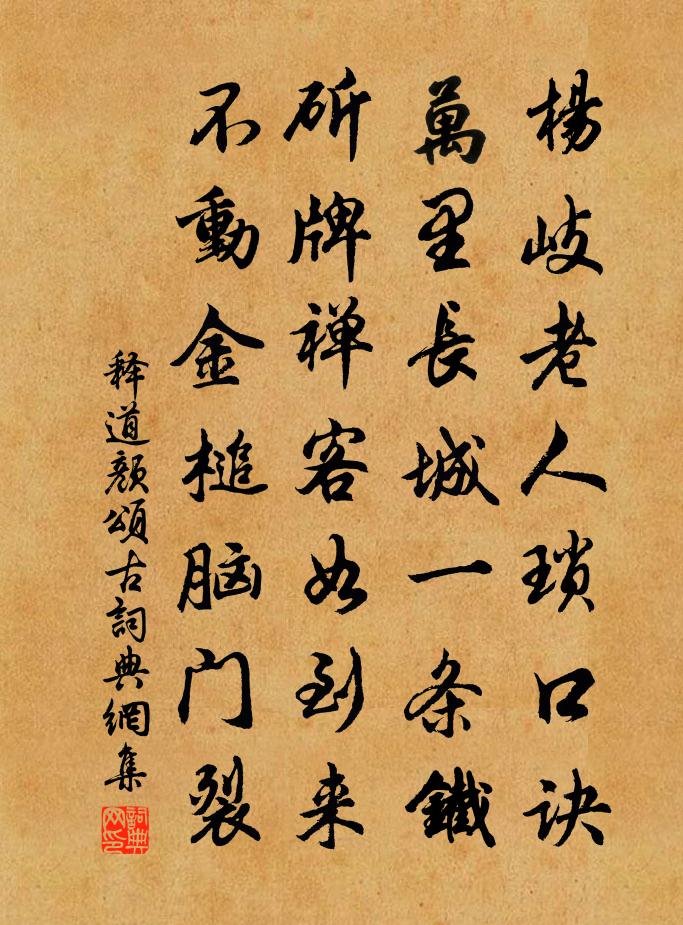 詩詞名句歷史字典書法欣賞書法字典國語詞典說文解字康熙字典古漢語字典標 題 作 者 詩 句 頌古作者:釋道顏 朝代:宋代頌古原文楊岐老人瑣口訣,萬里長城一條鐵。斫牌禪客如到來,不動金槌腦門裂。詩詞問答問:頌古的作者是誰?答:釋道顏問:頌古寫於哪個朝代?答:宋代釋道顏頌古書法欣賞頌古書法作品詩詞推薦賦蓮花峰張栻〔宋代〕玉井峰頭十丈蓮,天寒日暮更清妍。不須重詠洛神賦,便可同賡雲錦篇。讀王摩詰詩愛其散發晚未簪道書行尚把之句因陸游〔宋代〕二十游名場,最號才智下。蹭蹬六十年,亦有茆一把。典衣租黃犢,乘雨耕綠野,西成得一飽,敢計泥沒踝。住久重陽吟五首方回〔宋代〕射蛇戲馬老劉郎,不為乾坤減戰場。三徑寒華空悵望,閒居無酒對重陽。南康愛蓮即事陳宓〔宋代〕東君仙芳菲,首夏即酣寢。巧思蹶然興,老手更諳稔。殷紅間濃綠,濯此萬機錦。桃李謾成蹊,豈解香席枕。最是山信至說平泉別墅草木滋長地轉幽深悵然思歸復此作李德裕〔唐代〕忽聞樵客語,暫慰野人心。幽徑芳蘭密,閒庭秀木深。麇麚來澗底,鳧鵠遍川潯。誰念滄溟上,歸歟起嘆音。題玉澗八景八首王柏〔宋代〕斷嶼數行樹,孤舟一葉橫。前山風雨暗,此岸已天明。富貴曲二首貫休〔唐代〕有金張族,驕奢相續。瓊樹玉堂,雕牆繡轂。紈綺雜雜,鐘鼓合合。美人如白牡丹花,半日只舞得一曲。樂不樂,蝶戀花向子諲〔宋代〕亦次其韻岩桂秋風南埭路。牆外行人,十里香隨步。此是薌林遊戲處。誰知不向根塵住。今日對花非浪語。憶昨明示高台足庵紹印胡寅〔宋代〕萬生紛綸墮迷綱,誰能自拔起情想。隙塵初傍陰色空,燒草又趁春風長。將身出家參佛祖,此病中作膏肓養。足庵題定明大像閻禹錫〔宋代〕造化秘奇勝,洪流繞崇崗。層樓百仞高,下□雲水鄉。空嵌古秀峰,雷霓揮銛鋩。神□□□丁,金仙儼垂裳。懸知寄洛中諸姊元淳〔唐代〕舊國經年別,關河萬里思。題詩憑雁翼,望月想蛾眉。白髮愁偏覺,歸心夢獨知。誰堪離亂處,掩淚向南枝。奉使契丹二十八首其二十二學士院端午帖子二蘇轍〔宋代〕舟楫喧呼招屈處,禽魚鼓舞放生中。百官卻拜梟羹賜,凶去方知舜有功。十二時慢朱雍〔宋代〕粉痕輕、謝池泛玉,波暖琉璃初暖。睹靚芳、塵冥春浦,水曲漪生遙岸。麝氣柔、雲容影淡,正日邊寒淺。閒院寂送周仲章太博之鉅野梅堯臣〔宋代〕仲月霜氣嚴,朝來厚如雪。鴻雁各南飛,羽毛將恐折。征途履以足,侵骨寒於鐵。得罪此為輕,君恩大歡悅。減字木蘭花黃庭堅〔宋代〕蒼崖萬仞。下有奔雷千百陣。自古危哉。誰遣西園漝麽來。猿啼雲杪。破夢一聲巫峽曉。苦喚愁生。不是西園作麽葉路分居思堂葉適〔宋代〕苦說諸梁後,簪纓富遠孫。白袍雖屢捷,黃榜未沾恩。淡沱磨冰硯,蕭條倚帳門。嗟余忝宗末,老病不堪論。紹興享先農十一首佚名〔宋代〕然核維旅,酒人維聲。於再於三,禮則有成。休寧朱肖嚴葺其先大父岐山書為堂藏修之所而汪炎昶〔宋代〕乃翁未讀書功收,大兒收功名□流。三年刻楮豈無用,一鳴驚人姑少留。大伸紆爽數應值,但力根本吾何求。書聲句米都知〔唐代〕知小旗村店酒,微雨野塘花。寄王舍人竹樓李嘉祐〔唐代〕傲吏身閒笑五侯,西江取竹起高樓。南風不用蒲葵扇,紗帽閒眠對水鷗。名句推薦已覺逝川傷別念,復看津樹隱離舟。王勃《秋江送別二首》 十年驅馳海色寒,孤臣於此望宸鑾。戚繼光《望闕台》 岸旁青草長不歇,空中白雪遙旋滅。岑參《熱海行送崔侍御還京》 滿眼韶華,東風慣是吹紅去。幾番煙霧,只有花難護。陳子龍《點絳唇·春日風雨有感》 天涯失鄉路,江外老華發。李白《江南春懷》 最喜小兒亡賴,溪頭臥剝蓮蓬。辛棄疾《清平樂·村居》 疑行無名,疑事無功。司馬遷《史記·七十列傳·商君列傳》 救寒莫如重裘,止謗莫如自修。司馬光《資治通鑑·魏紀五》 孫郎微笑,坐來聲噴霜竹黃庭堅《念奴嬌·斷虹霽雨》 桃李風前多嫵媚,楊柳更溫柔。辛棄疾《武陵春·桃李風前多嫵媚》