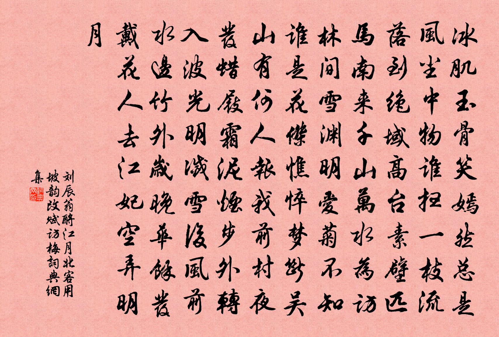 冰肌玉骨,笑嫣然、總是風塵中物。誰掃一枝,流落到、絕域高台素壁。匹馬南來,千山萬水,為訪林間雪。淵明愛菊,不知誰是花傑|<陶詩謂菊為霜下傑>|。