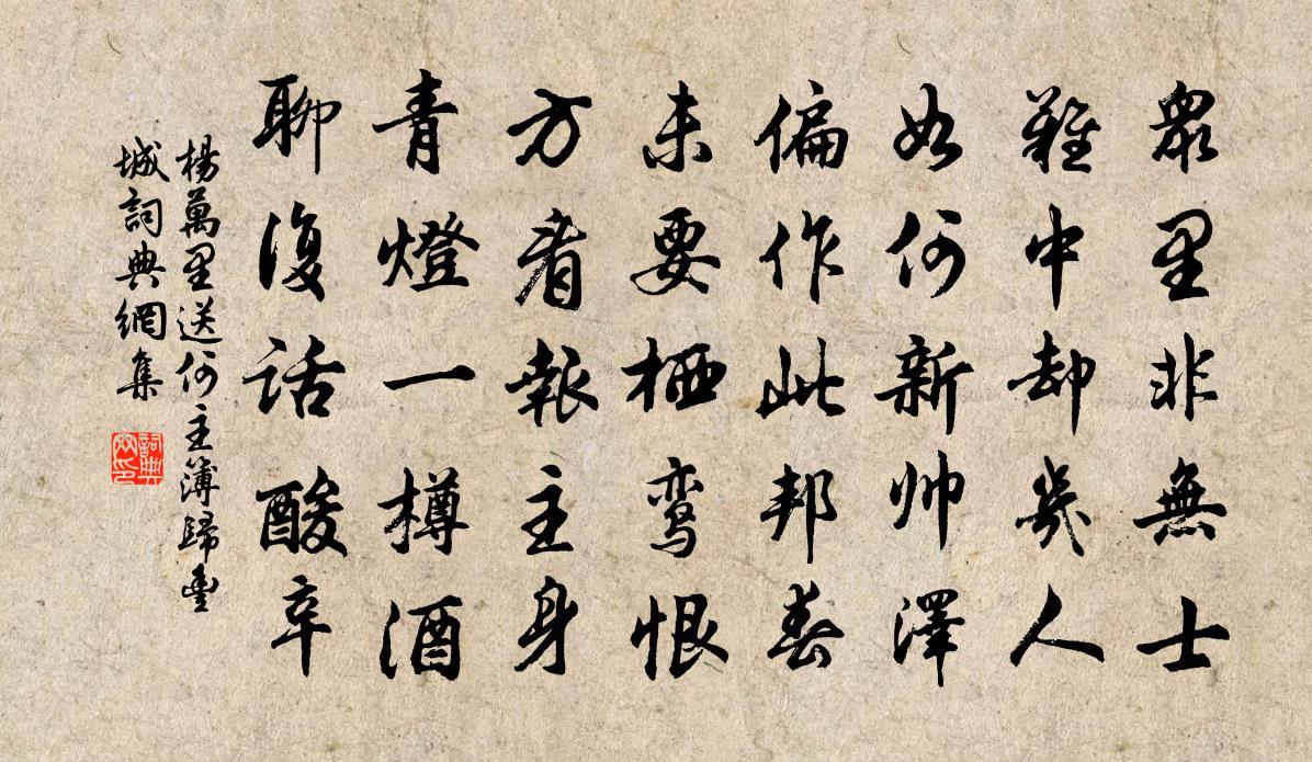 詩詞名句歷史字典書法欣賞書法字典國語詞典說文解字康熙字典古漢語字典標 題 作 者 詩 句 送何主簿歸豐城作者:楊萬里 朝代:宋代送何主簿歸豐城原文眾里非無士,難中卻幾人。如何新帥澤,偏作此邦春?未要棲鸞恨,方看報主身。青燈一樽酒,聊復話酸辛。詩詞問答問:送何主簿歸豐城的作者是誰?答:楊萬里問:送何主簿歸豐城寫於哪個朝代?答:宋代問:楊萬里的名句有哪些?答:楊萬里名句大全楊萬里送何主簿歸豐城書法欣賞送何主簿歸豐城書法作品詩詞推薦一甲子前與濟源李綦儀之游從贛上今其婿謝幼周必大〔宋代〕早向短李客南康,晚識渠家玉潤郎。自笑頭顱並目睫,依然如鼠復如麞。桂林路中作李商隱〔唐代〕地暖無秋色,江晴有暮暉。空餘蟬嘒嘒,猶向客依依。村小犬相護,沙平僧獨歸。欲成西北望,又見鷓鴣飛。送子婿崔真父歸長城劉長卿〔唐代〕送君卮酒不成歡, * 辭家事伯鸞。桃葉宜人誠可詠,柳花如雪若為看。心憐稚齒鳴環去,身愧衰顏對玉難。惆悵康子思二詩有問道之意和其韻郭印〔宋代〕要作通天一大儒,措心寥廓未為迂。神機應變無多子,聖域知歸不遠塗。哮吼定應潛百痹,啁啾終是笑群雛。吾今水調歌頭(壬寅十月二十四日飲少酒徑醉擁案而寢。中夜酒醒次其韻作一篇)呂渭老〔宋代〕心肝皆錦繡,落筆盡雲煙。詩狂酒興,要騎赤鯉上青天。織女回車相勞,指點虛無征路,翻動月明船。舉手謝同輩八月十五夜雨中微有月色戴表元〔宋代〕雨色今夜別,映門白鮮鮮。隃知萬古月,自在最高天。天高無陰晴,月亦無虧圓。中間隔雲霧,頃刻變熊千。惟當陰晦殘春可惜二首宋庠〔宋代〕柳長花歇夏雲初,幽圃尋芳但綠蕪。不分伯勞隨阿母,生憎蛺蝶效當塗。昏沈嶺霧吞斜日,寂寞溪煙壓翠蒲。欲拂送張端明赴召周必大〔宋代〕延英引對寵章新,都下傳觀拜輔臣。沙路緩驅金腰褭,閣間新上玉麒麟。次子有下第韻洪咨夔〔宋代〕東風換骨立成仙,五色終迷自古然。龍變未符今舉讖,鶴來當驗後科緣。情如中酒宜親酒,命合腰錢會有錢。許買游南康棲賢寺陳宓〔宋代〕廬山東南五老峰,青天削出金芙蓉。謫仙此語誰解道,刻畫造化鴻蒙中。我來正值小至後,暖日昭回迎朔風。卻想劉晁之家園六詠露華姜特立〔宋代〕水氣澄鮮暑氣微,一池菡萏映漣漪。精神妙處無人見,只在風清月冷時。卜運算元(嘲二十八兄)陳著〔宋代〕風急雁聲高,露冷蛩吟切。枕剩衾寒不耐煩,長是傷離別。望得眼兒穿,巴得心頭熱。且喜重陽節又來, * 花先送杓孫隨侍上虞樓鑰〔宋代〕阿斗生來十五年,未曾一日去翁前。聞詩勿廢家庭問,習吏仍求城旦篇。婚宦有涯真是幸,巾箱所蓄要相傳。榮罍龜山辯才師蘇軾〔宋代〕此生念念浮雲改,寄語長淮今好在。故人宴坐虹梁南,新河巧出龜山背。木魚呼客振林莽,鐵鳳橫空飛彩繪。忽驚次石湖書扇韻姜夔〔宋代〕橋西一水曲通村,岸閣浮萍綠有痕。家住石湖人不到,藕花多處別開門。雪樓程御史次方山房韻見寄用韻答賦三首何夢桂〔宋代〕青樓有蛾眉,翳袖渺獨處。日暮賦摽梅,愧我求彼士。誰家操孤鸞,感此中夜起。明河落天西,玉繩低欲輊。結言歸國謠·雙臉溫庭筠〔唐代〕雙臉,小鳳戰蓖金颭艷。舞衣無力風斂,藕絲秋色染。錦帳繡帷斜掩,露珠清曉簟,粉心黃蕊花靨,黛眉山兩點。落梅胡仲弓〔宋代〕謝娥三弄笛,昏恨五更風。樹老余香少,花殘瘦影空。深堆和靖墓,淺點壽陽宮。結果重來此,方知造化工。西軒雨中期象之夜話韓維〔宋代〕積雨空堂暮,清宵獨掩門。陳編徒自封,幽興欲何言。碧草生牆角,丹花發竹根。聊持靜者轍,一與道人論。好事近趙長卿〔宋代〕江上一江樓,樓上遠山橫翠。還更腰金騎鶴,引竹西歌吹。壽君春酒遣雙壺,滿引見深意。肯向龜荷香里,喚儂來名句推薦城門失火,殃及池魚。佚名《增廣賢文·上集》 牛困人飢日已高,市南門外泥中歇。白居易《賣炭翁》 寂寂聞猿愁,行行見雲收李白《尋高鳳石門山中元丹丘》 觸簾風送景陽鍾,鴛被繡花重。顧敻《虞美人·觸簾風送景陽鍾》 山雪河冰野蕭瑟,青是烽煙白人骨。杜甫《悲青坂》 好雨知時節,當春乃發生。杜甫《春夜喜雨》 人學始知道,不學非自然。孟郊《勸學》 今朝此為別,何處還相遇。韋應物《初發揚子寄元大校書》 余凡事喜獨出己見,不屑隨人是非。沈復《浮生六記·浪遊記快》 孤客傷逝湍,徒旅苦奔峭。謝靈運《七里瀨》