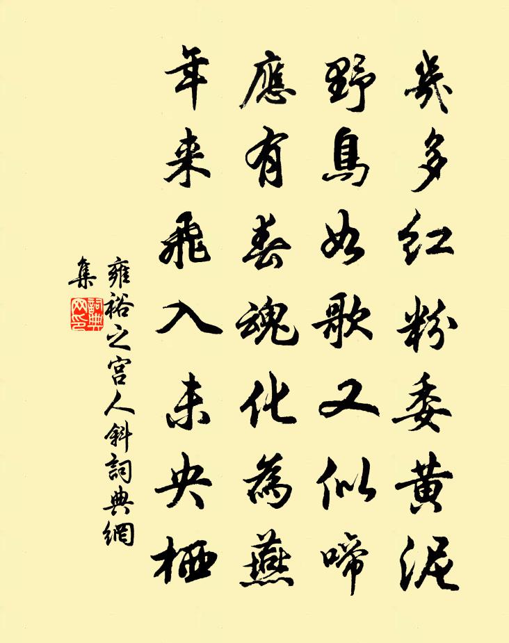 詩詞名句歷史字典書法欣賞書法字典國語詞典說文解字康熙字典古漢語字典標 題 作 者 詩 句 宮人斜作者:雍裕之 朝代:唐代宮人斜原文幾多紅粉委黃泥,野鳥如歌又似啼。應有春魂化為燕,年來飛入未央棲。詩詞問答問:宮人斜的作者是誰?答:雍裕之問:宮人斜寫於哪個朝代?答:唐代問:宮人斜是什麼體裁?答:七絕雍裕之宮人斜書法欣賞宮人斜書法作品注釋全唐詩:卷471-29詩詞推薦與胡經仲、陳朋元游照山堂,梅數百株盛開范成大〔宋代〕九陌緇塵滿客襟,錢塘門外有園林。胡床住處梅無限,酒旆垂邊柳未深。晴日暖風千里目,殘山剩水一人心。元方和學士秋懷一十五首李彌遜〔宋代〕漫漫長山去不分,欲於何處望閶門。寄聲蓮社還相憶,幾日歸鴻下故園。好事近(三衢買舟)卓田〔宋代〕奏賦謁金門,行盡雲山無數。尚有江天一半,買扁舟東去。波神眼底識英雄,閣住半空雨。喚起一帆風力,去青天彭澤汪遵〔唐代〕鶴愛孤松雲愛山,宦情微祿免相關。栽成五柳吟歸去,漉酒巾邊伴菊閒。杏花王禹偁〔宋代〕桃紅李白莫爭春,素態妖姿兩未勻。日暮牆頭試回首,不施朱粉是東鄰。廣陵城(一作孟遲詩)趙嘏〔唐代〕紅映高台綠繞城,城邊春草傍牆生。隋家不向此中盡,汴水應無東去聲。曉入南山孟浩然〔唐代〕瘴氣曉氛氳,南山復水雲。鯤飛今始見,鳥墜舊來聞。地接長沙近,江從汨渚分。賈生曾吊屈,余亦痛斯文。贈陳評事王建〔唐代〕識君雖向歌鐘會,說事不離雲水間。春夜酒醒長起坐,燈前一紙洞庭山。即事二首裘萬頃〔宋代〕春時耕種夏時耘,七月農夫始食新。此去田家常要雨,雨多元自不妨人。龍井十題寂室釋元淨〔宋代〕心寂寂自絕,此意為君說。寒雲嵌空亭,獨有月照雪。九絕為亞卿作韓駒〔宋代〕君住江邊起畫樓,妾居海角送潮頭。潮中有妾相思淚,流到樓前更不流。戎州汪元量〔宋代〕錦樹高枝種萬窠,歲收百斛足生涯。八錢買得一斤重,魯直詩 * 地夸。再用前韻一首王阮〔宋代〕已無功業上凌煙,且泛扁舟逐計然。自喜茲游勝平日,不知今夕是何年。橫空蝃蝀聊欹枕,滿袖嬋娟永共船。同社送周介之同年赴德華宰陳傅良〔宋代〕民社須吾浣,江湖足此情。不堪秋暑近,欲趁莫潮平。拙宦成華發,憂時自短檠。君看廬阜石,千載尚垂名。送林子中知成都孔武仲〔宋代〕鞍馬覆山黑,旌旗垂野紅。問遠誰當行,太守臨蜀中。太守時之豪,學博文章工。人事未稱遂,崎嶇已巴東。公年採桑子(雨後至玉壺軒)周紫芝〔宋代〕跳珠雨罷風初靜,闌檻憑虛。絳闕清都。只在仙人碧玉壺。九原喚起王摩詰,畫作新圖。十城芙蕖。乞與知章老鑒坐進堂曾幾〔宋代〕茅宇淨掃地,竹爐深炷香。一枝藤倚壁,六尺簟敷床。門掩人聲寂,簾垂晝景長。跏趺便終夕,端不負茲堂。已酉上元詩同日立春胡仲弓〔宋代〕又是京華見上元,一番燈火奪春寒。花蛾巧剪禁風撲,彩燕新裁帶月看。客里無家愁對酒,吟邊索句夜憑欄。寄言首尾吟邵雍〔宋代〕堯夫非是愛吟詩,詩是堯夫代記時。官職固難稱太史,文章卻欲學宣尼。能歸豈謝陶元亮,善聽何慚鍾子期。德若劉曲龍潭元好問〔金代〕層冰積浩蕩,陵谷低吞吐。窈窕轉幽壑,突兀開淨宇。回頭山水縣,亦復墮塵土。孤雲鐵梁北,宇宙一仰俯。風景名句推薦反古者未必可非,循禮者未足多是也。商鞅《商君書·更法》 大仇必去,小人勿輕,禍不可伏。來俊臣《羅織經·固榮卷第六》 蓬生麻中,不扶而直;白沙在涅,與之俱黑。荀子《荀子·勸學》 大堤欲上誰相伴,馬踏春泥半是花。竇鞏《襄陽寒食寄宇文籍》 回雁峰前路,煙樹正蒼蒼葛長庚《水調歌頭·江上春山遠》 灞原風雨定,晚見雁行頻。馬戴《灞上秋居》 垂楊拂綠水,搖艷東風年。李白《折楊柳》 寒雨連江夜入吳,平明送客楚山孤。王昌齡《芙蓉樓送辛漸》 夜深斜搭鞦韆索,樓閣朦朧煙雨中。韓偓《夜深 / 寒食夜》 不怨天,不尤人。孔子弟子《論語·憲問篇》