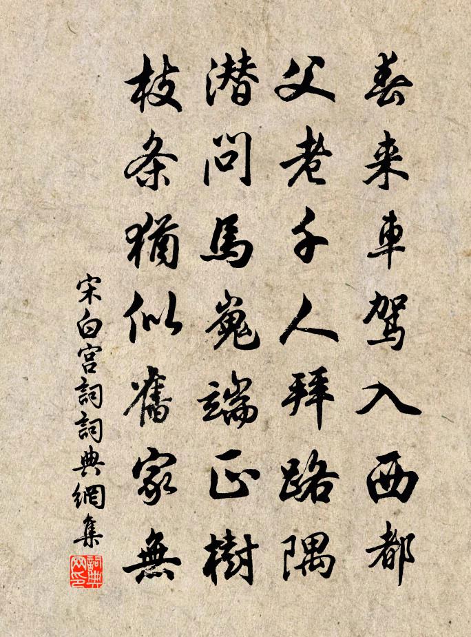 詩詞名句歷史字典書法欣賞書法字典國語詞典說文解字康熙字典古漢語字典標 題 作 者 詩 句 宮詞作者:宋白 朝代:宋代宮詞原文春來車駕入西都,父老千人拜路隅。潛問馬嵬端正樹,枝條猶似舊家無。詩詞問答問:宮詞的作者是誰?答:宋白問:宮詞寫於哪個朝代?答:宋代宋白宮詞書法欣賞宮詞書法作品詩詞推薦南溪太息一首蘇籀〔宋代〕東坡曾賞南溪南,他日流芳好事孫。寒祲稜稜裹崧岱,憂端憤憤塞乾坤。赤囊政爾勞邊吏,白羽多應落酒樽。太息蟬丁謂〔宋代〕齊女幽憂後,幽時興詠中。曉寒初飲露,夕燥正含風。翼若裁綃薄,心如鼓橐空。貂冠如見用,清白勵王公。會仙石王珪〔唐代〕奉使群材笑拍肩,玉漿春酒已酡然。當時曾舐淮南鼎,亦恐茲山自有仙。贈林相士李曾伯〔宋代〕賣卜長安作漫遊,裹糧千里為報謀。時危貴得班超相,命薄那能李廣侯。術挾瑟竽雖易售,話逢枘鑿亦難投。江頭獻金陵牧薛大夫白馬詩王曾〔宋代〕白馬披絲練一團,今朝被絆欲行難。雪中放去唯留跡,月下牽來祇見鞍。賂北長鳴天外遠,臨風斜墜耳邊寒。自知輕薄怨李鹹用〔唐代〕花驄躞蹀游龍驕,連連寶節揮長鞘。鳳雛麟子皆至交,春風相逐垂楊橋。捻笙軟玉開素苞,畫樓閃閃紅裾搖。碧蹄答韓毅伯五首王炎〔宋代〕三書上詩宰,我常疑退之。士窮見素守,躁求亦何為。羅客聞此語,為我一解頤。歲晚歸未得,且過江之西。未到魏知元有贈仍索詩此言別二首陳造〔宋代〕作詩求工今則然,古人培本深其源。周鴉莊騷略未究,浪摹月露綴語言。知君胸中藏武庫,平生遊戲皆好句。老夫寒食日湖上顧逢〔宋代〕寒食家家掃紙灰,道傍相吊總悲哀。湖邊多少詩人墓,不見兒孫酹酒來。和禮滅翁感錢氏舊事洪咨夔〔宋代〕民不知兵物自華,表忠消得老碑夸。虎符龍節故王國,鳳舞鸞飛今帝家。遺廟斷垣低槲葉,荒村舊井濕桐花。馮夷次韻鄧善之書懷七首方回〔宋代〕今代予元侯,書窗不外求。寡言良有味,節用絕無愁。真是溫如玉,兼能爽似秋。鑾坡宜趣召,夜直結鄰樓。避地雲山全父弟詩寄梅花陽枋〔宋代〕骨中香徹骨中清,著雨問花不作聲。一氣本同形色異,人花清傑兩忘情。樂府雜擬黃彥平〔宋代〕石戴古車轍,人生來往勤。雙輪不生角,越絕會通秦。坐令丘壑姿,化作京洛塵。君看釣魚磯,鼻口羅江津。浮走殘月宋祁〔宋代〕陰光隨落宿,有意待朝陽。暈缺灰餘影,潮平鷺息狂。殘兵驕子國,隱語大刀郎。此夜方諸淚,寧能減數行。夜直懷永和兄弟周必大〔宋代〕玉堂清冷夜初長,風雨蕭蕭憶對床。徼道傳呼鐘鼓密,夢魂那得到君傍。錫杖歌,送明楚上人歸佛川(一作權德輿詩)皇甫曾〔唐代〕上人遠自西天至,頭陀行遍南朝寺。口翻貝葉古字經,手持金策聲泠泠。護法護身惟振錫,石瀨雲溪深寂寂。乍來飲中戴復古〔宋代〕布衣不換錦宮袍,刺骨清寒氣自豪。腹有別腸能貯酒,天生左手慣持螯。蠅隨驥尾宜千里,鶴在雞群亦九皋。賢似偈頌一百零四首釋紹曇〔宋代〕小春才過,冬至相催。光陰駒過隙,須鬢雪成堆。松根石上,槁木寒灰。凍膝擁深霜樹葉,禪心清點野橋梅。喚起如夢令 輟耕遜字敏甫袁介〔元代〕今夜盛排筵宴。準擬尋芳一遍。春去已多時,問甚紅深紅淺。不見。不見。還你一方白絹。秋日感事釋智圓〔宋代〕滿眼皆相識,論心自不同。閒門扃夕照,敗葉落西風。往事全成夢,浮生漸覺空。搘頤獨無語,四壁響秋蟲。名句推薦麥收上場絹在軸,的知輸得官家足。王建《田家行》 把酒看花想諸弟,杜陵寒食草青青。韋應物《寒食寄京師諸弟》 梅子青,梅子黃,菜肥麥熟養蠶忙。祝允明《首夏山中行吟》 前哲以善人爲寶,不以珠玉爲寶李大師、李延壽《南史·列傳·卷十三》 柳葉隨歌皺,梨花與淚傾。黃庭堅《南歌子·槐綠低窗暗》 世業事黃老,妙年孤隱淪宋之問《始安秋日》 篇之彪炳,章無疵也;章之明靡,句無玷也;句之清英,字不妄也。劉勰《文心雕龍·章句》 君子敬其在己者,而不慕其在天者,是以日進也。荀子《荀子·天論》 書劍時將晚,丘園日已暮。孟浩然《田園作》 藍橋春雪君歸日,秦嶺秋風我去時。白居易《藍橋驛見元九詩》