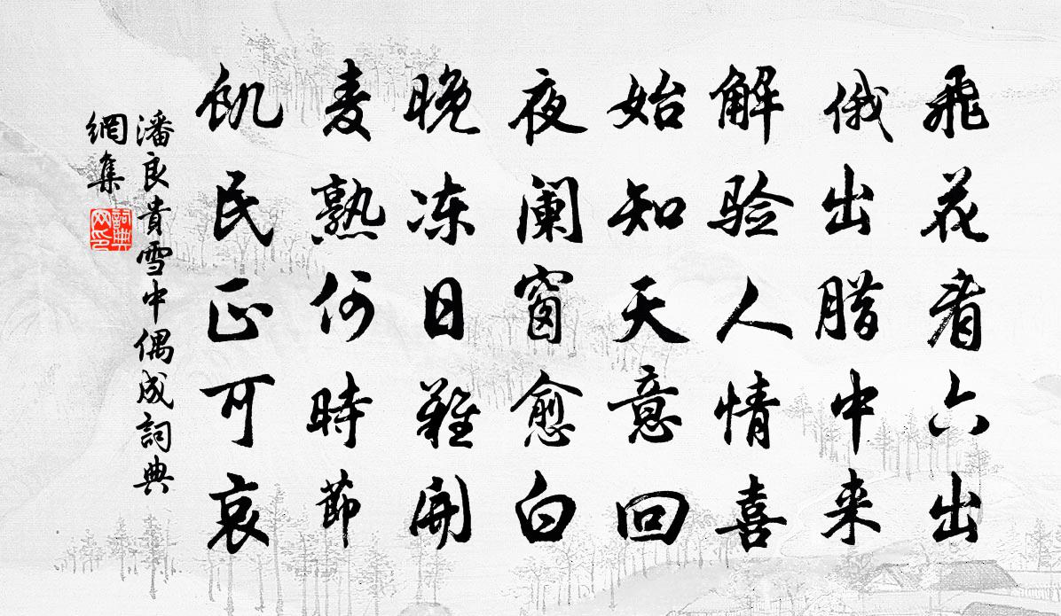 詩詞名句歷史字典書法欣賞書法字典國語詞典說文解字康熙字典古漢語字典標 題 作 者 詩 句 雪中偶成作者:潘良貴 朝代:宋代雪中偶成原文飛花看六出,俄出臘中來。解驗人情喜,始知天意回。夜闌窗愈白,晚凍日難開。麥熟何時節,饑民正可哀。詩詞問答問:雪中偶成的作者是誰?答:潘良貴問:雪中偶成寫於哪個朝代?答:宋代潘良貴雪中偶成書法欣賞雪中偶成書法作品詩詞推薦寄月湖先生兼簡渭叟鄧深〔宋代〕山莊杖屢飽相從,每日須拚十日中。鼎足三人同宿留,瓮頭一盞奉從容。別來不隔千山月,舊賞難乘兩腋風。更想客舍黎廷瑞〔宋代〕門前蒼耳與人齊,屋後青蛙作鬼啼。風雨瀟瀟天正黑,披衣不寐聽鳴雞。兩晉徐夤〔唐代〕三世深謀啟帝基,可憐孀婦與孤兒。罪歸成濟皇天恨,戈犯明君萬古悲。巴蜀削平輕似紙,勾吳吞卻美如飴。誰知雜吟 其二王冕〔元代〕出門好山色,況值風日暄。依依楊柳莊,鬱郁桑柘村。行游蹊路曲,如在故林園。白煙橫遠嶼,紅花粲晴原。人生湖湄閒適二首孫銳〔宋代〕推窗笑指浣溪紗,點點飛鷗拍浪沙。儂自有心禽解語,拋磚水激落天涯。留題閣皂觀伊用昌〔唐代〕花洞門前吠似雷,險聲流斷俗塵埃。雨噴山腳毒龍起,月照松梢孤鶴回。蘿幕秋高添碧翠,畫簾時卷到樓台。兩壇風流子康與之〔宋代〕結客少年場。繁華夢,當日賞風光。紅燈九街,買移花市,畫樓十里,特地梅妝。醉魂盪,龍跳撝萬字,鯨飲吸三點絳唇石孝友〔宋代〕著意栽銀,砌成葉葉蓮花舫。醉霞搖盪。恰似凌波樣。自笑平生,鯨吸洪波量。孤心賞。不如深幌。一搦酬千想。九日奉陪侍中宴白樓盧綸〔唐代〕露白菊氛氳,西樓盛襲文。玉筵秋令節,金鉞漢元勛。說劍風生座,抽琴鶴繞雲。謏儒無以答,願得備前軍。次韻曾存之宜舍種竹張耒〔宋代〕曾郎風塵表,不似宰官身。吏舍數竿竹,鑿池水粼粼。此君不可疏,亦復未易親。虛心澹相授,頗似南郭鄰。我知乾元節群臣祝壽小人無位以詩繼之李覯〔宋代〕帝命當敷佑,民生有厥初。千秋唐節日,萬國禹朝車。韶美笙鏞外,需亨飲食餘。神仙似姑射,夢想即華胥。嘉會冬至寓建陽作胡一桂〔宋代〕繡日添漢宮,書雲紀晉觀。山家獨奚為,剛腸占易彖。幽人意欣然,起坐視晴漢。大化回初陽,漫漫今已旦。川泳送李著作王禹偁〔宋代〕芸閣新銜捧詔歸,歷陽湖畔拜庭闈。已聞愛子披朱紱,猶學嬰兒◇◇彩衣。飯饋海陵紅稻軟,鱠擎淮水白魚肥。吾翟簿示似中秋高作命意著語殆與商素爭清讀至史彌寧〔宋代〕老蟾掛青冥。寒影墮秋渚。流聲倒楚澤,千古相深與。山居寓興鄒輗〔宋代〕花陰不正月將西,欲到溪邊步懶移。坐對前山無一語,此心惟有古人知。前漢門高祖周曇〔唐代〕愛子從烹報主時,安知強啜不含悲。太公懸命臨刀幾,忍取杯羹欲為誰。游橘洲齊己〔唐代〕春日上芳洲,經春蘭杜幽。此時尋橘岸,昨日在城樓。鷺立青楓杪,沙沈白浪頭。漁家好生計,檐底系扁舟。夏日郊園李覯〔宋代〕三徑是生涯,朋游日已賒。野情饒皓鶴,寒氣入甘瓜。移竹調風韻,疏泉浴月華。塵埃應附勢,不肯到貧家。和筆紹奕陳宓〔宋代〕將軍承天寵,建此油幢碧。喑嗚指顧間,匈奴期伏鑕。堂堂帷幄算,暨暨貔貅力。填填畫鼓鳴,爍爍紅旗植。風高軍山張顯〔宋代〕亂石如群羊,合沓千里奔。軍山幾當前,盤踞作虎蹲。巨鎮壓坤維,層巔白雲屯。下瞰大溪流,三尺清不渾。舟人名句推薦何當一夕金風起,為我掃除天下熱。施耐庵《水滸傳·第十六回》 誠知此恨人人有,貧賤夫妻百事哀。元稹《遣悲懷三首·其二》 路出大梁城,關河開曉晴。謝榛《渡黃河》 晴雲滿戶團傾蓋,秋水浮階溜決渠。杜甫《柏學士茅屋》 白草黃沙。月照孤村三兩家。蔣氏女《減字木蘭花·題雄州驛》 知臣莫若於君,知子莫若於父。魏徵《隋書·帝紀·卷二》 情共天涯秋黯,朱橋鎖深巷。吳文英《解蹀躞·醉雲又兼醒雨》 少小離家老大回,鄉音無改鬢毛衰。賀知章《回鄉偶書二首·其一》 遙知不是雪,為有暗香來。王安石《梅花》 芙蓉生在秋江上,不向東風怨未開。高蟾《下第後上永崇高侍郎》
