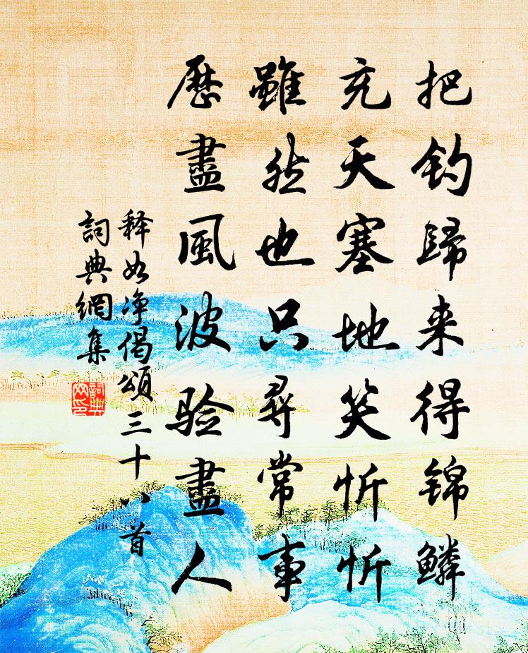 詩詞名句歷史字典書法欣賞書法字典國語詞典說文解字康熙字典古漢語字典標 題 作 者 詩 句 偈頌三十八首作者:釋如淨 朝代:宋代偈頌三十八首原文把釣歸來得錦鱗,充天塞地笑忻忻。雖然也只尋常事,歷盡風波驗盡人。詩詞問答問:偈頌三十八首的作者是誰?答:釋如淨問:偈頌三十八首寫於哪個朝代?答:宋代釋如淨偈頌三十八首書法欣賞偈頌三十八首書法作品詩詞推薦二樂陸游〔宋代〕游山恨不遠,讀書恨不博。天下多名山,何處無芒屩。束書飽蠹魚,於汝寧不怍?日月如過燒,老病將何若?眼猶賦得枕上聞雁賀鑄〔宋代〕朔吹飄驚雁,寒聲徹枕前。遠違沙漠雪,不下汶陽田。客夢悲中夜,歸期隔故年。莓苔與菰米,何處是湘天。鹿鳴宴詩葉適〔宋代〕鹿鳴著周雅,取士各惟時。永嘉近千載,文物盛於期。賢侯奉明指,薦棘鎖秋扉。希寶難聚識,獨鑒防群嗤。誠雲送李傳秀才歸宣州姚合〔唐代〕謝守青山宅,山孤宅亦平。池塘無復見,春草野中生。常日登樓望,今朝送客行。殷勤拂石壁,為我一書名。司馬君實遺甘草杖梅堯臣〔宋代〕美草將為杖,孤生馬嶺危。難從荷筱叟,寧入化龍陂。去與秦人采,來扶楚客衰。藥中稱國老,我懶豈能醫。餞永豐易丞赴庾檄徐元傑〔宋代〕世道圓通更直方,松陰庭院亦聲光。眼明英簜公題品,身入芙蓉婉贊襄。田裡嘆愁從此達,公私幽枉待君揚。更煩久齋時為南康趙司戶作項安世〔宋代〕歲寒始見松將柳,道遠方分驥若駑。鑿井為山新意氣,斷乾穿石老工夫。重湖水作葡萄漲,五老雲成錦繡鋪。萬古定海甲寅口號七首陳造〔宋代〕父子分頭上海船,今年海熟勝常年。官中可但追呼少,不質田輸折米錢。玉泉寺李復〔宋代〕道人東立海上山,錫飛西落大江北。雙屨還乘海去起,西過當陽駐山曲。倚岩引錫神泉涌,一道明虹出幽谷。兀然謝新胥口監生趙立之程公許〔宋代〕魯壁嶧碑遠莫睹,艱哉河流訊鞀鼓。披荒摸搭不厭多,繙閱端能助稽古。向來四壁風雨秋,誰遣彯纓群玉府。終年忠州項安世〔宋代〕耕鑿林廬滿四山,人家境象極寬閒。不妨五馬雲根住,小市孤城自掩關。句諶祜〔宋代〕不知元佑今何日,慨想儋翁過此時。偈二首釋道英〔宋代〕每把葫蘆椀放欹,從教天下浪猜疑。秋風擺落園林後,始信寒松格不卑。和仲固春日村居即事十二絕胡寅〔宋代〕有興相尋即扣門,不須招致簡書繁。試從大雅歌鶯谷,未羨詞人侈兔園。詠史上商鞅陳普〔宋代〕此天此地此經文,學者何嘗溺所聞。盡道李斯焚典籍,不知吹火是商君。奉試詔用拓拔思恭為京北收復都統一作聞詔作李琪〔唐代〕飛騎經巴棧,鴻恩及夏台。將從天上去,人自日邊來。此處金門遠,何時玉輦回。早平關右賊,莫待詔書催。三謠朱藤謠白居易〔唐代〕朱藤朱藤,溫如紅玉,直如朱繩。自我得爾以為杖,大有裨於股肱。前年左選,東南萬里。交遊別我於國門,親友秦州雜詩二十首·其九杜甫〔唐代〕今日明人眼,臨池好驛亭。叢篁低地碧,高柳半天青。稠疊多幽事,喧呼閱使星。老夫如有此,不異在郊坰。句韓常侍〔唐代〕情多不似家山水,夜夜聲聲旁枕流。頌古二十九首釋師體〔宋代〕夜叉頭,菩薩面。鬼搗谷,佛跳牆。同門共戶不相識,邁古超今地寸長。燈心戳破石人腳,扁鵲盧醫爭主張。名句推薦帝鄉三千里,杳在碧雲間。李白《登敬亭北二小山余時送客逢崔侍御並登此地》 望千門如晝,嬉笑遊冶。周邦彥《解語花·上元》 冬日之不濫,非愛冰也;夏日之不煬,非愛火也,為不適於身便於體也。管仲《管子·禁藏》 對菊難逢元亮酒,登樓愧乏仲宣才。秋瑾《九日感賦》 樂易者常壽長,憂險者常夭折。荀子《荀子·榮辱》 驛路侵斜月,溪橋度曉霜。呂本中《南歌子·驛路侵斜月》 黎明即起,灑掃庭除,要內外整潔;既昏便息,關鎖門戶,必親自檢點。朱柏廬《朱子家訓·全文》 天下有道則見,無道則隱。孔子弟子《論語·泰伯篇》 白毛浮綠水,紅掌撥清波駱賓王《詠鵝》 心生而言立,言立而文明,自然之道也劉勰《文心雕龍·原道》
