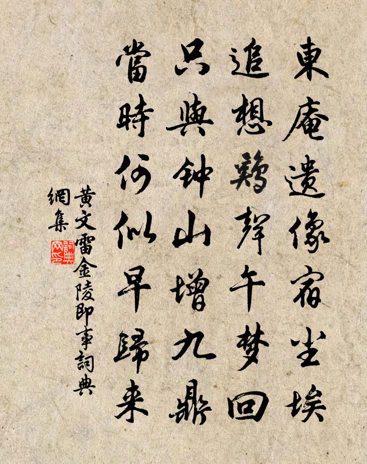 詩詞名句歷史字典書法欣賞書法字典國語詞典說文解字康熙字典古漢語字典標 題 作 者 詩 句 金陵即事作者:黃文雷 朝代:宋代金陵即事原文東庵遺像宿塵埃,追想雞聲午夢回。只與鐘山增九鼎,當時何似早歸來。詩詞問答問:金陵即事的作者是誰?答:黃文雷問:金陵即事寫於哪個朝代?答:宋代黃文雷金陵即事書法欣賞金陵即事書法作品詩詞推薦東園池上書所見五首宋庠〔宋代〕春餘池圃似郊村,吏散斜暉半府門。燕雀不知爭底事,啁啾言語到黃昏。黃池大水歌王奕〔宋代〕玉斗山人歸自魯,迂途攜酒酬謫仙。丹陽滯留十日雨,坐見平陸成長川。不沖不激不澎湃,漫高漫長漫囂塵。黃地小雪前三日鍾冠之約余侍老人行山舟發後洪入洪咨夔〔宋代〕系舡官柳根,闤闠得深密。日落遠水明,雲收好山出。天開有聲畫,人立無價璧。酒行不須多,鷺下孤蒲夕。嘉禾百詠跨塘橋張堯同〔宋代〕路接張涇近,塘連谷水長。一聲清鶴唳,片月在滄浪。句南呂薄媚舞洪适〔宋代〕可倩,本事願聞。答踢軟塵之陌,傾一見於月膚;會采萍之洲,迷千嬌於雨夢。且蛾眉有伐性之戒,而狐媚無傷人悼王濟川處士王冕〔元代〕上卿方駕紫雲車,便寄江南處士詩。白髮忽辭明鏡去,青山相對好樓居。床頭筇竹生鱗甲,窗下殘篇撲蠹魚。莫向緣識宋太宗〔宋代〕救物功深好自持,知之修煉善心為。神仙豈謂人間惜,自是迷流識見卑。訪韓仲止不遇題澗上趙師秀〔宋代〕隔澗竹扉深,蒼童引客尋。雖然乖昭語,猶得見園林。野蔓時妨步,山蟬亦好吟。石根泉數斗,清冷應人心。代書回寄楊伯虎張鎡〔宋代〕曾舍匆匆別,飛花雨過春。水村居自樂,城市懶尤真。載酒青油舫,傳書白錦鱗。訪君須及早,非是久閒人。別擇公蘇軾〔宋代〕黍離不復閔宗周,何暇雷塘吊一丘。若問西來師祖意,竹西歌吹是揚州。送義興元少府李端〔唐代〕逢君惠連第,初命便光輝。已得群公祖,終妨太傅譏。路長人反顧,草斷燕回飛。本是江南客,還同衣錦歸。題李公麟山莊圖其十五觀音岩蘇轍〔宋代〕倚崖開翠屏,臨潭置苔石。有所獨無人,君心得未得。臨江仙(和徐守聖可)王質〔宋代〕縹緲青霄雲一握,太清群玉光中。鈞天聲里拂香風。紫皇低接手,穩步上層空。雀扇徐開鸞影轉,日高舞動蛟龍。【中呂】朝天子_箏手愛卿丹張可久〔元代〕箏手愛卿丹山鳳鳴,黃雲雁影,笙歌罷簾幃靜。纖纖香玉扣紅冰,一曲伊川令。院體瓊瓊,秋水盈盈,不由人不愛長沙郡丞丁君輓詞張栻〔宋代〕簾吏今尤重,朝家詔舉頻。方看千里駕,忽盡百年身。職業憂勞甚,游從笑語真。空令行路嘆,沒後見清貧。中秋集鮑樓作徐璣〔宋代〕秋在湖樓正可過,扁舟窈窕逐菱歌。淡雲遮月連天白,遠水生涼入夜多。已是高人難聚會,矧逢佳節共吟喔。明朝送郢州郎使君韓翃〔唐代〕千人插羽迎,知是范宣城。暮雪楚山冷,春江漢水清。紅鮮供客飯,翠竹引舟行。一別何時見,相思芳草生。送內弟汪強仲赴台州稅官樓鑰〔宋代〕雕鞍去去不容攀,柳下門牆輟往還。可但征商私龍斷,不妨拄頰看巾山。右軍墨妙惟修禊,太傅才高亦抱關。只尺絕句三首蘇軾〔宋代〕此身分付一 * ,靜對蕭蕭竹數竿。偶為老僧煎茗粥,自攜修綆汲清泉。寄徐濟進士(一本題下無進士二字)羅隱〔唐代〕往年疏懶共江湖,月滿花香記得無。霜壓楚蓮秋後折,雨催蠻酒夜深酤。紅塵偶別迷前事,丹桂相傾愧後徒。出得名句推薦未收天子河湟地,不擬回頭望故鄉。令狐楚《少年行四首·其三》 竹樹無聲或有聲,霏霏漠漠散還凝。杜荀鶴《春日山中對雪有作》 狂風吹我心,西掛鹹陽樹。李白《金鄉送韋八之西京》 蓮渚收香,蘭皋浮爽,涼思頓欺班扇。王月山《齊天樂·夜來疏雨鳴金井》 昔日橫波目,今成流淚泉。李白《長相思三首·其二》 柳柔搖不定,草短綠應難。張惠言《風流子·出關見桃花》 重簾不捲留香久,古硯微凹聚墨多。曹雪芹《紅樓夢·第四十八回》 少小離家老大回,鄉音無改鬢毛衰。賀知章《回鄉偶書二首·其一》 燕雁無心,太湖西畔隨雲去。姜夔《點絳唇·丁未冬過吳松作》 魚網之設,鴻則罹其中;螳螂之貪,雀又乘其後。洪應明《菜根譚·概論》