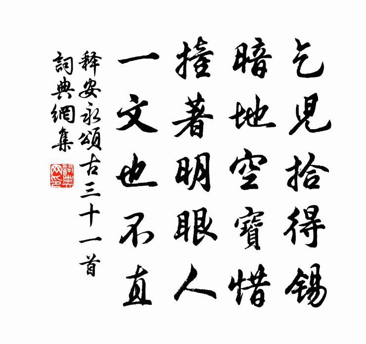 詩詞名句歷史字典書法欣賞書法字典國語詞典說文解字康熙字典古漢語字典標 題 作 者 詩 句 頌古三十一首作者:釋安永 朝代:宋代頌古三十一首原文乞兒拾得錫,暗地空寶惜。撞著明眼人,一文也不直。詩詞問答問:頌古三十一首的作者是誰?答:釋安永問:頌古三十一首寫於哪個朝代?答:宋代釋安永頌古三十一首書法欣賞頌古三十一首書法作品詩詞推薦歲暮獨酌感懷陸游〔宋代〕明時頻忝武夷僊,俯仰人間只自憐。總角回思如昨日,掛冠過限已三年。病多晴日思行藥,睡少清宵學坐禪。更嘆次韻斯遠聞蕃移官岳州見寄趙蕃〔宋代〕西南之役凡幾州,行行不已茲登樓。幾懷佳日悵日暮,誰謂澄江驅客愁。巴陵洞庭故勝絕,李白杜甫曾漂流。亦思十月旦日上冢過渚宮避雨二首項安世〔宋代〕一機寒水小吳綾,數幅荒林老畫屏。卻恐秋光太憔悴,照天宮錦拒霜明。寄題趙尉若鈺蘭所六言四首劉克莊〔宋代〕屈子平章荃蕙,荀卿區別芷槐。志潔真飲露者,性惡似漸滫來。更漏子杜安世〔宋代〕庭遠途程。算萬山千水,路入神京。暖日春郊,綠柳紅杏,香逕舞燕流鶯。客館悄悄閒庭,堪惹舊恨深。有多少驅擬王少伯新興賀鑄〔宋代〕西北雲悠悠,東南日杲杲。浪語問陰晴,懸知行雨少。桃蹊換青蔭,夙昔一何好。臨牖思茫然,微風動萱草。岳陽樓趙汝鐩〔宋代〕洞庭雄壓岳陽樓,萬里風煙萬里秋。左右江湖同浩蕩,東西日月遞沉浮。青蛇鳴袖神仙過,古瑟彈湘帝子游。朝暮水調歌頭劉辰翁〔宋代〕山水無宿約,村暗自當還。不知有客乘興,載我弄滄灣。酒吸明河欲盡,月落三星在下,未放水風閒。影轉鬆起舞有以官法酒見餉者因用前韻求述古為移廚飲湖蘇軾〔宋代〕喜逢門外白衣人,欲膾湖中赤玉鱗。游舫已妝吳榜穩,舞衫初試越羅新。欲將漁釣追黃帽,未要靴刀抹絳巾。芳意挽王元渤舍人二首曾幾〔宋代〕早得文章譽,仍高政事科。珠璣隨咳唾,襦袴起謳歌。老去貧逾甚,歸來病更多。善人今已矣,施報果如何。久雨初霽對酒偶作強至〔宋代〕彌月窮山雨,昏昏氣蔽天。南榮初見日,萬瓦已生煙。節物驚殘臘,歡期減去年。愁來搔短髮,對酒且陶然。和陳勉仲贈淮西漕吳介之二首王之道〔宋代〕威嚴霜肅德春陽,民感澄清涕泗滂。畏壘大穰知不晚,三年端可笑庚桑。山窗即景釋行海〔宋代〕陰陰苔坎亂鳴蛙,光射林霏落月斜。池面綠舖蕉葉影,露階紅遍鳳兒花。九月廿一日雪書呈進之趙蕃〔宋代〕一夜悲風曉輒收,布衾如鐵強扶頭。乍驚皎皎明窗紙,稍見疏疏集瓦溝。失怪競聞村巷犬,亂行難覓遠汀鷗。欣然減字木蘭花·送趙令蘇軾〔宋代〕春光亭下。流水如今何在也。歲月如梭。白首相看擬奈何。故人重見。世事年來千萬變。官況闌珊。慚愧青松守歲閔雨鄭獬〔宋代〕潭底乖龍喚不譍,驕陽似欲敗西成。虛堂永夜耿無寐,起聽四郊車水聲。春日會韓武康章後亭聯句皎然〔唐代〕後園堪寄賞,日日對春風。客位繁陰下,公牆細柳中。 ——皎然坐看青嶂遠,心與白雲同。 ——韓章林暗花煙過山受獎王諶〔宋代〕此地知誰隱,當門列翠屏。栽花多是藥,題壁半書經。栗鼠咀紅果,山禽墮翠翎。峰頭宜眺望,只欠小茅亭。飲興道觀有感五首方回〔宋代〕十萬長松五百年,今其餘幾亦堪憐。霓旌恍惚剛風外,蕊殿崔嵬劫火前。題墨八分吾獨識,藏丹九轉後誰傳。山中奉和聖製新春晏殊〔宋代〕斗柄東回六合春,堯天曆象與時新。銅壺瑞氣延疏漏,青輅祥風繞畫輪。雲里樓台高鬱郁,雨中原隰碧鱗鱗。千枝名句推薦都道無人愁似我,今夜雪,有梅花,似我愁。蔣捷《梅花引·荊溪阻雪》 能近取譬,可謂仁之方也已。孔子弟子《論語·雍也篇》 立身成敗,在於所染吳兢《貞觀政要·卷十·論慎終》 人無千日好,花無百日紅。馮夢龍《醒世恆言·卷一》 天變不足畏,祖宗不足法,人言不足恤。脫脫《宋史·列傳·卷八十六》 漢月垂鄉淚,胡沙費馬蹄。岑參《磧西頭送李判官入京》 已知泉路近,欲別故鄉難。夏完淳《別雲間》 人皆有不忍人之心。孟子《孟子·公孫丑章句上·第六節》 香滅繡帷人寂寂,倚檻無言愁思遠。顧敻《玉樓春·柳映玉樓春日晚》 有才必韜藏,如渾金璞玉,暗然而日章也王永彬《圍爐夜話·第十四則》