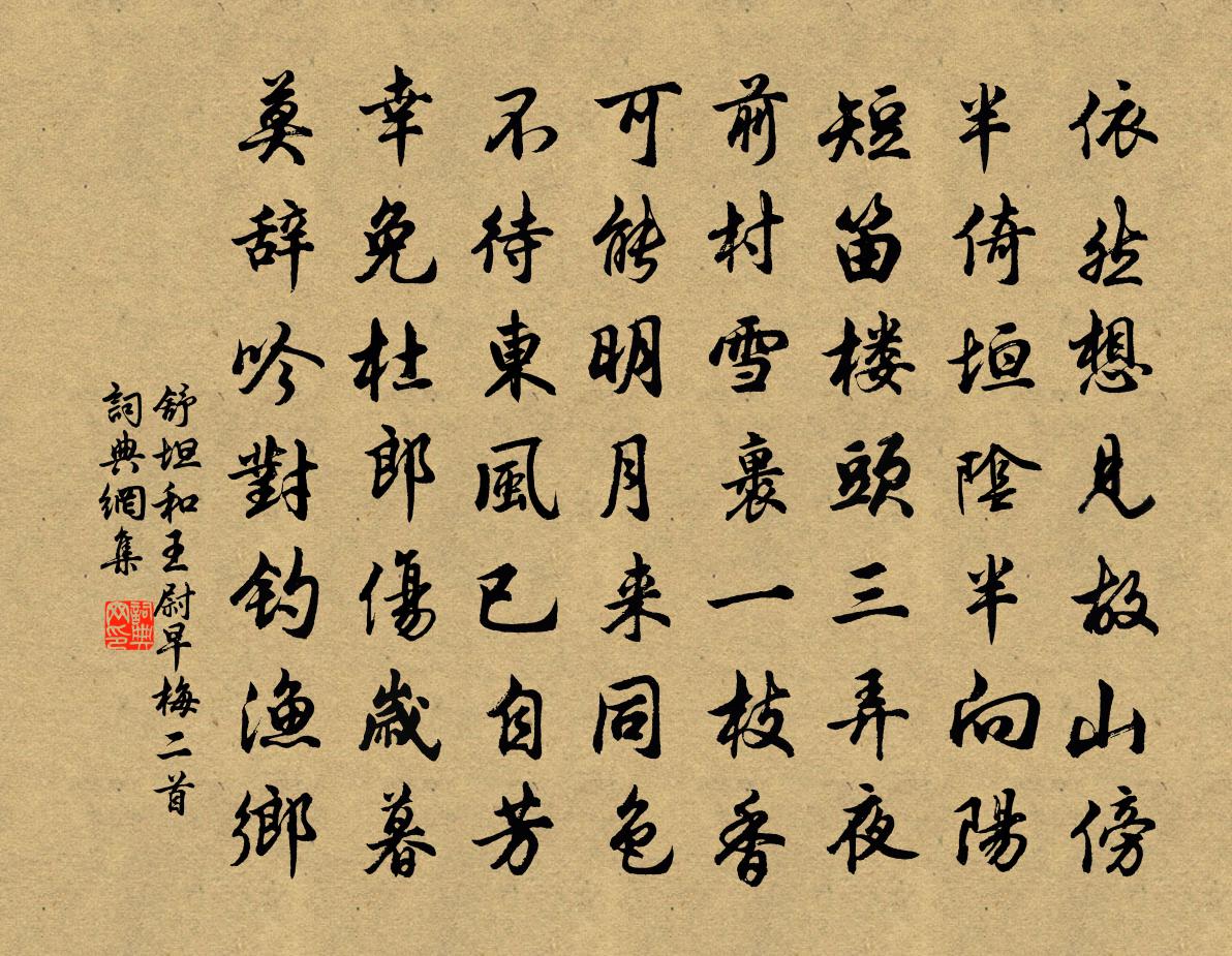 詩詞名句歷史字典書法欣賞書法字典國語詞典說文解字康熙字典古漢語字典標 題 作 者 詩 句 和王尉早梅二首作者:舒坦 朝代:宋代和王尉早梅二首原文依然想見故山傍,半倚垣陰半向陽。短笛樓頭三弄夜,前村雪裹一枝香。可能明月來同色,不待東風已自芳。倖免杜郎傷歲暮,莫辭吟對釣漁鄉。詩詞問答問:和王尉早梅二首的作者是誰?答:舒坦問:和王尉早梅二首寫於哪個朝代?答:宋代舒坦和王尉早梅二首書法欣賞和王尉早梅二首書法作品詩詞推薦草堂吳龍翰〔宋代〕蒼煙落日草堂深,淺淺寒侵白玉簪。等客不來童睡去,自搖修竹和新吟。施明可自湘潭還霅川以詩編相示摘其中重陽一程公許〔宋代〕倦遊保似雁隨陽,愁緒知添幾線長。歸路驛梅多未破,吟邊汀芷藹余香。寄聲鷗路舊同社,可奈鷖鳧紛著行。乞與思越人孫光憲〔唐代〕古台平,芳草遠,館娃宮外春深。翠黛空留千載恨,教人何處相尋,綺羅無復當時事,露花點滴香淚。惆悵遙天橫雨夜張詠〔宋代〕四簷寒雨滴秋聲,醉起重挑背壁燈,世事不窮身不定,令人閒憶虎谿僧。縱筆陸游〔宋代〕溫溫地爐紅,皎皎紙窗白。忽聞啄木聲,疑是敲門客。太平花陸游〔宋代〕扶床踉蹡出京華,頭白車書未一家。宵旰至今勞聖主,淚痕空對太平花。書張氏壁蘇泂〔宋代〕潮水遲朝渡,湖村竟日留。肯從沽酒飲,故作挾書游。得句因題壁,逢人問買州。雙鳧應不遠,知道客來不。初到洛中懷司馬光〔宋代〕三十餘年西復東,勞生薄宦等飛蓬。所存舊業惟清白,不負明君有朴忠。早避喧煩真得策,未逢危辱好收功。太平入春半月未有梅花尤袤〔宋代〕枯樹扶疏水滿池,攀翻未見玉團枝。應羞無雪教誰伴。未肯先春獨探枝。幾度杖藜貪看早,一年芳信恨開遲。留連送趙書記二首王柏〔宋代〕相逢雖晚意無加,滿腹經綸肯浪夸。雅興屢陪郊外樂,清譚不尚酒邊嘩。忍於柳驛攀金縷,記取梅坡嚼玉花。木落偈頌一百二十三首釋崇岳〔宋代〕千年田,八百主,郎當屋舍沒人修,不風流處也風流。雜曲歌辭升天行僧齊己〔唐代〕身不沉,骨不重。驅青鸞,駕白鳳。幢蓋飄飄入冷空,天風瑟瑟星河動。瑤闕參差阿母家,樓台戲閉凝彤霞。五三菩薩蠻范成大〔宋代〕小軒今日開窗了。揉藍染碧綠階草。檐佩可憐風。杏梢煙雨紅。飄零歡事少。鬢點吳霜早。天色不愁人。眼前無限燭影搖紅 又用張材甫韻 強村叢書用孔氏微波張玉娘〔元代〕梅雪乍融,單于吹徹寒猶淺。夜從燈下翦春幡,笑罷椒盤宴。雲母屏開簾卷。放嫦娥、廣寒宮苑。星移銀漢。月滿題思遠行業碑陳著〔宋代〕虎溪雖小深似海,截斷英雄富貴塵。卻為淵明過溪笑,方知心自有高人。贈筆趙蕃〔宋代〕管城封已失,少室價難高。外作蕭嵩表,中慚去病鏖。縱橫才適用,脫略已陳勞。自分當頻棄,毋庸謂不遭。聞范道卿將赴試成都作此勉之晁公溯〔宋代〕長來故倦遊,車轍環天下。艱難不吾容,虎兕適曠野。世方臥積薪,敢獨怨飄瓦。久荒小山桂,幾葬蒲圃檟。百罹西塞山(在武昌界,孫吳以之為西塞)羅隱〔唐代〕吳塞當時指此山,吳都亡後綠孱顏。嶺梅乍暖殘妝恨,沙鳥初晴小隊閒。波闊魚龍應混雜,壁危猿狖奈奸頑。會將獻盧尚書萬彤雲〔唐代〕荷衣拭淚幾回穿,欲謁朱門抵上天。不是尚書輕下客,山家無物與王權。題陳圖南鼾睡圖潘牥〔宋代〕甲馬營中紫氣高,屬豬人已著黃袍。此回天下地無事,可是山中睡得牢。名句推薦日日望鄉國,空歌白薴詞。張籍《薊北旅思 / 送遠人》 登車宿遷北,萬頃鋪瓊田。陸文圭《宿遷道中遇雪》 著葉滿枝翠羽蓋,開花無數黃金錢杜甫《秋雨嘆三首》 習讀書之業,便當知讀書之樂王永彬《圍爐夜話·第五五則》 旅客三秋至,層城四望開。杜審言《登襄陽城》 用舍由時,行藏在我,袖手何妨閒處看。蘇軾《沁園春·孤館燈青》 攀荷弄其珠,蕩漾不成圓。李白《折荷有贈》 君莫舞,君不見、玉環飛燕皆塵土!辛棄疾《摸魚兒·更能消幾番風雨》 晨興理荒穢,帶月荷鋤歸。陶淵明《歸園田居·其三》 並刀如水,吳鹽勝雪,縴手破新橙。周邦彥《少年游·並刀如水》