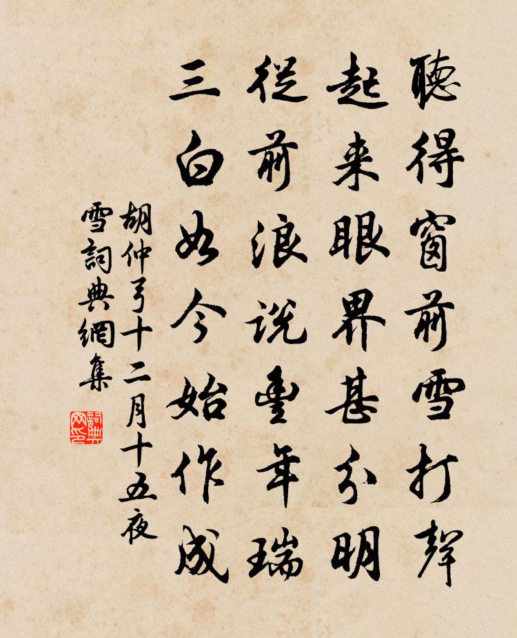 詩詞名句歷史字典書法欣賞書法字典國語詞典說文解字康熙字典古漢語字典標 題 作 者 詩 句 十二月十五夜雪作者:胡仲弓 朝代:宋代十二月十五夜雪原文聽得窗前雪打聲,起來眼界甚分明。從前浪說豐年瑞,三白如今始作成。詩詞問答問:十二月十五夜雪的作者是誰?答:胡仲弓問:十二月十五夜雪寫於哪個朝代?答:宋代胡仲弓十二月十五夜雪書法欣賞十二月十五夜雪書法作品詩詞推薦寄陳芸居俞桂〔宋代〕生長京華地,衣冠東晉人。書中塵不到,筆下句通神。江海知名日,池塘幾夢春。精神長似舊,芸藁愈清新。木蘭花慢(和答玉林韻)馮偉壽〔宋代〕酒醒人世換,碧桃靚、海山春。任青鳥沈沈,紫鱗杳杳,有玉林人。宮袍掉頭未愛,愛荷衣、不染市朝塵。仙樣蓬題僧希元禪隱堂蔡襄〔宋代〕游錫遍他方,歸休靜默堂。孤吟時有得,諸念若為忘。刪竹減庭翠,煮茶生野香。雲山莫騰誚,心地本清涼。水調歌頭 式古堂書畫題跋卷二十徐遜〔元代〕盤馬萬山頂,彈禽群木中。追思年少行樂,減盡舊豪雄。三十六峰青矗,三百六灘碧逝,歸路杳重重。拱手問仙伯余既和樂天詩而喜於年及之心猶不能自已又復吳芾〔宋代〕一年三百有餘旬,舉世棲棲苦迫貧。得享安寧七十歲,已勝衰謝萬千人。好官縱使登三事,榮養何由及二親。爭似次韻和甫春日金陵登台王安石〔宋代〕鍾山漠漠水洄洄,西有陵雲百尺台。萬物已隨和氣動,一樽聊與故人來。天邊幽鳥鳴相和,地上晴煙掃不開。愁眼洋州三十景竹塢鮮于侁〔宋代〕幽溪入流篁,翠色連遠塢。清夜天風來,不隔鸞鳳語。酹江月 福建官舍言懷王惲〔元代〕散材花無用,空花擁腫、豈花是入時花樣。白髮蒼顏官舍底,日把早衙來放。主治官花,隱憂民瘼,*愜澄清望。和姜明甫姚勉〔宋代〕詔放山林去,時人冷眼看。新詩為我贈,高義似君難。又說同年第,尤知取友端。市將梅子隱,冠尚貢公彈。和運使兵部秋成陳襄〔宋代〕重湖收積潦,多稼結盈疇。貸息移書減,逋租案籍求。民情寬蹙頞,歲計上參謀。寄語昆堂老,生初早晚修。水調歌頭(九日游雲洞和韓南澗韻)辛棄疾〔宋代〕今日復何日, * 為誰開。淵明漫愛重九,匈次正崔嵬。酒亦關人何事,正自能不爾,誰遣白衣來。醉把西風扇,送人往蘇州覲其兄黃滔〔唐代〕闔閭城外越江頭,兩地煙濤一葉舟。到日荊枝應便茂,別時珠淚不須流。迎歡酒醒山當枕,詠古詩成月在樓。明日趙正則司戶沿檄而歸玉蕊已過追賦車字韻詩奉周必大〔宋代〕春深遊客競繁華,寶馬香輪帶麴車。不為來看招隱樹,有誰肯顧野人家。飛飛粉蝶須相映,皎皎銀蟾色共夸。今得偈傾一百六十九首釋智朋〔宋代〕夜半明星,打失眼睛。胡人多詐,未可全憑。遭他冤害,始報不平。菊花新葛長庚〔宋代〕弱水書去蓬萊,書四萬八千書里。遠漠書漠,俯仰天水青無際。鳥飛不到船去難,渺無依。翦錦字。雲信待憑鸞翼送陳次公茂材李覯〔宋代〕俗人無心胸,貴偽不貴誠。口吻當文學,奔走成名聲。之子出蒿萊,行潔業且精。中美未外發,樸質亡華英。持此官牛-諷執政也白居易〔唐代〕官牛官牛駕官車,滻水岸邊般載沙。一石沙,幾斤重?朝載暮載將何用?載向五門官道西,綠槐陰下鋪沙堤。昨來舉季申信道自光化復入鄧書事四首陳與義〔宋代〕賣舟作歸計,竹籃穩如舟。霧收青皋濕,行路當春遊。老馬不自知,意欲踏九州。依然還故櫪,寂寞壯心休。次韻沈茂實小園偶書方回〔宋代〕人因雅俗分高下,同是園林興不同。時覺燕鶯相爾汝,焉知蜂蝶有雌雄。豈惟酒可兼詩可,常在花中與竹中。秋老喻道李鹹用〔唐代〕漢武秦皇漫苦辛,那思俗骨本含真。不知流水潛催老,未悟三山也是塵。牢落沙丘終古恨,寂寥函谷萬年春。長生名句推薦白雲回望合,青靄入看無。王維《終南山》 人悄悄,簾外月朧明。岳飛《小重山·昨夜寒蛩不住鳴》 山甫歸應疾,留侯功復成。張九齡《奉和聖制送尚書燕國公赴朔方》 賭近盜,淫近殺。馮夢龍《警世通言·卷三十五》 曲終人不見,江上數峰青。錢起《省試湘靈鼓瑟》 江海不擇小助,故能成其富。韓非及後人《韓非子·大體》 暮雨忽來鴻雁杳,莽關山、一派秋聲里。龔自珍《金縷曲·癸酉秋出都述懷有賦》 其出不出,間不容髮。班固《漢書·傳·賈鄒枚路傳》 城頭一片西山月,多少征人馬上看。李攀龍《塞上曲送元美》 放逐肯消亡國恨?歲時猶動楚人哀!查慎行《三閭祠》