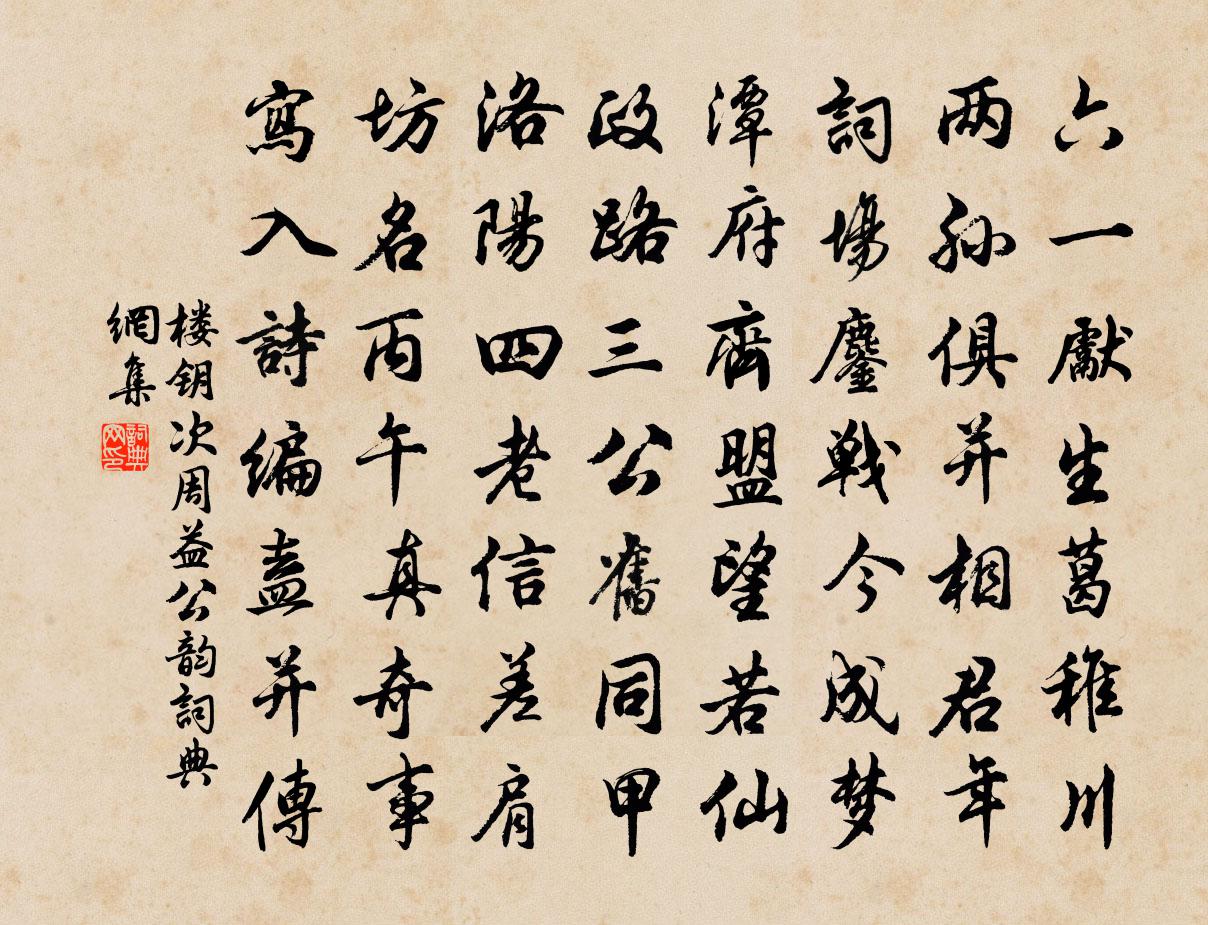 詩詞名句歷史字典書法欣賞書法字典國語詞典說文解字康熙字典古漢語字典標 題 作 者 詩 句 次周益公韻作者:樓鑰 朝代:宋代次周益公韻原文六一先生葛稚川,兩孫俱並相君年。詞場鏖戰今成夢,潭府齊盟望若仙。政路三公舊同甲,洛陽四老信差肩。坊名丙午真奇事,寫入詩編盍並傳。詩詞問答問:次周益公韻的作者是誰?答:樓鑰問:次周益公韻寫於哪個朝代?答:宋代樓鑰次周益公韻書法欣賞次周益公韻書法作品詩詞推薦停帆趙師秀〔宋代〕舟過梢人屋,停帆去未能。野梅皆是刺,灘水不為冰。里數訛難準,官稱俗可憎。欲登岩石坐,有吏復無朋。四月朔旦過黃山哭刑部百求弟道中五首陳著〔宋代〕河流曲折二十里,過了黃山始直礴。今日卸船須得早,鄮峰已在眼花中。夏夜陳與義〔宋代〕虛庭散策晚涼生,斟酌星河亦喜晴。不記牆西有修竹,夜風還作雨來聲。頌古三十一首釋原妙〔宋代〕吞而復吐冷煙浮,月落寒山猶未休。重把絲綸輕一掣,豈知元只在鉤頭。送裴別將之安西高適〔唐代〕絕域眇難躋,悠然信馬蹄。風塵經跋涉,搖落怨暌攜。地出流沙外,天長甲子西。少年無不可,行矣莫淒淒。好事近(寄張真甫·十二之一)陸游〔宋代〕羈雁未成歸,腸斷寶箏零落。那更凍醪無力,似故人情薄。瘴雲蠻雨暗孤城,身在楚山角。煩問劍南訊息,怕還成新春陸游〔宋代〕老境三年病,新元十日陰。疏籬枯蔓綴,壞壁綠苔侵。憂國孤臣淚,平胡壯士心。吾非兒女輩,肯賦白頭吟?歸來曲侯善淵〔元代〕修行事,割愛斷攀緣。身淨心清明道眼,內持無漏氣神全。真汞煉真鉛。安爐鼎,進火任烹煎。款款揮來捶作片,賈子明出東原採擷野蔬並詩見寄宋祁〔宋代〕東郊豐雜芼,遺我一襜盈。菊援分陽甲,滕岩下早英。溢杯同韭淪,羅案代葵烹。頓助高舂飯,兼和不糝羹。魯肱塘上行曹操〔魏晉〕蒲生我池中,其葉何離離。傍能行仁義,莫若妾自知。眾口鑠黃金,使君生別離。念君去我時,獨愁常苦悲。想見泰伯虞仲祠金朋說〔宋代〕閱牆兄弟不相容,尺布猶憐尚可縫。讓位介然如棄屣,盛哉至德厚無窮。書懷示友十首陳與義〔宋代〕張子霜後鷹,眉骨非凡曹。不肯兄事錢,但欲仆命騷。胡為隨我輩,碌碌著青袍。相逢車馬邊,伎癢不得搔。老將釋智圓〔宋代〕畫堂升降子孫扶,白髮毿毿膽尚粗。不省時清身已老,逢人猶說斬單于。路傍草於鄴〔唐代〕春至始青青,香車碾已平。不知山下處,來向路傍生。每歲有人在,何時無馬行。應隨塵與土,吹滿洛陽城。雜詠八首王安石〔宋代〕萬物餘一體,九州餘一家。秋毫不為小,徼外不為遐。不識壽與夭,不知貧與賒。忘心乃得道,道不去紛華。近跡次韻鹿苑寺一覽閣主岳松澗送茶陳著〔宋代〕鹿苑書來字字香,滿奩雀舌餉新嘗。有時獨坐相思處,一鼎松風午韻長。答子王曙〔宋代〕疏家子嘆揮金後,禦寇妻悲遺粟回。爭似吾兒知止足,陶廬容膝早歸來。酬謝韋卿二十五兄俯贈輒敢書情竇庠〔唐代〕大賢持贈一明璫,蓬蓽初驚滿室光。埋沒劍中生紫氣,塵埃瑟上動清商。荊山璞在終應識,楚國人知不是狂。莫恨壕頭入衡山界項安世〔宋代〕亂木林中微有路,兩山峽里欲無天。前頭似向夔州去,應有西川未了緣。金殿樂慢佚名〔宋代〕駕紫鸞軿。乘風縹緲遊仙。紅霓蘸影,近瑤池、鶴戲芝田。臨蕙圃、飲瓊泉。上蕭台、遙瞻九天。對真人蕊書親授名句推薦看蓬門秋草,年年破巷,疏窗細雨,夜夜孤燈。鄭燮《沁園春·恨》 君子以同而異。佚名《易傳·象傳下·睽》 初報邊烽照石頭,旋聞胡馬集瓜州。陸游《送七兄赴揚州帥幕》 河水縈帶,群山糾紛。李華《弔古戰場文》 流水不腐,戶樞不蠹呂不韋《呂氏春秋·紀·季春紀》 還始覺、留情緣眼,寬頻因春。吳文英《渡江雲三犯·西湖清明》 落日塞塵起,胡騎獵清秋。辛棄疾《水調歌頭·舟次揚州和人韻》 君子進則能達,退則能靜。豈貴其能達哉?貴其有功也。豈貴其能靜哉?貴其能守也。戴聖《大戴禮記·曾子制言中第五十五》 十二闌乾,故國三千里。王庭筠《鳳棲梧·衰柳疏疏苔滿地》 一樹斜陽蟬更咽,曾綰灞陵離別納蘭性德《淡黃柳·詠柳》