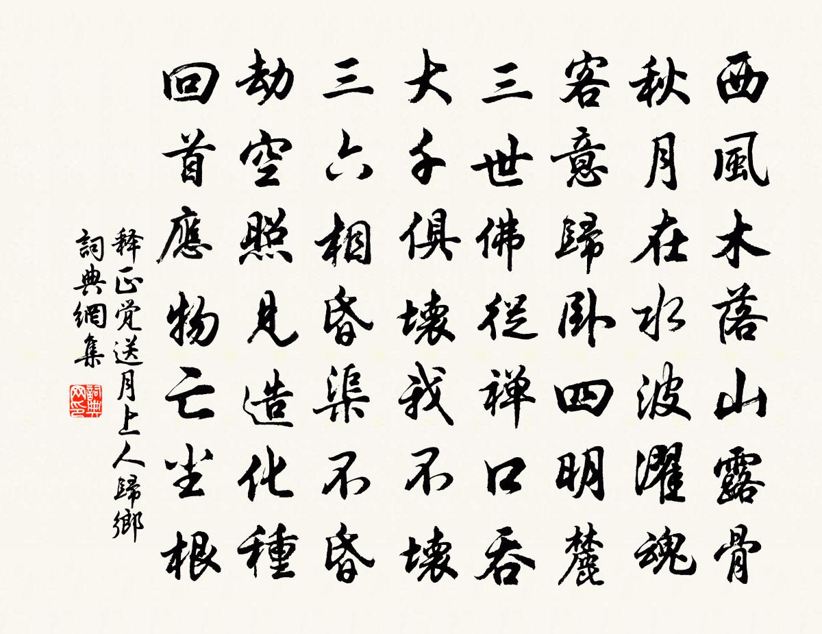 詩詞名句歷史字典書法欣賞書法字典國語詞典說文解字康熙字典古漢語字典標 題 作 者 詩 句 送月上人歸鄉作者:釋正覺 朝代:宋代送月上人歸鄉原文西風木落山露骨,秋月在水波濯魂。客意歸臥四明麓,三世佛從禪口吞。大千俱壞我不壞,三六相昏渠不昏。劫空照見造化種,回首應物亡塵根。詩詞問答問:送月上人歸鄉的作者是誰?答:釋正覺問:送月上人歸鄉寫於哪個朝代?答:宋代釋正覺送月上人歸鄉書法欣賞送月上人歸鄉書法作品詩詞推薦張求唐庚〔宋代〕張求一老兵,著帽如破斗。賣卜益昌市,性命寄杯酒。騎馬好事久,金錢投瓮牗。一語不假借,意自有臧否。雞肋宮詞效王建五首張耒〔宋代〕蓮燭千枝夜宴遲,君王索筆寫新詩。宮人和得爭先進,偏愛宋家兄弟詞。八聲甘州 前題分得文字 元草堂詩餘卷中蕭烈〔元代〕可憐生,飄零到茶*,依然舊銷魂。殘春幾許,風風雨雨,客里又黃昏。無奈一江煙霧,腥浪卷河豚。身世忽如葉題君子亭廖行之〔宋代〕疏池種瓊瑤,築屋看雲錦。愛渠花種賢,佳處心自領。我愛池中花,花中有君子。相看亭上人,其人亦如是。賦得北方有佳人徐賢妃〔唐代〕由來稱獨立,本自號傾城。柳葉眉間發,桃花臉上生。腕搖金釧響,步轉玉環鳴。纖腰宜寶襪,紅衫艷織成。懸知至樂詞寄黃幾復黃庭堅〔宋代〕余泛觀於天下兮,何者樂而誰者足憂。憂於窘窘不得兮,樂盡萬物而無求。翫聲色而弊形性兮,維造化之螟蠹。將胡樞橫山堂葛立方〔宋代〕朱甍碧瓦市廛遠,繞舍泉啼山復橫。勝處爭長渾仆妄,亂來有此幾卿。巳公茅屋實父子,裴氏午橋真弟兄。竟日倚趙飛燕張耒〔宋代〕苦心膏沐不論貲,富貴人生各有時。直使中流畏仙去,君王何啻似嬰兒。晚春過夏侯校書值其沉醉戲贈李端〔唐代〕欹冠枕如意,獨寢落花前。姚馥清時醉,邊韶白日眠。曝褌還當屋,張幕便成天。謁客唯題鳳,偷兒欲覘氈。失杯次韻林仲和筠莊李彌遜〔宋代〕交情金石半途分,霜後孤芳獨見君。盡倒濃漓澆磊磈,胸中著我半山雲。雜曲歌辭·薊門行五首高適〔唐代〕薊門逢古老,獨立思氛氳。一身既零丁,頭鬢白紛紛。勛庸今已矣,不識霍將軍。漢家能用武,開拓窮異域。戍座題多景樓王琮〔宋代〕秋滿闌乾晚共憑,殘煙衰草最關情。西風吹起江心浪,猶作當時擊楫聲。合州望黔樓釋義光〔宋代〕江上望黔樓,望中煙靄浮。微涼生戶牖,新雨過汀洲。遠岫千重疊,清波萬里流。此時何限興,回首寄群鷗。中和樂九章歌儲宮第六盧照鄰〔唐代〕波澄少海,景麗前星。高謀誕聖,甲觀升靈。承規翠所,問寢瑤庭。宗儒側席,問道橫經。山賓皎皎,國胄青青。淮南菊史鑄〔宋代〕割脂簇蠟密成團,傑出東籬最奈寒。加紫翻宜霜後看,料應慣見屬劉安。王正卿何道夫和嘉字韻詩至數十道夫贈予數篇李流謙〔宋代〕戲論無涯與有涯,委心沖漠固清嘉。衣裳草木元非織,窟宅雲霞豈是家。瞪眎恐同高長史,神交宜伴老南華。只應送人游嶺南戴叔倫〔唐代〕少別華陽萬里游,近南風景不曾秋。紅芳綠筍是行路,縱有啼猿聽卻幽。春晏病體少悰退臥北齋有寄宋祁〔宋代〕小有負薪疾,早成憔悴姿。無人來迓跛,賴酒與扶衰。朴斲知林短,腥{左月右婁}厭席卑。西山一丸藥,何忍獨寄汴州令狐相公王建〔唐代〕三軍江口擁雙旌,虎帳長開自教兵。機鎖惡徒狂寇盡,恩驅老將壯心生。水門向晚茶商鬧,橋市通宵酒客行。秋日永嘉勸農歸舟中吳泳〔宋代〕使君每愛讀豳詩,稼事艱難亦粗知。水凍未聞身布野,年飢且喜麥生岐。坐間白叟真堪貴,眼底朱衣總是痴。趁刺名句推薦莫道桑榆晚,為霞尚滿天。劉禹錫《酬樂天詠老見示》 明月,明月,胡笳一聲愁絕。戴叔倫《轉應曲·邊草》 軍中宜劍舞,塞上重笳音。張說《幽州夜飲》 烏鳥之狡,雖善不親。不重之結,雖固必解管仲《管子·形勢》 雁盡書難寄,愁多夢不成。沈如筠《閨怨二首·其一》 似花還似非花,也無人惜從教墜。蘇軾《水龍吟·次韻章質夫楊花詞》 無人知此意,歌罷滿簾風。陳與義《臨江仙·高詠楚詞酬午日》 樹樹皆秋色,山山唯落暉。王績《野望》 故人離別盡,淇上轉驂騑。王維《送魏郡李太守赴任》 事在四方,要在中央。韓非及後人《韓非子·揚權》