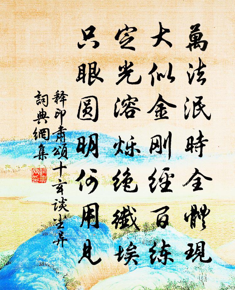 詩詞名句歷史字典書法欣賞書法字典國語詞典說文解字康熙字典古漢語字典標 題 作 者 詩 句 頌十玄談塵異作者:釋印肅 朝代:宋代頌十玄談塵異原文萬法泯時全體現,大似金剛經百練。定光溶爍絕纖埃,隻眼圓明何用見。詩詞問答問:頌十玄談塵異的作者是誰?答:釋印肅問:頌十玄談塵異寫於哪個朝代?答:宋代釋印肅頌十玄談塵異書法欣賞頌十玄談塵異書法作品詩詞推薦【雙調】殿前歡_春據危闌,薛昂夫〔元代〕春據危闌,看浮屠雙聳倚高寒,鱗鱗萬瓦連霄漢。俯視塵寰,望飛來紫翠間。雲初散,放老眼情無限。知他是西山詩一首馬文斌〔宋代〕希奇寶象獸中王,猛毅雄心世不當。四足端然如玉柱,雙牙利劍若金鋩。立觀峭峻成功岳,動必搖形見者慌。但心霜後紀園中草木十二絕范成大〔宋代〕清霜染柿葉,荒園有佳趣。留連伴歲晚,莫作流紅去。湖上王鎡〔宋代〕萬紅飛盡雨如煙,心事傷春哭杜鵑。遊子不來弦管歇,畫船空擊柳絲邊。送陳供奉恩敕放歸覲省錢起〔唐代〕得意今如此,清光不可攀。臣心堯日下,鄉思楚雲間。楊柳依歸棹,芙蓉棲舊山。采蘭兼衣錦,何似買臣還。二月八日與黃燾僧曇穎過逍遙堂何道士宗一問蘇軾〔宋代〕安心守玄牝,閉眼覓《黃庭》。問疾來三士,澆愁有半瓶。風權時落蕊,病鶴不梳翎。樽空我歸去,山月照君醒。新得小石呈景仁韓維〔宋代〕泥沙洗盡太湖波,狀有嵌崆勢亦峨。可笑尚平游五嶽,不如坐視一拳多。地震蒲松齡〔清代〕康熙七年六月十七日戌刻,地大震。余適客稷下,方與表兄李篤之對燭飲。忽聞有聲如雷,自東南來,向西北去。絕句二首蘇軾〔宋代〕漠漠秋高露氣清,新蒲倚石近溪生。夜來雨後西風急,靜向窗前似有聲。幽趣十二首鄭剛中〔宋代〕幽趣無人會,欣然自解顏。雨來飛鳥急,沙靜小魚閒。翠滴峰巒表,香霏草木間。吾心久忘物,物意苦相關。偈頌三十首釋印肅〔宋代〕若無一切心,何用一切法。佛說一切法,為除一切心。若人解實相,於中無虛誑。說與不說同,是師名最上。實相和張憲登烏尤山吳泳〔宋代〕子知天分不人尤,豈若紛紛式屢驕。舊見已知霜葉脫,新知才似谷牙焦。送筍與屏山劉仲行〔宋代〕籜龍戢戢破苔斑,風味從來奈歲寒。知有高人清愛白,定應燒煮薦珠盤。龍門峽范成大〔宋代〕插天千丈兩碧城,中有玉塹空岩扃。瀑流懸布不知數,亂落嵌根飛白雨。瑤琨為室云為關,龍君所居朱夏寒。不辭紹興祀岳鎮海瀆四十三首佚名〔宋代〕我土綿綿,孰匪疆理。惟時幽都,匪日隃只。條哉良月,朔風其同。曷阻曷深,其亦來降。懷李商叟趙蕃〔宋代〕好在半村宅,竹添桐長枝。空餘相憶夢,不見寄來詩。苦節君耆舊,卑官我判司。因來貴溪水,一為洗塵緇。清明病中賀鑄〔宋代〕寒食晴陽少,江南此候同。侵晨潑火雨,薄暮駕潮風。目力書籤上,生涯藥裹中。可憐佳節物,似不系衰翁。和立齋荔子樓韻王柏〔宋代〕我久抱離索,加子憂患薰。血氣日以耗,話別難為情。之子行邁邁,徵車從仁兄。閩嶺在何處,目斷遮行雲。素□留題天游閣陳襄〔宋代〕誰榜天游向此軒,欲令幽隱味真篇。一心泯絕渾無計,萬事攖寧付自然。持缽隨緣朝乞供,閉門扣寂夜安禪。如師李審言相招與刁景純周仲章裴如晦馮當世沈文梅堯臣〔宋代〕自君命我飲,朝暮雨傾瓦。城東與城北,大道泥沒馬。敢忘主人勤,顛撲困馭者。眾客亦如期,陳餚藉蘭若。馮裴名句推薦歡言得所憩,美酒聊共揮。李白《下終南山過斛斯山人宿置酒》 日日雨不斷,愁殺望山人。賈島《望山》 君子周而不比,小人比而不周。孔子弟子《論語·為政篇》 世事短如春夢,人情薄似秋雲。朱敦儒《西江月·世事短如春夢》 一晌憑欄人不見,鮫綃掩淚思量遍。馮延巳《鵲踏枝·梅落繁枝千萬片》 朔風吹雪透刀瘢,飲馬長城窟更寒。盧汝弼《和李秀才邊庭四時怨·其四》 玉露凋傷楓樹林,巫山巫峽氣蕭森杜甫《秋興八首·其一》 晨興好擁向陽坐,晚出宜披踏雪行。白居易《新制綾襖成感而有詠》 客子光陰詩卷里,杏花訊息雨聲中。陳與義《懷天經智老因訪之》 凡大事皆起於小事,小事不論,大事又將不可救吳兢《貞觀政要·卷一·論政體》