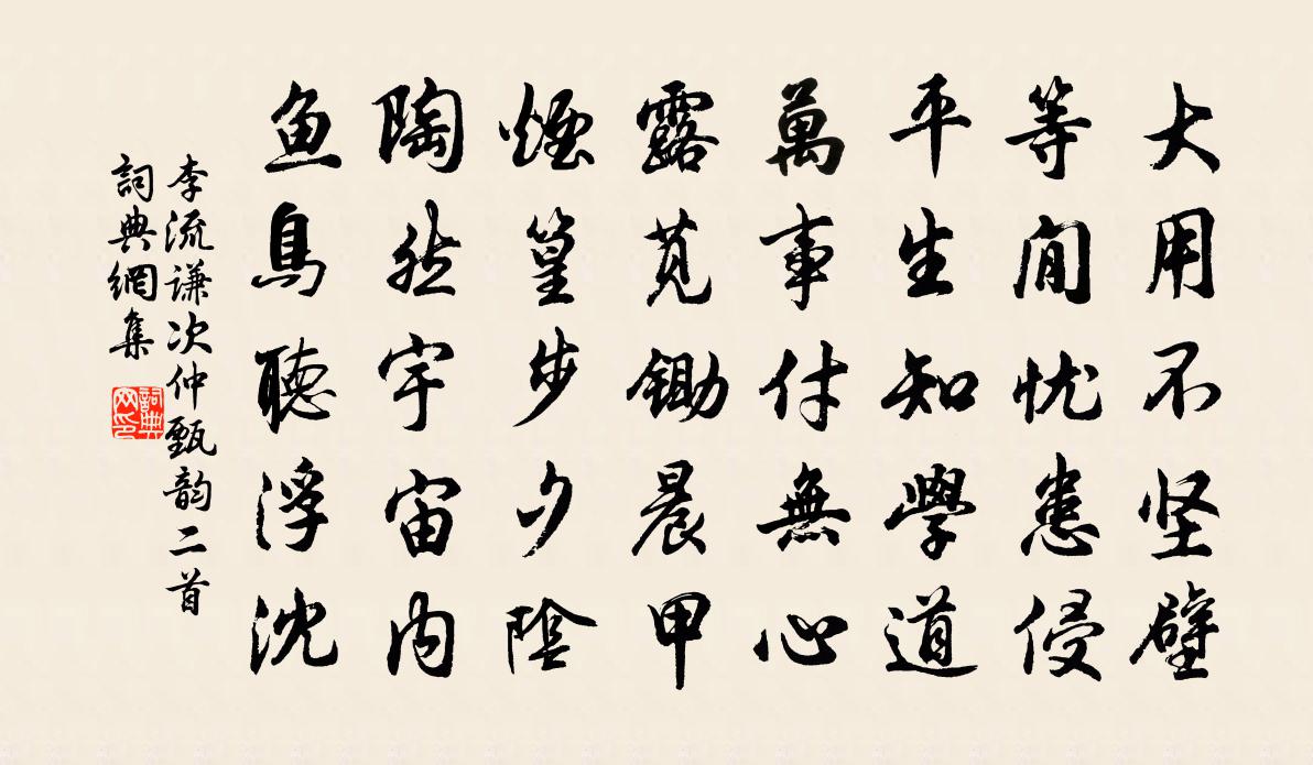 詩詞名句歷史字典書法欣賞書法字典國語詞典說文解字康熙字典古漢語字典標 題 作 者 詩 句 次仲甄韻二首作者:李流謙 朝代:宋代次仲甄韻二首原文大用不堅壁,等閒憂患侵。平生知學道,萬事付無心。露莧鋤晨甲,煙篁步夕陰。陶然宇宙內,魚鳥聽浮沈。詩詞問答問:次仲甄韻二首的作者是誰?答:李流謙問:次仲甄韻二首寫於哪個朝代?答:宋代李流謙次仲甄韻二首書法欣賞次仲甄韻二首書法作品詩詞推薦金剛隨機無盡頌一體同觀分第十八釋印肅〔宋代〕國土河沙數,廣論無遮護。窮閒一個人,無棍又沒褲。力學方回〔宋代〕力學衰猶進,治生晚不讎。操心元自定,忤俗果何由。塗抹余千紙,浮沉等一漚。忍窮兼耐辱,失笑未包羞。挽趙和仲侍郎三首劉宰〔宋代〕珍館萊衣侍,佳城孟母鄰。去來哀我異,孝愛死生均。寵渥昭宸翰,豐功勒翠珉。白蓮原上路,指日萬家春。奉和魯望漁具十五詠釣筒皮日休〔唐代〕籠籦截數尺,標置能幽絕。從浮笠澤煙,任臥桐江月。絲隨碧波漫,餌逐清灘發。好是趁筒時,秋聲正清越。大觀祭風師六首佚名〔宋代〕明昭惟聲,威備孔時。鏘鏘鳴佩,欽薦牲犧。惟恭惟祗,無愆無達。周旋中禮,肅恭委蛇。游悟貞寺回山下別張殷衡白居易〔唐代〕世緣未了治不得,孤負青山心共知。愁君又入都門去,即是紅塵滿眼時。賀新郎(別竹西)呂渭老〔宋代〕斜日封殘雪。記別時、檀槽按舞,霓裳初徹。唱煞陽關留不住,桃花麵皮似熱。漸點點、珍珠承睫。門外潮平風席南岩悟禪老見於山中烹玉糝羹王銍〔宋代〕我家峰頭最高層,落葉蒼苔不可登。清坐與師烹玉糝,千岩風雨夜深燈。減字木蘭花(壽女婿)王觀〔宋代〕瑞雲仙霧。拂曉重重遮繡戶。一炷清香。千尺流霞入壽觴。家門轉好。從此應須長不老。來歲春風。看拜西樞小令四聖贊釋師體〔宋代〕稽首普賢,不可思議。出頭露面,開言吐氣。拍盲擔板,忘恩斷義。事無寸長,熏天炙地。詠史上王允陳普〔宋代〕事成一讓一矜功,一吉分明對一凶。青瑣門前招不去,相期猶不負林宗。送王克敏之安豐錄事王冕〔元代〕丹墀對策三千字,金榜題名五色春。聖上喜迎新進士,民間應得好官人。江花繞屋廳事近,煙樹連城野趣真。所願南徐別業早春有懷武元衡〔唐代〕生涯憂憂竟何成,自愛深居隱姓名。遠雁臨空翻夕照,殘雲帶雨過春城。花枝入戶猶含潤,泉水侵階乍有聲。虛度歸郡書金峨二首舒坦〔宋代〕又入西湖醉過春,嶺頭猿鶴幾時聞。無端雨意隨人去,直恐衣巾儘是雲。八月十六日觀月段氏亭次王師老韻郭印〔宋代〕隱映孤亭小,迴環萬竹幽。水聲喧暗谷,月影淡高秋。物與黃昏靜,人隨白日流。一椽堪送老,何必仲宣樓。郊園即事寄蕭侍郎(一作呈蕭常州復)戴叔倫〔唐代〕衰鬢辭餘秩,秋風入故園。結茅成暖室,汲井及清源。鄰里桑麻接,兒童笑語喧。終朝非役役,聊寄遠人言。和宋師出示所送李大著詩項安世〔宋代〕病中三復舍人篇,可但才工與調妍。心在雩壇沂水上,思通歸鳥岫雲邊。自將鐵石為傅授,不與風騷較襲沿。聽者寄許主客梅堯臣〔宋代〕昨日山光寺前雨,今朝邵伯堰頭風。野雲不散低侵水,魚艇無依尚蓋蓬。藉味初能消酒渴,蓼花猶愛照波紅。楊州道傍菊有感趙蕃〔宋代〕昔日曾升君子堂,只今蕭艾與俱長。可憐冷蝶無時態,盡日伶俜為汝忙。庚申清明日子融出遊寄示游十絕以長句謝之陳文蔚〔宋代〕浴沂天氣出效坰,所至題詩取交優。花塢風煙俱入詠,雲岩泉石屢增名。摩沙硤石舊題字,展轉東山未盡情。不出名句推薦明日復明日,明日何其多。錢福《明日歌》 長恨春歸無覓處,不知轉入此中來。白居易《大林寺桃花》 燕子重來,往事東流去。吳文英《點絳唇·時霎清明》 尿泡雖大無斤兩,秤鉈雖小壓千斤。吳承恩《西遊記·第三十一回》 對酒當歌,強樂還無味。柳永《蝶戀花·佇倚危樓風細細》 賢路當廣而不當狹,言路當開而不當塞脫脫《宋史·列傳·卷一百七十六》 吹到一片秋香,清輝了如雪。納蘭性德《琵琶仙·中秋》 衣懶換,酒難賒。可憐此夕看梅花。吳文英《思佳客·癸卯除夜》 四十年來家國,三千里地山河李煜《破陣子·四十年來家國》 道人庭宇靜,苔色連深竹。柳宗元《晨詣超師院讀禪經》
