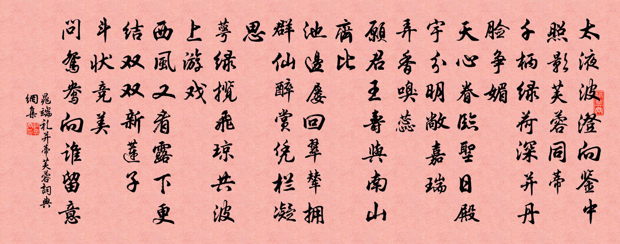 詩詞名句歷史字典書法欣賞書法字典國語詞典說文解字康熙字典古漢語字典標 題 作 者 詩 句 並蒂芙蓉作者:晁端禮 朝代:宋代並蒂芙蓉原文太液波澄,向鑒中照影,芙蓉同蒂。千柄綠荷深,並丹臉爭媚。天心眷臨聖日,殿宇分明敞嘉瑞。弄香嗅蕊。願君王,壽與南山齊比。池邊屢回翠輦,擁群仙醉賞,憑欄凝思。萼綠攬飛瓊,共波上遊戲。西風又看露下,更結雙雙新蓮子。斗狀競美。問鴛鴦、向誰留意。詩詞問答問:並蒂芙蓉的作者是誰?答:晁端禮問:並蒂芙蓉寫於哪個朝代?答:宋代問:並蒂芙蓉是什麼體裁?答:詞晁端禮並蒂芙蓉書法欣賞並蒂芙蓉書法作品詩詞推薦梅花喜神譜小蕊一十六枝宋伯仁〔宋代〕佛有光明台,蚌胎奚足貴。聊以矜俗人,徒為寶所費。海棠趙文〔宋代〕纖纖光潤態偏濃,曲曲花蓬暖自融。嬌淚惱公初著雨,豐肌病酒不宜風。人疑欲睡高燒燭,天悔無香剩與紅。正使再呈思永趙蕃〔宋代〕寶氣疑猶在,諸公盛得名。新知雖可樂,舊恨卒難平。我句野無格,君詩工莫評。青錢宜妙選,墨綬盍遲行。??亭山頂白龍穴蔡肇〔宋代〕南山咚咚天作鼓,號召諸龍盡行雨。惟有禿角最先到,潑墨雲中鱗鬣舞。正月十九日四更起讀朱文公年譜至天大明賦十方回〔宋代〕四世東南保太平,有君無相廟堂輕。具知人眼識朱子,獨趙汝愚陳俊卿。宮詞王仲修〔宋代〕璧月珠星應律灰,兩班稱慶一陽回。九韶聲裹千秋曲,五色雲中萬壽杯。句張釜〔宋代〕欲辨已忘言。春雨寇準〔宋代〕漠漠霏霏著柳條,輕寒爭信杏花嬌。江南二月如煙細,誰正春愁在麗譙。過宜賓見夷中亂山蘇軾〔宋代〕江寒晴不知,遠見山上日。朦朧含高峰,晃蕩射峭壁。橫雲忽飄散,翠樹紛歷歷。行人挹孤光,飛鳥投遠碧。蠻荒橫吹曲辭。關山月王建〔唐代〕關山月,營開道白前軍發。凍輪當磧光悠悠,照見三堆兩堆骨。邊風割面天欲明,金沙嶺西看看沒。英宗皇帝輓詞五首王珪〔唐代〕憶昔承君召,春風候禁門。曾陪蕊珠殿,獨賜紫花墩。遼水千年隔,鈞天一夢存。龍髯攀不得,無路可酬恩。挽張正應陸九淵〔宋代〕海門晝夜吼奔雷,卻立吳山亦壯哉。前殿神仙三島邃,正門閶闔九天開。玉階恭授大官賜,象簡親承御墨回。多少佺上人遊方薛嵎〔宋代〕燕鴻來去盡,蕭索此時心。杖錫投何寺,風霜別故林。夜床煨葉炎,朝谷應樵音。往往長松下,看山坐獨吟。和方孚若瀑上種梅五首劉克莊〔宋代〕仙翁小試春風手,高拂茅檐矮映窗。選勝多依岩罅種,愛奇或並樹身扛。海山大士寒蒙衲,月殿仙姝夜擁幢。商略爇心香 贈閻知宮馬鈺〔元代〕此個知宮,本是神仙。外修持、錯了因緣。聽予勸化,索隱搜玄。便棄繁華,離塵境,訪林泉。淨意情心,耕種丹寄題張商弼葵堂堂下元不種葵花但取面勢向陽楊萬里〔宋代〕主人未肯便山林,賞月吟風酒更琴。每一登堂一揩眼,誰知半點向陽心。再和昌言喜雪韓維〔宋代〕愧無奇策輔吾皇,乞得閒官老故鄉。壯志未甘悲白髮,歡情猶看舞紅妝。長歌不計閒光景,吟苦難滋舊肺腸。多謝雜興陸游〔宋代〕少年豈知酒,借醉以作狂;中年狂已歇,始覺酒味長,湛湛癭樽綠,酌以紅螺觴,醒醉不可名,兀坐萬事忘。春日山居好十首舒岳祥〔宋代〕春日山居好,尤佳是仲春。半開花有韻,微醉酒全真。堯帝衣裳日,周公禮樂辰。枝頭百舌子,播告太諄諄。朝中措朱敦儒〔宋代〕胸中塵士久無奇。今夕借清輝。歌縱群英諸彥,舞狂蕙帶荷衣。鴛鴦湖上,波平岸遠,酒釅魚肥。好是中秋圓月,名句推薦名花傾國兩相歡,常得君王帶笑看。李白《清平調·名花傾國兩相歡》 國危主憂,說者成伍,無益於安危也。商鞅《商君書·農戰》 書劍時將晚,丘園日已暮。孟浩然《田園作》 奈南牆冷落,竹煙槐雨。吳文英《惜秋華·七夕前一日送人歸鹽官》 過眼年華,動人幽意,相逢幾番春換。王沂孫《法曲獻仙音·聚景亭梅次草窗韻》 一簞食,一瓢飲,在陋巷,人不堪其憂,回也不改其樂。賢哉,回也!孔子弟子《論語·雍也篇》 宿醉離愁慢髻鬟,六銖衣薄惹輕寒,慵紅悶翠掩青鸞韓偓《浣溪沙·宿醉離愁慢髻鬟》 北方有佳人,絕世而獨立。李延年《李延年歌》 蓼岸荻花中,隱映竹籬茅舍。張昪《離亭燕·一帶江山如畫》 宿草春風又,新阡去歲無。楊萬里《寒食上冢》