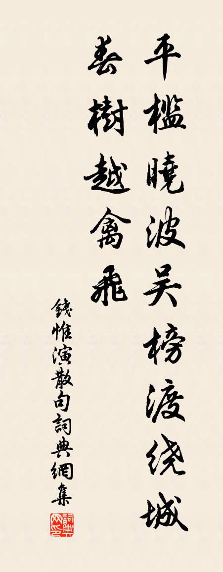 詩詞名句歷史字典書法欣賞書法字典國語詞典說文解字康熙字典古漢語字典標 題 作 者 詩 句 句作者:錢惟演 朝代:宋代句原文平檻曉波吳榜渡,繞城春樹越禽飛。詩詞問答問:句的作者是誰?答:錢惟演問:句寫於哪個朝代?答:宋代錢惟演句書法欣賞句書法作品詩詞推薦戲答龍泉余尉問禪二小詩黃庭堅〔宋代〕翻頭作尾掉枯藤,臘月花開更造冰。何似清歌倚桃李,一爐瀋水醉紅燈。海上文天祥〔宋代〕天邊青鳥逝,海上白鷗馴。王濟非痴叔,陶潛豈醉人。得官須報國,可隱即逃秦。身事蓋棺定,挑燈看劍頻。有所思聯句孟郊〔唐代〕相思繞我心,日夕千萬重。年光坐婉娩,春淚銷顏容。 ——孟郊台鏡晦舊暉,庭草滋深茸。望夫山上石,別劍水減字木蘭花(宣和庚子登浯台作)夏倪〔宋代〕江涵曉日。蕩漾波光搖槳入。笑指浯溪。漫叟雄文鎖翠微。休嗟不偶。歸到中州何處有。獨立風煙。湘水浯台總接喜遷鶯蔡伸〔宋代〕青娥呈瑞。正慘慘暮寒,同雲千里。剪水飛花,漸漸瑤英,密灑翠筠聲細。邃館靜深,金鋪半掩,重簾垂地。明窗對梅張道洽〔宋代〕數點枝頭黏白玉,一年春意動黃鐘。為渠拚受風流罪,只恐風流不到儂。寄邊上從事鄭谷〔唐代〕男兒懷壯節,何不事嫖姚。高疊觀諸寨,全師護大朝。淺山寒放馬,亂火夜防苗。下第春愁甚,勞君遠見招。魏奉禮昭文知吉州龍泉縣楊億〔宋代〕平昔登龍坂,因緣識玉人。庭中華轂滿,膝下彩衣新。少列悲先露,高堂泣累茵。嘉賓碣館閉,遺業寢邱貧。弓冶和呂之壽寄伯章韻丘葵〔宋代〕一片間雲自在眠,人依乎地地依天。六經不朽道吾道,獨學無成年又年。鄉里小兒皆富貴,山川大海盡風煙。乾坤十月朝開爐偶書。余病歸二年,未能拜掃松楸范成大〔宋代〕圃芋今年紫,籬楓昨日丹。開爐修故事,聽雨說新寒。桔社重遊阻,楸行再拜難。此時西望眼,衰涕不勝彈。山中月夜張嵲〔宋代〕過雨得清夜,月明惟水聲。葉光知露隕,蘭馥賴風清。天地未悔禍,豺狼猶阻兵。故園同此夕,長望一霑纓。和三二兄西莊書懷潘良貴〔宋代〕莫問莊生然不然,時中只可自隨緣。冬深江北無邊報,又得安貧過一年。漢南遇方評事(一作襄州遇房評事由)戴叔倫〔唐代〕移家住漢陰,不復問華簪。貰酒宜城近,燒田夢澤深。暮山逢鳥入,寒水見魚沈。與物皆無累,終年愜本心。書適陸游〔宋代〕細讀養生主,長歌歸去來。山僧借水品,溪父送琴材。病退稀求藥,身閒日探梅。今宵喜無寐,岷下有書回。秋宿鶴林寺崔塗〔唐代〕步步入林中,山窮意未窮。偏逢僧話久,轉與鶴棲同。燭焰風銷盡,蘭條露濕空。又須從此別,江上正秋鴻。二月二日挑菜節大雨不能出張耒〔宋代〕久將菘芥芼南羹,佳節泥深人未行。想見故園蔬甲好,一畦春水轆轤聲。去年余佐京口遇王嘉叟從張魏公督師過焉魏公陸游〔宋代〕河亭挈手共徘徊,萬事寧非有數哉!黃閣相君三黜去,青雲學士一麾來。中原故老知誰在,南嶽新丘共此哀。火冷疇依王柏〔宋代〕曆紀明道,祥應兩程。吟風弄月,有的其承。體用一原,顯微無間。惠我光明,如夜復旦。涼風亭睡覺裴度〔唐代〕飽食緩行新睡覺,一甌新茗侍兒煎。脫巾斜倚繩床坐,風送水聲來耳邊。佳雪應時呈司土使君三首朱長文〔唐代〕炫晃天花著物新,壺中萬景淨無塵。光輝只欲饒寒士,清潔尤宜比古人。韋白吟時飄入硯,鄒枚燕處舞回茵。明年名句推薦濛柳添絲密,含吹織空羅。李世民《詠雨》 福來有由,禍來有漸。陳壽《三國志·吳書·吳主五子傳》 揚雲霓之晻藹兮,鳴玉鸞之啾啾。屈原《離騷》 得其所利,必慮其所害;樂其所成,必顧其所敗。劉向《說苑·敬慎》 星稀河影轉,霜重月華孤。張孝祥《臨江仙·試問梅花何處好》 隋堤三月水溶溶。背歸鴻,去吳中。蘇軾《江神子·恨別》 用舍由時,行藏在我,袖手何妨閒處看。蘇軾《沁園春·孤館燈青》 寒眼亂空闊,客意不勝秋。楊炎正《水調歌頭·登多景樓》 天馬徠,龍之媒,游閶闔,觀玉台。劉徹《天馬二首·其二》 白水滿春塘,旅雁每迥翔。沈約《詠湖中雁》
