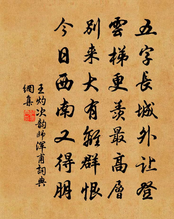 詩詞名句歷史字典書法欣賞書法字典國語詞典說文解字康熙字典古漢語字典標 題 作 者 詩 句 次韻師渾甫作者:王灼 朝代:宋代次韻師渾甫原文五字長城外讓登,雲梯更羨最高層。別來大有離群恨,今日西南又得朋。詩詞問答問:次韻師渾甫的作者是誰?答:王灼問:次韻師渾甫寫於哪個朝代?答:宋代王灼次韻師渾甫書法欣賞次韻師渾甫書法作品詩詞推薦壽州十詠熙熙閣宋祁〔宋代〕東譙已自高,復此構層宇。誰謂淮南遠,風物美無度。飛岑納晝碧,流月遺宵素。揆予乏仙氣,樓居庶可慕。春日病起釋文珦〔宋代〕暮景交朋盡,何人問死生。臥於蝸室底,看得鵲巢成。緣絕門常靜,心空疾漸平。又思扶杖出,溪上聽泉聲。舟中午睡楊萬里〔宋代〕一葉搖無定,昏然妙思通。化為漆園蝶,飛入大槐宮。有酒相勾引,無茶作寇戎。平生眠不足,還債櫓聲中。晚別樂記室彥褚亮〔唐代〕窮途屬歲晚,臨水忽分悲。抱影同為客,傷情共此時。霧色侵虛牖,霜氛冷薄帷。舉袂慘將別,停懷悵不怡。風嚴自愛釋文珦〔宋代〕衣裳唯毳衲,飽啄只簞瓢。翻為生涯薄,能令世慮消。寒花香不遠,病木葉先凋。自愛秋風裡,雲山共寂寥。瑞岩仰老見和復酬前韻七首曹勛〔宋代〕請得忙中物外身,要看飛瀑瀉天紳。佳時每與漁樵伴,放語相倍是故人。同李漢老登高齋劉子翬〔宋代〕飛梯百級轉層巒,政喜登臨著眼寬。海上波濤連閬苑,日邊塵土暗長安。亂來世事終無定,春盡羈愁豈一端。賴有題壁楊凝式〔唐代〕院似禪心靜,花如覺性圓。自然知了義,爭肯學神仙。前歲上元與趙任卿寓臨安追逐甚今年同在建溪家鉉翁〔宋代〕山城燈火已蕭然,掃巷遊人更雪天。厭聽落梅翻永夜,喜看飛絮卜豐年。狂隨戲蝶裝羅髻,巧逐纖腰上舞筵。明日詠史上賈逵陳普〔宋代〕經術何曾得暫行,漢家空有表章名。石渠但把雷霆壓,焉用低帷鑿壁生。戲雲龍山人二絕秦觀〔宋代〕芳草未應羞鵯鵊,潛鱗終是表提壼。蔡經背上痕猶在,更念 * 指爪無。高宗皇帝輓詞五首宋孝宗〔宋代〕草昧千齡旦,飈回九縣塵。皇天開我宋,丹極下真人。指顧山河定,歡呼歷數新。斷鰲重立極,更與物為春。偈頌十六首釋如淨〔宋代〕靈靈而時時昧,不得月隨流水。歷歷而處處混,不得雨逐行雲。贈梅鄧深〔宋代〕花蒙臘雪袁安臥,影落寒江正則魂。忽見江南春信息,誰教驛使到夔門。大佛頭董嗣杲〔宋代〕不是金塗丈六仙,莊嚴法界想西天。自因僧淨鐫空像,誰說秦皇纜海船。全體未知何日現,半生且坐此山禪。石頭贈日者黃明遠黃公度〔宋代〕幅貼別我五周星,今日相逢眼暫明。一第男兒身自致,曾將蹤跡問君平。得家訊一首劉克莊〔宋代〕不覺離鄉久,南來驛使疏。羈臣一掬淚,慈母兩行書。租稅聞輸畢,田園說歉餘。何時真宦達,處處奉潘輿。杭州春望白居易〔唐代〕望海樓明照曙霞,護江堤白踏晴沙。濤聲夜入伍員廟,柳色春藏蘇小家。紅袖織綾夸柿蒂,青旗沽酒趁梨花。誰開水心先生惠雇瓜廬薛師石〔宋代〕未成三徑已荒蕪,勞動先生枉棹過。數朵葵榴發深愧,一池鷗鷺避前呵。路通矮屋惟添草,橋壓扁舟半沒河。再見八月七日被命上會稽沿途所歷拙於省記為韻語魏了翁〔宋代〕風順潮平日腳收,錢塘江上遇中秋。堂堂背月爭門入,要把平安報冕旒,名句推薦朱弦已為佳人絕,青眼聊因美酒橫。黃庭堅《登快閣》 春酒香熟鱸魚美,誰同醉?纜卻扁舟篷底睡。李珣《南鄉子·雲帶雨》 曾逐東風拂舞筵,樂遊春苑斷腸天。李商隱《柳》 昔日芙蓉花,今成斷根草。李白《妾薄命》 手種堂前垂柳,別來幾度春風?歐陽修《朝中措·送劉仲原甫出守維揚》 五色令人目盲;五音令人耳聾;五味令人口爽;馳騁畋獵,令人心發狂;難得之貨,令人行妨。老子《老子·道經·第十二章》 言極則怒,怒則說者危。呂不韋《呂氏春秋·論·貴直論》 借問此何時?春風語流鶯。李白《春日醉起言志》 秋聲萬戶竹,寒色五陵松。李頎《望秦川》 廄馬散連山,軍容威絕域。李白《君子有所思行》