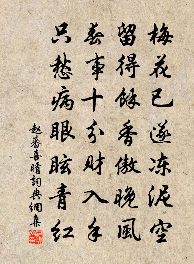 詩詞名句歷史字典書法欣賞書法字典國語詞典說文解字康熙字典古漢語字典標 題 作 者 詩 句 喜晴作者:趙蕃 朝代:宋代喜晴原文梅花已遂凍泥空,留得余香傲晚風。春事十分財入手,只愁病眼眩青紅。詩詞問答問:喜晴的作者是誰?答:趙蕃問:喜晴寫於哪個朝代?答:宋代趙蕃喜晴書法欣賞喜晴書法作品詩詞推薦如夢令(五之二)秦觀〔宋代〕遙夜沈沈如水。風系驛亭深閉。夢破鼠窺燈,霜送曉寒侵被。無寐。無寐。門外馬嘶人起。三公亭落成陶弼〔宋代〕北原喬木外,三將舊屯營。草沒金鎚蹟,山應玉管聲。路隨關地迥,江背瘴天輕。異日誰相繼,來書第四名。金剛隨機無盡頌啟唱真乘釋印肅〔宋代〕稽首一切智,圓通十方慧。無上兩足尊,法體含三世。歸命萬德師,與慈啟大悲。溥度恆沙樂,願力難恩□。解空減字木蘭花(玩月答蒙庵和詞)劉辰翁〔宋代〕何須翦紙。依舊一團圓照水。莫倚空寒。柳下池邊也只般。君何忽忽。宇宙人生都是客。月在雲端。人自愁人不解是樂居士一日舉率說和尚話頭雲撥草牛風且圖鄭剛中〔宋代〕莫疑慮,莫疑慮,順風天帆逆風住。要尋路,要尋路,直西須向東門去。但看枯藤倒掛天,山前幾度三春雨。春秋戰國門顏回周曇〔唐代〕陋巷簞瓢困有年,是時端木飫腥膻。宣尼行教何形跡,不肯分甘救子淵。梁冀二首宋庠〔宋代〕狐尾單衣漢綬長,歸來珍館看啼妝。將軍幸有封侯力,忍使秦宮令太倉。偶成二首毛滂〔宋代〕此生弱草寄輕塵,辜負南山筍蕨春。好去桃花破浪暖,清風明月不辜人。南浦思歸曾豐〔宋代〕黨論開危道,功臣發禍端。未投彭澤紱,猶著外黃冠。用是顏其厚,言之鼻似酸。薄羹鱸膾好,歸興未應闌。和羅巨濟山居十詠楊萬里〔宋代〕眼底無群子,毫端有百川。修名如揚月,餘事亦凌煙。剩欲攜藤去,相從聽雨眠。恐渠即霄漢,泉石罷潺湲。臨江仙趙長卿〔宋代〕元約三年。文卿不忍舍主,厥母不容與議,堅索之去。今失於一農夫,常常寄聲,或片紙數字問訊。仙源有感,遂苦齋記劉基〔明代〕 苦齋者,章溢先生隱居之室也。室十有二楹,覆之以茆,在匡山之巔。匡山在處之龍泉縣西南二百里,劍溪之送馬太初之越柴望〔宋代〕一去山陰一冉溪,如何還只恁分攜。雨無聊賴人無寐,水又潺湲鳥又啼。明日不知君上馬,中宵誰與共間雞。去時自龍隱岩泛舟至雉山章峴〔宋代〕晴溪幾曲度澄灣,朝涉龍巖晚雉山。林叟野僧休笑我,平生所得是官閒。仙跡岩題詩二十三首采芝術即事佚名〔宋代〕仙芝靈術總芳妍,野草閒花各變遷。古櫟復榮鬆化石,藥苗蕃植可延年。將歸留別練塘諸子陳維崧〔清代〕遊子衣邊雪,慈親地下心。都將苴杖淚,並作苦寒吟。此意復誰識?當歌難自禁。勞君霜夜彈,莫打失巢禽。成都暮雨秋(一作秋雨)戎昱〔唐代〕九月龜城暮,愁人閉草堂。地卑多雨潤,天暖少秋霜。縱慾傾新酒,其如憶故鄉。不知更漏意,惟向客邊長。謁敬亭祠張耒〔宋代〕古廟依山麓,開門石磴深。疏林歸鳴鳥,野殿宿寒陰。落日魚鹽市,豐年簫鼓音。我來無所禱,壁宇嘆塵侵。送武士曹歸蜀 士曹即武中丞兄。白居易〔唐代〕花落鳥嚶嚶,南歸稱野情。月宜秦嶺宿,春好蜀江行。鄉路通雲棧,郊扉近錦城。烏台陟岡送,人羨別時榮。金陵雜興二百首蘇泂〔宋代〕玉麟堂下柳絲絲,過了春風一半時。行到水鄉應底事,黃鶯飛上杏花枝。名句推薦驚起卻回頭,有恨無人省。蘇軾《卜運算元·黃州定慧院寓居作》 一切法無我無人無眾生無壽者。鳩摩羅什譯《金剛經·究竟無我》 善之生如春,惡之死如秋,故民勸極力而樂盡情,此之謂上下相得。韓非及後人《韓非子·守道》 唯君子為能通天下之志。佚名《易傳·彖傳上·同人》 曲終漏盡嚴具陳,月沒星稀天下旦。佚名《雞鳴歌》 教小兒宜嚴,嚴氣足以平躁氣王永彬《圍爐夜話·第八則》 解落三秋葉,能開二月花。李嶠《風》 合意客來心不厭,知音人聽話偏長。馮夢龍《警世通言·卷一》 劍河風急雪片闊,沙口石凍馬蹄脫。岑參《輪台歌奉送封大夫出師西征》 牆角數枝梅,凌寒獨自開。王安石《梅花 / 梅》