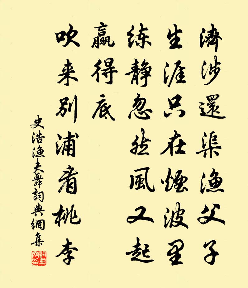 詩詞名句歷史字典書法欣賞書法字典國語詞典說文解字康熙字典古漢語字典標 題 作 者 詩 句 漁夫舞作者:史浩 朝代:宋代漁夫舞原文濟涉還渠漁父子。生涯只在煙波里。練靜忽然風又起。贏得底。吹來別浦看桃李。詩詞問答問:漁夫舞的作者是誰?答:史浩問:漁夫舞寫於哪個朝代?答:宋代問:漁夫舞是什麼體裁?答:詞史浩漁夫舞書法欣賞漁夫舞書法作品詩詞推薦普安席上作得蔗字韓維〔宋代〕羞隨輕薄兒,淚眼塵土下。朅來精舍游,置酒樂清暇。杯盤春物少,惟見杏與蔗。流陰足可惜,將子緩歸駕。寄虛室和尚釋雲岫〔宋代〕共住西山一片雲,朝昏鐘磬亦相聞。天台南嶽當時事,彼彼情懷未得論。村豪梅堯臣〔宋代〕日擊收田鼓,時稱大有年。爛傾新釀酒,飽載下江船。女髻銀釵滿,童袍毳氎鮮。里胥休借問,不信有官權。吳黃金車孫元晏〔唐代〕分擘山河即漸開,許昌基業已傾頹。黃金車與斑斕耳,早個須知入讖來。吳中書事寄漢南裴尚書皮日休〔唐代〕萬家無事鎖蘭橈,鄉味腥多厭紫虈。水似棋文交度郭,柳如行障儼遮橋。青梅蒂重初迎雨,白鳥群高欲避潮。唯望感李花梅堯臣〔宋代〕重門雖鏁春風入,先坼桃花後李花。赤白鬥妍思舊曲,舊聲傳在五王家。五王不見留華萼,華萼壞來碑缺落。當時赤壁歌鄭起〔宋代〕赤壁山,赤壁水。江有蛟龍,野有蛇虺。天蒼蒼,雲茫茫。周瑜於此走曹操,聲名萬古隨風長。點絳唇趙彥端〔宋代〕秋入闌乾,亭亭波面虹千丈。一聲魚唱。畫個三高樣。江上風波,更泛吳松浪。寒潮漲。石魚酒舫。漫叟知何向。太師汪煥章社日勸農余出湖曲葛紹體〔宋代〕春勸老農夸歲歲,晚飛新燕賀年年。鑑湖一棹煙波客,燕舞農歌伴醉眠。十六夜見月吳芾〔宋代〕連宵待月屢登城,特地遮藏不肯明。過了佳辰方皎潔,嫦娥何事太無情。四時白紵歌 冬白紵沈約〔南北朝〕寒閨晝密羅幌垂。婉容麗色心相知。雙去雙還誓不移。長袖拂面為君施。翡翠羣飛飛不息。願在雲間長比翼。佩服宮詞張公庠〔宋代〕晨光初動閣門開,百辟匆匆避路回。千步畫廊敲杖子,朱衣雙引相公來。紫麟峰趙永言〔宋代〕千仞奇峰薄上清,葛洪於此尚留名。紫麟瑞靄春風暖, * 丹成夜月明。點點蒼苔空有跡,菲菲芳草軟無聲。高蹤淳熙七年端午帖子詞皇后合六首崔敦詩〔宋代〕玉斝浮菖追令節,寶箱儲藥趁靈辰。細開角黍詢前事,應助吾皇念直臣。題劉泰娘舍孫棨〔唐代〕尋常凡木最輕樗,今日尋樗桂不如。漢高新破鹹陽後,英俊奔波遂吃虛。南柯子·山冥雲陰重王炎〔宋代〕山冥雲陰重,天寒雨意濃。數枝幽艷濕啼紅。莫為惜花惆悵、對東風。蓑笠朝朝出,溝塍處處通。人間辛苦是三農行漢水晚次神灘阻風無可〔唐代〕驚風山半起,舟子忽停橈。岸荻吹先亂,灘聲落更跳。聽松今欲暮,過島或明朝。若盡平生趣,東浮看石橋。南堂雜興陸游〔宋代〕耄齒東歸息故廬,聊持頑健托鄉閭。未忘塵尾清談興,常讀蠅頭細字書。貧甚尚能耕有犢,步輕那嘆出無驢?南堂菩薩蠻晁端禮〔宋代〕遠山眉映橫波臉。臉波橫映眉山遠。雲鬢插花新。新花插鬢雲。斷魂離思遠。遠思離魂斷。門掩未黃昏。昏黃未掩次韻李提點雪中登樓之什吳儆〔宋代〕樓高思遠入天涯,瑤海光中景象賒。未說因風翻柳絮,須看和月上梅花。山茶有句真成畫,庭柏無心不受夸。人物名句推薦今夜送歸燈火冷,河塘,墮淚羊公卻姓楊。蘇軾《南鄉子·和楊元素時移守密州》 佇倚危樓風細細。望極春愁,黯黯生天際。柳永《蝶戀花·佇倚危樓風細細》 三千年事殘鴉外,無言倦憑秋樹。吳文英《齊天樂·與馮深居登禹陵》 雪似梅花,梅花似雪。似和不似都奇絕。呂本中《踏莎行·雪似梅花》 人學始知道,不學非自然。孟郊《勸學》 因風吹火,用力不多。佚名《增廣賢文·上集》 石溪久住思端午,館驛樓前看發機。盧肇《競渡詩 / 及第後江寧觀競渡寄袁州剌史成應元》 天與秋光,轉轉情傷,探金英知近重陽。李清照《行香子·天與秋光》 遠送從此別,青山空復情。杜甫《奉濟驛重送嚴公四韻》 酹酒蒼茫,倚歌平遠,亭上玉虹腰冷。吳文英《十二郎·垂虹橋》