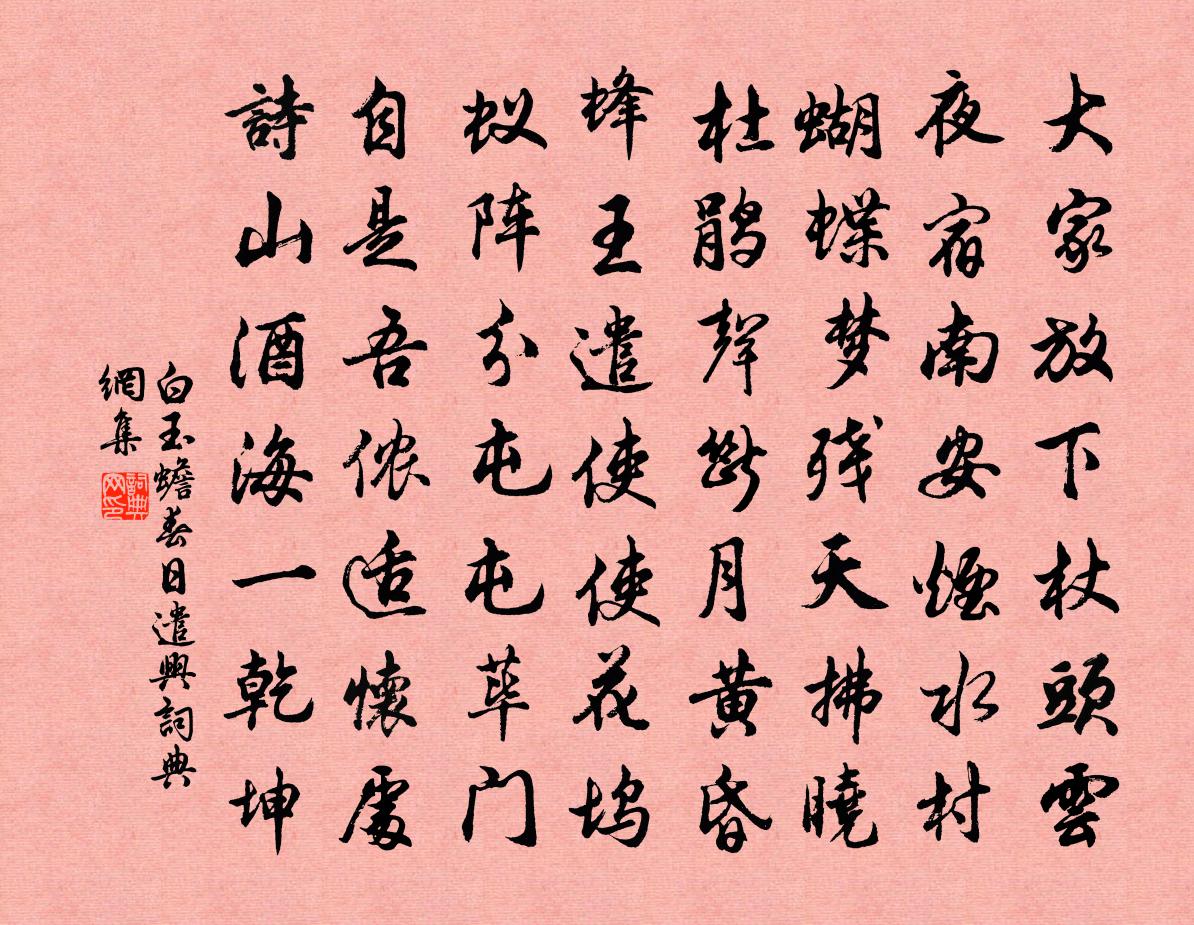 詩詞名句歷史字典書法欣賞書法字典國語詞典說文解字康熙字典古漢語字典標 題 作 者 詩 句 春日遣興作者:白玉蟾 朝代:宋代春日遣興原文大家放下杖頭雲,夜宿南安煙水村。蝴蝶夢殘天拂曉,杜鵑聲斷月黃昏。蜂王遣使使花塢,蟻陣分屯屯蓽門。自是吾儂適懷處,詩山酒海一乾坤。詩詞問答問:春日遣興的作者是誰?答:白玉蟾問:春日遣興寫於哪個朝代?答:宋代問:春日遣興是什麼體裁?答:七律白玉蟾春日遣興書法欣賞春日遣興書法作品詩詞推薦嘆征人高駢〔唐代〕心堅膽壯箭頭親,十載沙場受苦辛。力盡路傍行不得,廣張紅旆是何人。以詩並畫留別湯國頓二首蘇曼殊〔清代〕其一蹈海魯連不帝秦,茫茫煙水著浮身;國民孤憤英雄淚,灑上鮫綃贈故人。其二海天龍戰血玄黃,披髮長歌攬大有感蘇泂〔宋代〕隆冬都門歸,偃息殊未嘗。搔頭不知癢,心事但荒荒。頻年借人居,主者來在堂。飄然十五口,露處悲風霜。而予老鶴舒岳祥〔宋代〕霜瓴沾濘衣難濯,朱頂多年色退鮮。曾向青雲黃鵠舉,如今羸損啄烏田。題天柱山圖戴叔倫〔唐代〕拔翠五雲中,擎天不計功。誰能凌絕頂,看取日升東。題《李將軍傳》崔道融〔唐代〕猿臂將軍去似飛,彎弓百步虜無遺。漢文自與封侯得,何必傷嗟不遇時。林同年被檄來體訪民租寓僧舍有詩因次韻洪咨夔〔宋代〕我雖不飽尚二簋,人則何辜無一襦。官儂早下減租筆,天下可肥身寧臞。素上人遊方薛嵎〔宋代〕山深不可見,一錫又雲飛。梵譯通方語,林霜點衲衣。神閒生境寂,思基入吟微。寒月空相照,何人夜扣扉。喜遷鶯(壽薛樞密)程珌〔宋代〕去年玉燕,記曾期今歲,瑤光入度。今日都人,從頭屈指,儘是黑頭公輔。爭道一朝語合,誰信千齡際遇。更積雨菩薩蠻(殘春)趙長卿〔宋代〕楊花飛盡鶯聲澀。杜娟喚得春歸急。病酒起來遲。嬌慵懶畫眉。寶奩金鴨冷。重喚燒香餅。著意煉龍涎。纖縴手逴病中雜興五言十首劉克莊〔宋代〕佛以滅為樂,觀身身一漚。如何盧行者,鎔鐵護枯髏。宿錢塘江詩林季仲〔宋代〕大江推月上層霄,夜色分人此最饒。鄉國未成千里夢,海門又捲五更潮。偈頌六十七首釋原妙〔宋代〕參須實參,悟須實悟。動轉施為,輝今耀古。若是操心不正,悟處不真。妝妝點點,鬥鬥釘釘,被人輕輕拶著,未六州佚名〔宋代〕寰宇定,四海奉文思。書軌混,梯航湊,共戴昌期。稽古典、方詠京坻。耕籍豐民稼,敦本農時。陳羽衛、日月旌和司徒侍中壬子寒食會壓沙寺詩二首強至〔宋代〕四照梨花一色中,他時珍賞有雌雄。高牙就景開芳宴,皓齒停歌誦正風。樂極光陰窮日御,詩成造化奪春工。佳辰卜運算元(李季允曾為白芙蕖賦卜運算元至是久旱得雨借前韻有賦)魏了翁〔宋代〕風雨滿空霏,總得江山妙。洗出湖光鏡似明,不受纖塵涴。心事竟堪憑,天意真難料。呼吸豐年傾刻間,也合軒渠浯溪俞掞〔宋代〕宋朝一統舊江山,南北中分已百年。壯士不須夸此頌,健提椽筆上燕然。和劉後村梅花百詠方蒙仲〔宋代〕痴兒安得妄評彈,剛道空花用處難。最是香能蠲客醉,更如玉可滅人瘢。別後黃滔〔唐代〕夢裡相逢無後期,煙中解杳何之。虧蟾便是陳宮鏡,莫吐清光照別離。寄興衛宗武〔宋代〕杜門世事不須聞,一任如棋局自新。多病不妨為壽考,餘生更喜作閒人。居今野處黃冠日,記昔郊行紅旆春。須褒名句推薦酒亂性,色迷人。施耐庵《水滸傳·第四十五回》 可憐青冢已蕪沒,尚有哀弦留至今。王安石《明妃曲二首》 巧詐不如拙誠。韓非及後人《韓非子·說林上》 更落盡梨花,飛盡楊花,春也成憔悴。汪元量《鶯啼序·重過金陵》 忍淚不能歌,試托哀弦語晏幾道《生查子·墜雨已辭雲》 善無主於心者不留,行莫辯於身者不立。墨子《墨子·02章 修身》 日出入安窮?時世不與人同。佚名《日出入》 酒不醉人人自醉,色不迷人人自迷。馮夢龍《警世通言·卷二十四》 事不至大,無以驚人。案不及眾,功之匪顯。來俊臣《羅織經·瓜蔓卷第十二》 驅雞上樹木,始聞叩柴荊。杜甫《羌村三首·其三》