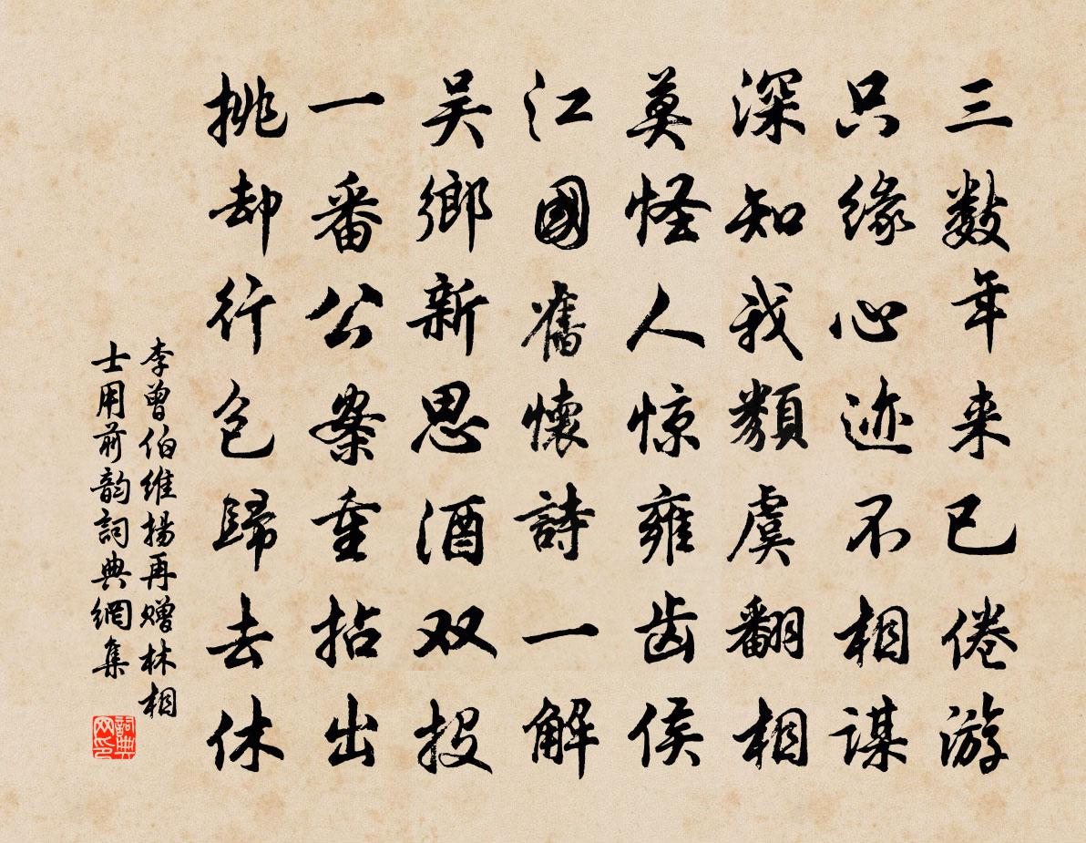 詩詞名句歷史字典書法欣賞書法字典國語詞典說文解字康熙字典古漢語字典標 題 作 者 詩 句 維揚再贈林相士用前韻作者:李曾伯 朝代:宋代維揚再贈林相士用前韻原文三數年來已倦遊,只緣心跡不相謀。深知我類虞翻相,莫怪人驚雍齒侯。江國舊懷詩一解,吳鄉新思酒雙投。一番公案重拈出,挑卻行包歸去休。詩詞問答問:維揚再贈林相士用前韻的作者是誰?答:李曾伯問:維揚再贈林相士用前韻寫於哪個朝代?答:宋代李曾伯維揚再贈林相士用前韻書法欣賞維揚再贈林相士用前韻書法作品詩詞推薦塞上蒙汝州任中丞寄書薛能〔唐代〕三省推賢兩掖才,關東深許稍遲回。舟浮汝水通淮去,雨出嵩峰到郡來。投札轉京憂不遠,枉緘經虜喜初開。西樓點絳唇佚名〔宋代〕堪嗟人人,波波劫劫貪名利。何時已。眼光落地。到此才方悔。雖有兒孫,要替應難替。思下淚。這場滋味。認著過秀州城東方回〔宋代〕海邑疏囚昔此過,鳴榔未了又漁歌。重來野色秋如許,似覺人家舊更多。晴日茅檐橫曬布,水田竹架倒扦禾。吳儂偈頌六十首釋曇華〔宋代〕藥山道頭,雲岩知尾。雖然頭尾相稱,要且不知羞恥。題旅舍壁陸游〔宋代〕老子殘年未易量,出門隨處得彷徉。窗欞日淡僧房暖,灶突煙青旅甑香。濁酒可求敲野店,舊題猶在拂頹牆。閒來春雨絕句陸游〔宋代〕梅中最晚是緗梅,一日來看欲百回。俗紫凡紅終避舍,不妨自向雨中開。冷泉觀放水史衛卿〔宋代〕溪流平地響晴雷,石上生風捲雪來。醉拍闌乾衣袖濕,十分身在白雲堆。忠獻韓公輓辭二首王安石〔宋代〕心期自與眾人殊,骨相知非淺丈夫。獨斡斗杓環帝座,親扶日轂上天衢。鋤耰萬里山無盜,袞繡三朝國有儒。爽氣送竹軒歸越趙汝績〔宋代〕東風隔岸擊歸航,怕送君行重憶鄉。為探山台牆下柳,新來添得幾絲黃。送林復夢赴韋令辟元稹〔唐代〕蜀路危於劍,憐君自坦途。幾回曾啖炙,千里遠銜珠。野性便荒飲,時風忌酒徒。相門多禮讓,前後莫相逾。西坡項安世〔宋代〕西坡仙去漪嵐在,重到堂中廿二年。依舊廬山當左闔,新添濠水注前川。渾無障礙千峰處,長有澄鮮萬頃天。但得登樓三首狄遵度〔宋代〕道之不行乘桴浮,赴河蹈海成今游。春歸應到嶺北樹,日出先照天南樓。大雨中作陸游〔宋代〕北風撼山勢岌岌,老夫倚杖檐前立,貪看白雨掠地風,飄灑不知衣盡濕。當年入朝甫三十,十丈胡塵叩江急,屬聞久欲乞歸未得一日蒙恩放歸不勝欣喜塗中得十吳芾〔宋代〕記得年時入境來,老分閫寄懼非才。今朝遂出洪都去,笑指故山真快哉。吳中秋日周文璞〔宋代〕郊原落葉已離離,尚有孤花闖短籬。小醉不成憐病後,苦吟未了說愁時。鬥雞走狗爰絲喜,臨水登山宋玉悲。豆角無事宋伯仁〔宋代〕日日溪頭看好山,塵囂無一可相關。梅花未必能如我,花謝花開未得閒。山游遇雨李彌遜〔宋代〕杖藜尋勝復中休,不比紅塵走燕騮。幽趣未窮隨雨斷,高情無盡與雲浮。冥冥深樹秋猶暗,獵獵新蒲暖更柔。老去頌古二十首釋道顏〔宋代〕門外依然雨滴聲,萬般巧說爭如實。平生心膽向人傾,相見還同不相識。感皇恩(鎮江待閘)毛滂〔宋代〕綠水小河亭,朱闌碧甃。江月娟娟上高柳。畫樓縹緲,盡掛窗紗簾繡。月明知我意,來相就。銀字吹笙,金貂取酒青玉案尹志平〔元代〕心頭遠惡常修善。自得真方便。至道夷然容易見。目前端正,是非休論,堪作長生伴。玄言悟徹無分辯。默默頤真名句推薦但使情親千里近,須信。無情對面是山河。辛棄疾《定風波·席上送范廓之游建康》 翅低白雁飛仍重,舌澀黃鸝語未成。白居易《南湖早春》 出於其類,拔乎其萃。孟子《孟子·公孫丑章句上·第二節》 宦情羈思共淒淒,春半如秋意轉迷柳宗元《柳州二月榕葉落盡偶題》 春潮帶雨晚來急,野渡無人舟自橫。韋應物《滁州西澗》 禮以行義,義以生利,利以平民,政之大節也。左丘明《左傳·成公·成公二年》 銀鞍照白馬,颯沓如流星。李白《俠客行》 凌余陣兮躐余行,左驂殪兮右刃傷。屈原《國殤》 不用思量今古,俯仰昔人非。蘇軾《八聲甘州·寄參寥子》 窮猿投林,豈暇擇木!房玄齡《晉書·列傳·第六十二章》