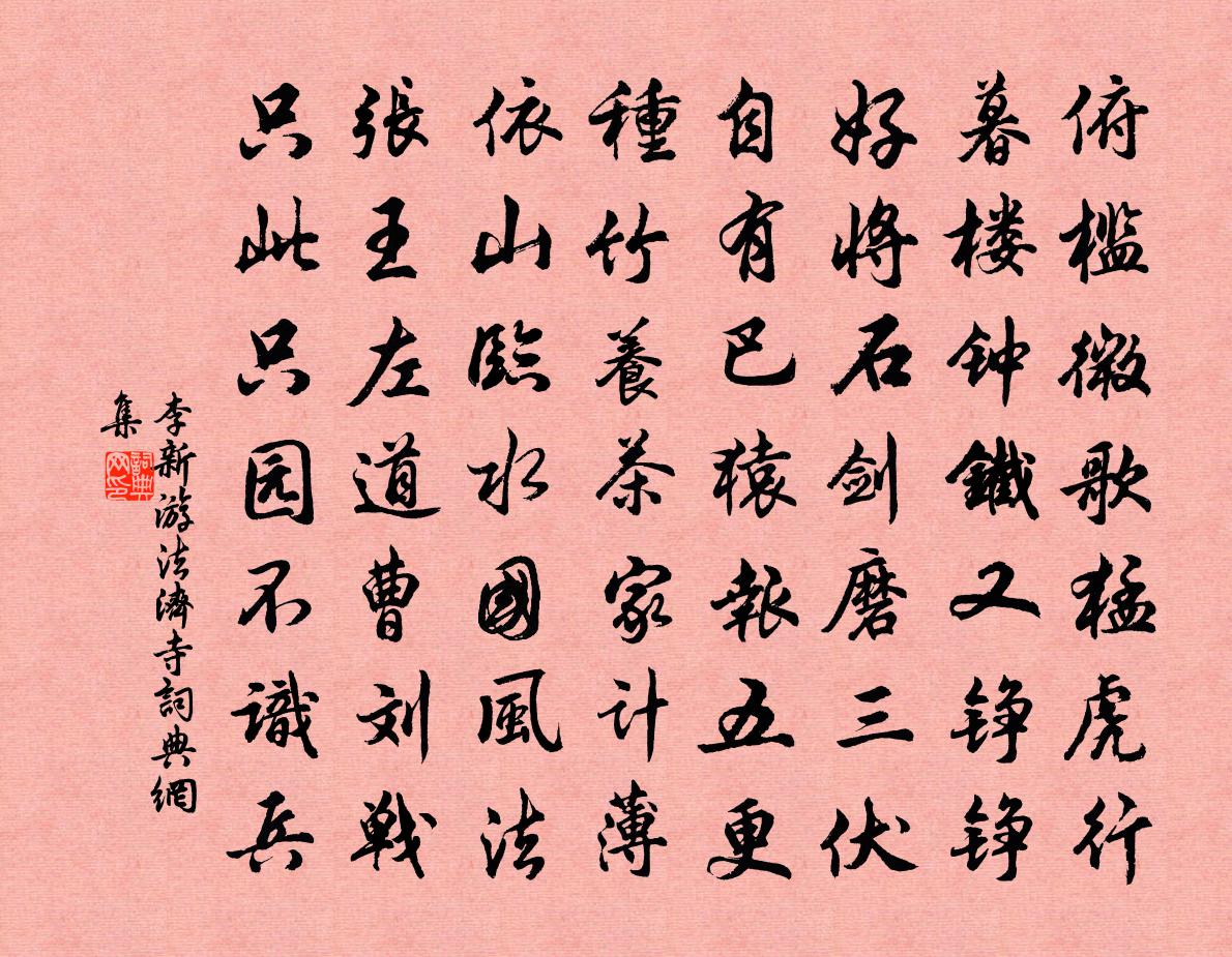 詩詞名句歷史字典書法欣賞書法字典國語詞典說文解字康熙字典古漢語字典標 題 作 者 詩 句 游法濟寺作者:李新 朝代:宋代游法濟寺原文俯檻微歌猛虎行,暮樓鍾鐵又錚錚。好將石劍磨三伏,自有巴猿報五更。種竹養茶家計薄,依山臨水國風法。張王左道曹劉戰,只此只園不識兵。詩詞問答問:游法濟寺的作者是誰?答:李新問:游法濟寺寫於哪個朝代?答:宋代李新游法濟寺書法欣賞游法濟寺書法作品詩詞推薦哭王幾道職方三首梅堯臣〔宋代〕我今過五十,萬事日消磨。熟識世間寡,故交泉下多。葉秋知易隕,松耐竟如何。嘗亦悲前哲,荒墳野鼠窠。僑寄山居霍然幾月凡見之於目聞之於耳者輒綴王志道〔宋代〕羃羃黃雲麥壠秋,牧童橫笛倒騎牛。百爹飼養痢葫蘆扇,持向田頭蔽日頭。感老陸游〔宋代〕人生六十已為衰,況我頹齡及耄期。對酒尚如年少日,愛書不減布衣時。遠遊每動辭家興,大藥方從出世師。但向雪寒陳著〔宋代〕巫山神女欲回車,滕六留雲布玉華。流水不冰翻有氣,老梅雖凍自宜花。幸逃僵死榆關戍,相伴飢眠草屋家。種麥和范景仁王景彝殿中雜題三十八首並次韻其三梅堯臣〔宋代〕誰人重詠大刀頭,只顧長明不願流。縱使西傾必東出,寧同寒水瀉宮溝。梨花陸游〔宋代〕粉淡香清自一家,未容桃李占年華。常思南鄭清明路,醉袖迎風雪一杈。晝睡陸游〔宋代〕書獄徵租自笑忙,暫歸聊得憩匡床。屏圖夜雨孤舟句,枕帶秋風九日香。一卷蠹書棲倦手,數聲殘角報斜陽。清泉落葉周端臣〔宋代〕西風不管鵲巢寒,成陣飄來響更乾。最是山房秋思客,夢回疑作雨聲看。將至古渝虞憲以三絕同端午節見寄用韻為謝魏了翁〔宋代〕鬢邊憂緒已千端,誰喚扁舟下濮乾。落日明舡劍如電,勇心觸撥到樓蘭。運司園亭玉溪堂杜敏求〔宋代〕堂前對花柳,堂後瞰沼沚。賢者堂中人,虛心湛如水。煩暑當風窗,中宵隱月風。作詩紀勝概,詩與水清泚。僧畫華岳〔宋代〕萬景峰前老禪叔,搜羅風月歸岩谷。胸中有句吐無聲,寫作生綃三四幅。作雨不成終夜極涼時去立秋五日也陸游〔宋代〕雲映星芒澹,風闌雨腳回。體輕知病去,氣爽喜秋來。疏放拋烏帢,歌呼覆綠杯。東歸定何日?灩澦欲崔嵬。村邊以湯婆樣惠示與詩俱來依元韻鄭清之〔宋代〕惠中秀外更清便,婭奼嬌羞二八年。無奈畏塗生衽席,寧教寒夜折冰綿。遣來勣嫗知君狀,擬伴涪翁到曉天。只恐和鄭貳卿別賦王洋〔宋代〕病逐秋風至,年隨塞草衰。家如百年夢,身入四愁詩。北焙聯圭璧,南薰潤岳池。齋房多勝事,可但滑琉璃。碧落洞(在英州下十五里。)蘇軾〔宋代〕槎牙亂峰合,晃蕩絕壁橫。遙知紫翠間,古來仙釋並。陽崖射朝日,高處連玉京。陰谷叩白月,夢中游化城。果然大觀祀社稷九首佚名〔宋代〕[黃鐘二奏]惟土之尊,民食資焉。險祀昭格,牲牢腥翔。有功於民,告其吉蠲。神之來享,雲車翩翩。漁家傲梵琦〔元代〕聽說西方無量樂。娑婆已悔從前錯。佛號自呼還自訥。思量著。惟心淨土誰雲隔。一貫由來雙五百。嬰兒謾把空拳論詩三十首·其二元好問〔金代〕曹劉坐嘯虎生風,四海無人角兩雄。可惜并州劉越石,不教橫槊建安中。正紀見遺梅花雲春信數醞釀輒分風月以助清樽郭印〔宋代〕水中疏影月中香,枯樹前頭獨自芳。不有幽人時賞玩,誰傳春信及寒鄉。送客洞庭西楊維楨〔元代〕送客洞庭西,雷堆青兩兩。陳殿出空明,吳城連蒼莽。春隨湖色深,風將潮聲長。揚柳讀書堂,芙蓉采菱槳。懷人名句推薦又莫是東風逐君來,便吹散眉間一點春皺蘇軾《洞仙歌·詠柳》 風吹柳花滿店香,吳姬壓酒喚客嘗。李白《金陵酒肆留別》 山檣谷塹依然在,弱吐強吞盡已空。杜牧《題武關》 茶有九難:一曰造,二曰別,三曰器,四曰火,五曰水,六曰炙,七曰末,八曰煮,九曰飲。陸羽《茶經·六之飲》 河海不擇細流,故能就其深;李斯《諫逐客書》 但東望、故人翹首。戴復古《賀新郎·寄豐真州》 上窮碧落下黃泉,兩處茫茫皆不見。白居易《長恨歌》 北郭清溪一帶流,紅橋風物眼中秋,綠楊城郭是揚州。王士禎《浣溪沙·紅橋》 蜂爭粉蕊蝶分香,不似垂楊惜金縷。溫庭筠《惜春詞》 鏡湖三百里,菡萏發荷花。李白《子夜吳歌·夏歌》