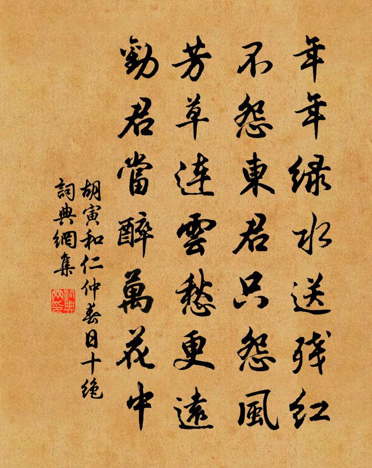 詩詞名句歷史字典書法欣賞書法字典國語詞典說文解字康熙字典古漢語字典標 題 作 者 詩 句 和仁仲春日十絕作者:胡寅 朝代:宋代和仁仲春日十絕原文年年綠水送殘紅,不怨東君只怨風。芳草連雲愁更遠,勸君當醉萬花中。詩詞問答問:和仁仲春日十絕的作者是誰?答:胡寅問:和仁仲春日十絕寫於哪個朝代?答:宋代胡寅和仁仲春日十絕書法欣賞和仁仲春日十絕書法作品詩詞推薦送朱仲遠樊唐老趨闕奉大對郭印〔宋代〕充城環髡山,南嶺獨秀郁。何以獲佳稱,上有朱鳳集。三載爭一鳴,朝陽整雲翮。今年二妙飛,好語哄邦邑。為言敬和九鎖步虛詞洞微鎖趙汝湜〔宋代〕大道不容言,有滯還有鞿。返本含元造,竟達無上機。希夷絕視聽,得一眾甫歸。向來寢虛師,至訣殊精微。武陵春楊萬里〔宋代〕長鋏歸乎逾十暑,不著鵕鸃冠。道是今年勝去年。特地減清歡。舊賜龍團新作祟,頻啜得中寒。瘦骨如柴痛又酸。宣州雜詩二十首梅堯臣〔宋代〕三洲灘口急,兩水渡頭來。下過桓彝宅,上通嚴子台。潺湲瀉寒月,晃漾照春梅。白鷺驚起處,魚多見底回。諸公和淵明止酒詩因同賦陳與義〔宋代〕愛河漂一世,既溺不能止。不如淡生活,吟詩北窗里。肺肝亦何罪,困此毛錐子。不如友麯生,是子差可喜。三杯首夏病間白居易〔唐代〕我生來幾時?萬有四千日。自省於其間,非憂即有疾。老去慮漸息,年來病初愈。忽喜身與心,泰然兩無苦。況茲楚竹吟酬盧虔端公見和湘弦怨孟郊〔唐代〕握中有新聲,楚竹人未聞。識音者謂誰,清夜吹贈君。昔為瀟湘引,曾動瀟湘雲。一叫鳳改聽,再驚鶴失群。江花【不知宮調】甜水令佚名〔元代〕麻絛草履風袍袖,名利不剛求。蓑笠綸竿釣魚鉤,綠水東流。 爐中煉出靈丹藥,雷震採茶苗。明月清風杖頭挑病起白玉蟾〔宋代〕我愛山水清,淘洗詩中俗。朅來山水間,白晝臥茅屋。天公知此癖,復還我以病。病中翫山水,詩句覺愈勝。我欲懷林維國二首劉宰〔宋代〕四海論交二十年,知心一見似前緣。情親尚記通宵語,忠告難忘送別篇。夢入蓬壺重會面,座看書史尚堆前。應憐夏景端居即事韋應物〔唐代〕北齋有涼氣,嘉樹對層城。重門永日掩,清池夏雲生。遇此庭訟簡,始聞蟬初鳴。逾懷故園愴,默默以緘情。二十一日湖中趙蕃〔宋代〕歲晚仍湖路,客中還病身。似聞今大熟,那故獨長貧。方朔一囊栗,季鷹千里蓴。扁舟固高蹈,金馬亦沉淪。詩一首釋文兆〔宋代〕河分崗勢司空曙,春入燒痕劉長卿。不是師兄偷古句,古人詩句犯師兄。寄育王東生和尚釋雲岫〔宋代〕三十餘年無故人,只留雲外伴間身。夜來夢入宸奎閣,戶牖重開見日輪。臨碣石曹勛〔宋代〕陟彼崇高,慨覽遐宇。前跡可究,興亡可悟。安得英雄,廓彼神武。澤及飛沉,致馨梁甫。鵲橋仙(寄季順妹)佚名〔宋代〕星移斗轉,玉蟾西下,漸覺東效向曉。馬嘶人語隔霜林,望千里、長安古道。珠宮姊妹,相逢方信,別後十分瘦了浪淘沙高道寬〔元代〕稽首眾神仙。勘破乾坤。九真息出運江煙。箭射紅心師資準,贏得周天。方外采汞鉛。丹藥雙全。一般訊息兩般玄久過重陽菊英粲然即事十首方回〔宋代〕早伴茱萸插帽紗,尚堪薦酒更堪茶。花邊行立花邊坐,不是閒花是菊花。何季皋司理故人也作詩見相勉意二首戴復古〔宋代〕梅花庾嶺外,別是一山川。那使民無訟,須知獄有冤。心常存正直,法不尚平反。于氏緣何事,陰功到子孫。田家即事八首趙蕃〔宋代〕社鼓村村急,春流岸岸高。雙分待魚鷺,紅認隔溪桃。名句推薦油壁香車不再逢,峽雲無跡任西東。晏殊《無題·油壁香車不再逢》 嘆隙中駒,石中火,夢中身。蘇軾《行香子·述懷》 待把酒送君,恰又清明後。何夢桂《摸魚兒·記年時人人何處》 為學日益,為道日損。損之又損,以至於無為。老子《老子·德經·第四十八章》 十有九人堪白眼,百無—用是書生。黃景仁《雜感》 故木受繩則直,金就礪則利,君子博學而日參省乎己,則知明而行無過矣。荀子《荀子·勸學》 舍南舍北皆春水,但見群鷗日日來。杜甫《客至》 明月黃河夜,寒沙似戰場。李流芳《黃河夜泊》 重五山村好,榴花忽已繁。陸游《乙卯重五詩》 亂石穿空,驚濤拍岸,捲起千堆雪。蘇軾《念奴嬌·赤壁懷古》