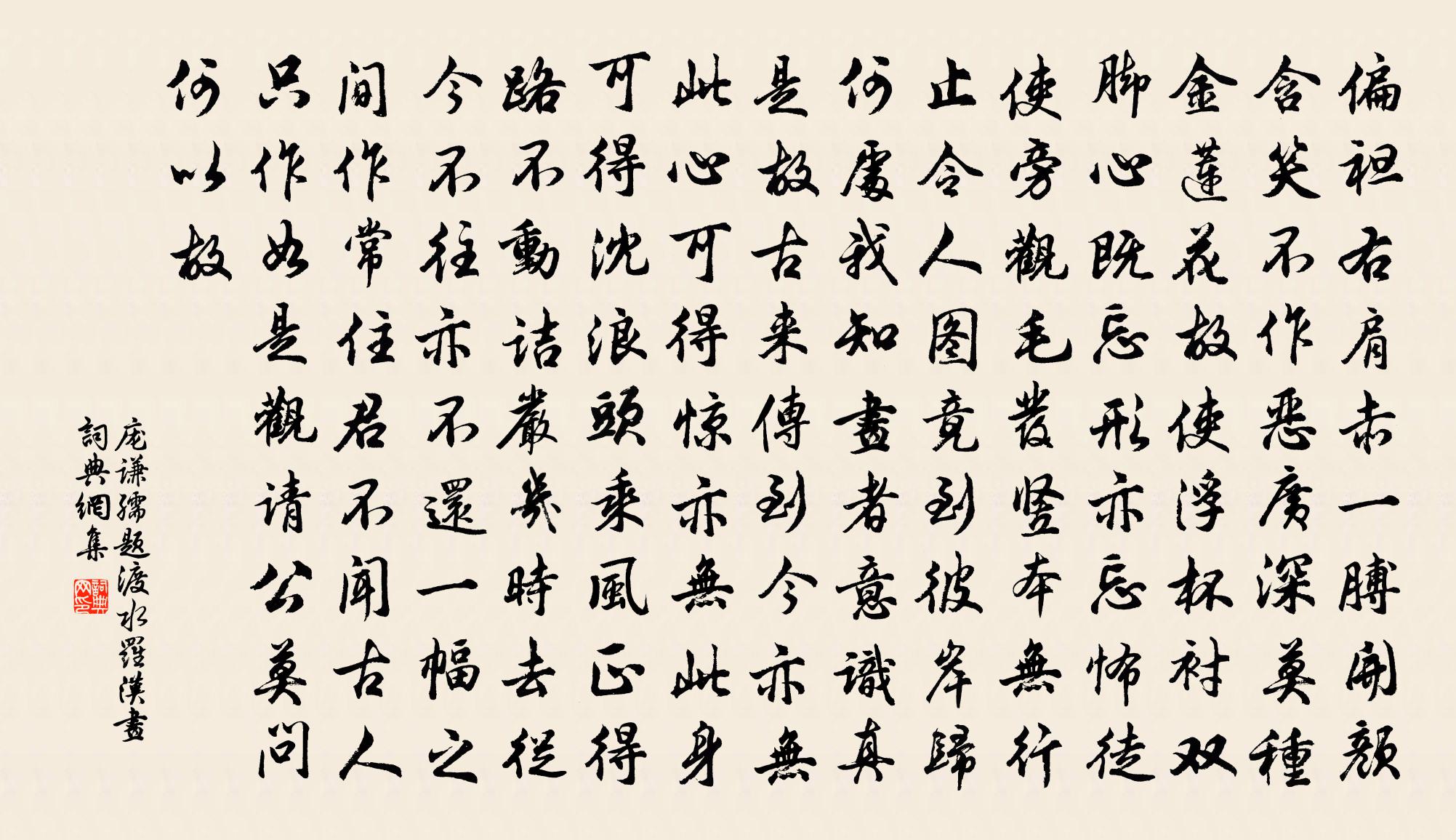詩詞名句歷史字典書法欣賞書法字典國語詞典說文解字康熙字典古漢語字典標 題 作 者 詩 句 題渡水羅漢畫作者:龐謙孺 朝代:宋代題渡水羅漢畫原文偏袒右肩赤一膊,開顏含笑不作惡。廣深莫種金蓮花,故使浮杯襯雙腳。心既忘形亦忘怖,徒使旁觀毛髮豎。本無行止令人圖,竟到彼岸歸何處。我知畫者意識真,是故古來傳到今。亦無此心可得驚,亦無此身可得沈。浪頭乘風正得路,不動詰嚴幾時去。從今不往亦不還,一幅之間作常住。君不聞古人只作如是觀,請公莫問何以故。詩詞問答問:題渡水羅漢畫的作者是誰?答:龐謙孺問:題渡水羅漢畫寫於哪個朝代?答:宋代龐謙孺題渡水羅漢畫書法欣賞題渡水羅漢畫書法作品詩詞推薦偈頌一百三十六首釋惟一〔宋代〕雨滴空階,溪流新漲。風起天末,葉墜疏林。喚作物卻非物,喚作心不是心。缺齒老胡會不得,九年面壁空沉吟。鵲橋仙張野〔元代〕無窮前古,無窮後世。分得中間百歲。人生七十古來稀,況 * 、不如人意。榮枯夢幻,功名兒戲。爭甚一時閒氣答曾進士周銓〔宋代〕死易程嬰豈不知,十年後死不為非。文辭未便改秦館,敲朴徒能抱御衣。無志何須悲廟黍,得仁便不食山薇。儒冠相和歌辭堂堂溫庭筠〔唐代〕錢塘岸上春如織,淼淼寒潮帶晴色。淮南遊客馬連嘶,碧草迷人歸不得。風飄客意如吹煙,纖指殷勤傷雁弦。一曲裴令公見示誚樂天寄奴買馬絕句斐言仰和且戲樂天劉禹錫〔唐代〕常奴安得似方回,爭望追風絕足來。若把翠娥酬騄耳,始知天下有奇才。送化主釋崇岳〔宋代〕勞生擾擾夢喧譁,夢破喧譁也大差。雲淨水天江上望,一輪皎潔落誰家。次韻張守酴醾二首劉子翬〔宋代〕退食黃堂喜自公,不妨幽興囑芳叢。雙旌不出閒春晝,大筆微吟綴祖風。老矣交朋今日少,飄然遊宦異鄉同。杖藜過開封古城梅堯臣〔宋代〕荒城臨殘日,雞犬三四家。豈復古阡陌,但問新桑麻。頹垣下多穴,所窟狐與蛇。漢兵墮銅鏃,青血為土花。葉秘書溫知蜀州江原縣楊億〔宋代〕秘省丞郎出字人,錦江偏好濯纓塵。酒壚千古風流地,花縣三年爛熳春。白羽豫州慵草檄,青天蜀道厭摧輪。巴猿詩陸機〔魏晉〕瓮余殘酒。膝有橫琴。山店松聲二首楊萬里〔宋代〕松本無聲風亦無,適然相值兩相呼。非金非石非絲竹,萬頃雲濤殷五湖。和酬社從事題壁林逋〔宋代〕弭蓋入衡宇,相看情獨深。蕭疏秋樹色,老大故人心。佳話頻移晷,清飆幾拂襟。寥然長卿壁,題此比兼金。隕星石秦觀〔宋代〕蕭然古丘上,有石傳隕星。胡為霄漢間,墜地成此精。雖有堅白姿,塊然誰汝靈。犬眼牛礪角,終日蒙膻腥。疇昔再賦流觴亭秦觀〔宋代〕仙山游觀甲寰瀛,不比人間自雨亭。歌斷瑤池雲杳杳,酒行金谷水泠泠。珠簾卷雨驚秋近,羅襪凌波笑客醒。月下郊廟歌辭。享太廟樂章。長發舞佚名〔唐代〕睿哲維唐,長發其祥。帝命斯祐,王業克昌。配天載德,就日重光。本支百代,申錫無疆。勝仲少卿公岩桂並詩二絕用韻和之鄭剛中〔宋代〕搖風暗綠疏疏中,困日輕黃小小花。細認幽香已清絕,更隨膏馥出君家。和子瞻渦口遇風蘇轍〔宋代〕長淮暮生風,來自渦河口。新舟雖雲固,波浪亦難受。詩來話艱厄,驚恐及兒婦。憶同溯荊峽,終夜愁石首。余飈賀新郎(題趙兼善東山園小魯亭)辛棄疾〔宋代〕下馬東山路。恍臨風、周情孔思,悠然千古。寂寞東家丘何在,縹緲危亭小魯。試重上、岩岩高處。更憶公歸西悲相和歌辭。短歌行二首白居易〔唐代〕曈曈太陽如火色,上行千里下一刻。出為白晝入為夜,圜轉如珠住不得。住不得,可奈何,為君舉酒歌短歌。歌聲湖州歌九十八首 其十六汪元量〔宋代〕暮雨瀟瀟酒力微,江頭楊柳正依依。宮娥抱膝船窗坐,紅淚千行濕繡衣。名句推薦別後不知君遠近。觸目淒涼多少悶。歐陽修《玉樓春·別後不知君遠近》 肅肅花絮晚,菲菲紅素輕。杜甫《春遠 / 春運》 昨夜風兼雨,簾幃颯颯秋聲。李煜《烏夜啼·昨夜風兼雨》 君子恥不修,不恥見污。荀子《荀子·非十二子》 山城過雨百花盡,榕葉滿庭鶯亂啼。柳宗元《柳州二月榕葉落盡偶題》 凡兵戰之場,立屍之地,必死則生,幸生則死。吳起《吳子·治兵》 年來腸斷秣陵舟,夢繞秦淮水上樓王士禎《秦淮雜詩二十首·其一》 世之道,人不自害而人害也;人之道,人不恕己而自恕也。來俊臣《羅織經·保身卷第七》 遠夢歸侵曉,家書到隔年。杜牧《旅宿》 樓上黃昏欲望休,玉梯橫絕月中鉤李商隱《代贈二首》