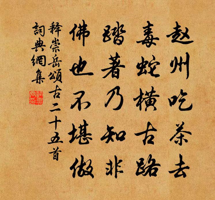 詩詞名句歷史字典書法欣賞書法字典國語詞典說文解字康熙字典古漢語字典標 題 作 者 詩 句 頌古二十五首作者:釋崇岳 朝代:宋代頌古二十五首原文趙州吃茶去,毒蛇橫古路。踏著乃知非,佛也不堪做。詩詞問答問:頌古二十五首的作者是誰?答:釋崇岳問:頌古二十五首寫於哪個朝代?答:宋代釋崇岳頌古二十五首書法欣賞頌古二十五首書法作品詩詞推薦遲暮陸游〔宋代〕遲暮固多感,況此歲崢嶸。霜霰忽已集,夜聞絡緯鳴。青燈不解語,依依有餘情。銅瓶煮寒泉,中作笙簫聲。沈憂莊宗宣興化問答圖贊釋智愚〔宋代〕君臣慶會豁余機,百億山河盡貢歸。拈起太平無價寶,乾坤何處不光輝。六朝門宣帝周曇〔唐代〕宣帝驕奢恣所為,後宮升降略無時。乘危自有妻公在,安許鸞凰是尉遲。籠鷹詞張耒〔宋代〕八月獲黍霜野空,蒼鷹羽齊初出籠。劍翎鉤爪目如電,利吻新淬龍泉鋒。少年臂爾平郊去,草動人呼躍寒兔。竦身愧魚亭孔武仲〔宋代〕昔聞魚可羨,今見魚可愧。邂逅臨池處,瀟灑出塵意。秋風八月起江湖,水染紺碧霞綺疏。悠然掉尾波間去,須信三昧諸頌釋印肅〔宋代〕佛共眾生只此心,悟迷不間古同今。千名萬字何交涉,達法圓光許一針。水調歌頭(次黃舜舉登姑蘇台韻)袁去華〔宋代〕吳門古都會,疇昔記曾游。輕帆卸處,西風吹老白苹洲。試覓姑蘇台榭,尚想吳王宮闕,陸海跨鰲頭。西子竟何許春晚喻良能〔宋代〕春及瓜期夏景生,鳴蟬漸欲替啼鶯。蜂臣飛急沖殘絮,蟻子行忙礙落英。頌古十八首釋師一〔宋代〕張弓架箭幾何年,接得三平機不全。若使當時能羿射,免教落節向弓弦。冷泉亭陳允平〔宋代〕西竺峰飛小朵來,閒僧曾共倚崔嵬。寒驚玉匣光初瀉,曉層冰壺凍未開。雲外有香丹桂落,洞中無月白猿哀。當年懷舊詩 傷王融沈約〔南北朝〕元長秉奇調。弱冠慕前蹤。眷言懷祖武。一簣望成峯。途艱行易跌。命舛志難逢。折風落迅羽。流恨滿青松。用韻寄孫推官二首趙蕃〔宋代〕淚垢悲啼失母雛,可思營室共銜蕪。未能因事賦歸去,尚此折腰成走趨。豈謂微官堪顧藉,不難征路指虛無。重輕南柯子(丙申重九)黃升〔宋代〕蘭佩秋風冷,茱囊曉露新。多情多感怯芳辰。強折黃花來照、碧粼粼。落帽參軍醉,空樽靖節貧。世間那復有斯人題丹灶四首耿南仲〔宋代〕始知勾漏地,猶勝步兵營,往躅今誰繼,遊人空慕名。送劉公求還廬陵兼屬張元亨五首趙蕃〔宋代〕世有封胡羯末,非無觸目琳琅。何似君家兄弟,睟然面背難藏。詩一首陳亞〔宋代〕張公吃酒李公醉,自古人言信有之。陳亞今年新及第,滿城人賀李衙推。頌古十八首釋寶印〔宋代〕山之峨峨,水之湯湯。冷眼覷著,無處慚惶。次韻和吳侍郎再葺東亭兼懷晁公舊隱宋庠〔宋代〕地占心齋舊,天扶藥喜身。高懷聊避寵,幽境更隨人。樹密添新籟,叢香續故春。婆娑榮路友,偏倚此相親。寄袁校書(一作袁都校書)許渾〔唐代〕擾擾換時節,舊山琪樹陰。猶乖清漢志,空負白雲心。廣陌埃塵遠,重門管吹深。勞歌極西望,芸省有知音。金菊對芙蓉馮取洽〔宋代〕寶鏡緣空,玉簪點水,盪搖千頃寒光。正江妃月姊,斗理明妝。扶闌一笑開詩眼,少容我、吟諷其旁。一川風露,名句推薦今日斗酒會,明旦溝水頭。卓文君《白頭吟》 爭教清淚不成冰?好處便輕別。納蘭性德《好事近·簾外五更風》 一去無訊息,那能惜馬蹄。薛道衡《昔昔鹽》 編草結庵,不違涼暑。蕭子顯《南齊書·列傳·卷四十》 柳花深巷午雞聲,桑葉尖新綠未成。范成大《春日田園雜興》 凡與敵戰,若敵人初來,陣勢未定,行陣未整,先以兵急擊之,則勝。佚名《百戰奇略·第四卷·先戰》 山上層層桃李花,雲間煙火是人家。劉禹錫《竹枝詞九首·其九》 有孫母未去,出入無完裙。杜甫《石壕吏》 絕頂茅庵里,老衲正孤吟。納蘭性德《水調歌頭·題西山秋爽圖》 人之過誤宜恕,而在己則不可恕洪應明《菜根譚·概論》
