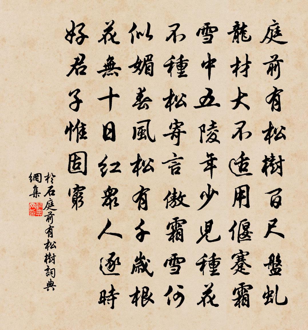 詩詞名句歷史字典書法欣賞書法字典國語詞典說文解字康熙字典古漢語字典標 題 作 者 詩 句 庭前有松樹作者:於石 朝代:宋代庭前有松樹原文庭前有松樹,百尺盤虬龍。材大不適用,偃蹇霜雪中。五陵年少兒,種花不種松。寄言傲霜雪,何似媚春風。松有千歲根,花無十日紅。眾人逐時好,君子惟固窮。詩詞問答問:庭前有松樹的作者是誰?答:於石問:庭前有松樹寫於哪個朝代?答:宋代於石庭前有松樹書法欣賞庭前有松樹書法作品詩詞推薦三月二十日開園三首蘇軾〔宋代〕西園牡龠夜沉沉,尚有遊人臥柳陰。鶴睡覺時風露下,落花飛絮滿衣襟。黃兵部生辰仲並〔宋代〕地上泉流府庫充,艱難天與歲時豐。他時若論關中漕,合數蕭何第一功。鹹陽劉棐〔宋代〕父老壺漿迓義旗,亡秦誰復為秦悲。不曾 * 曾蒙德,十二金人各淚垂。丙寅十四首效韋蘇州黃庭堅〔宋代〕出身世喪道,解綬飢驅我。杯中得醉鄉,去就不復果。豈為俗人言,達人儻余可。歲暮夜長病中燈下聞盧尹夜宴以詩戲之且為來日張本也白居易〔唐代〕榮鬧興多嫌晝短,衰閒睡少覺明遲。當君秉燭銜杯夜,是我停飧服藥時。枕上愁吟堪發病,府中歡笑勝尋醫。明朝瘴塞元稹〔唐代〕瘴塞巴山哭鳥悲,紅妝少婦斂啼眉。殷勤奉藥來相勸,雲是前年欲病時。武陵春 寄七河鎮陳都統王丹桂〔元代〕美譽深仁兼孝行,遠近盡談揚。為寄新詞細審詳。早早悟黃粱。一朵心花初綻處,裊裊吐清香。風散餘芳入道場。送許棠先輩歸宣州林寬〔唐代〕發枯窮律韻,字字合塤篪。日月所到處,姓名無不知。鶯啼謝守壘,苔老謫仙碑。詩道喪來久,東歸為吊之。送洪史君赴闕移節會府吳儆〔宋代〕史君文彩漢相如,暫向明時綰左符。為郡似家身似客,視民如子吏如奴。魯公金石光千古,吏部文章妙兩都。戴白玉照堂觀梅二十首張鎡〔宋代〕今夕懸知月未圓,照梅已自不勝妍。冰姿玉色誰堪比,除是姮娥敢並肩。芙蓉山雉圖王冕〔元代〕錦屏重重錦官宮,錦官宮苑多芙蓉。芙蓉花開仙子容,滿城歌館延秋風。秋風吹涼渡江滸,江上月明人笑語。舉頭周伯神喜神贊白玉蟾〔宋代〕方丈老仙客,寸心水一滴。雙臉紅硃砂,兩眼點黑漆。白須撫掌笑呵呵,白鶴一去無人識。次綠字韻曾幾〔宋代〕會前書南山青,書舍後北山書綠。捫蘿書陟其巔,策杖繞其足。中間奇絕處,青里見心腹。登臨豈不佳,老境日以聽僧吹蘆管薛濤〔唐代〕曉蟬鳴咽暮鶯愁,言語殷勤十指頭。罷閱梵書勞一弄,散隨金磬泥清秋。南歌子(趙叔全生日)王之道〔宋代〕扇里薰風細,壺中化日長。榴花高下照紅妝。花外雲飛馥郁、水沈香。新竹輕儲粉,流鶯巧弄簧。不知何處是華陽用李參政韻並錄寄舟峰師四首曹勛〔宋代〕世間群盜膾人肝,避地方圖水石岩。客有綠林嗟路阻,書無黃耳欲何銜。雨推溪柳金方重,春入江梅玉半緘。永念贈吳子隆陳造〔宋代〕詩到吳侯信崛奇,汗顏飛動可容追。小揮夢裡五色筆,吟作人間黃絹辭。滿耳龍鸞嘯空曠,驚人雨雹散雷搥。相如李周彈箏歌(淮南韋太尉席上贈)吳融〔唐代〕古人云,絲不如竹,竹不如肉。乃知此語未必然,李周彈箏聽不足。聞君七歲八歲時,五音六律皆生知。就中十三答騎馬入空台白居易〔唐代〕君入空台去,朝往暮還來。我入泉台去,泉門無復開。鰥夫仍系職,稚女未勝哀。寂寞鹹陽道,家人覆墓回。次韻德久姜夔〔宋代〕籬落青青花倒垂,避人黃鳥雨中飛。西郊寂寞無車馬,時有溪童賣菜歸。名句推薦記玉關踏雪事清游,寒氣脆貂裘。張炎《八聲甘州·記玉關踏雪事清游》 中心愿,平虜保民安國。宋江《滿江紅·喜遇重陽》 金風玉露一相逢,便勝卻人間無數。秦觀《鵲橋仙·纖雲弄巧》 見說五湖供飲馬,滄浪何處著漁舟?陳子龍《秋日雜感(十首選一)》 烏絲闌紙嬌紅篆,歷歷春星。納蘭性德《紅窗月·燕歸花謝》 依舊桃花面,頻低柳葉眉。韋莊《女冠子·昨夜夜半》 我來圯橋上,懷古欽英風。李白《經下邳圯橋懷張子房》 曲港跳魚,圓荷瀉露,寂寞無人見。蘇軾《永遇樂·彭城夜宿燕子樓》 毛羽未成,不可以高蜚司馬遷《史記·蘇秦列傳》 春色邊城動,客思故鄉來。何遜《邊城思》