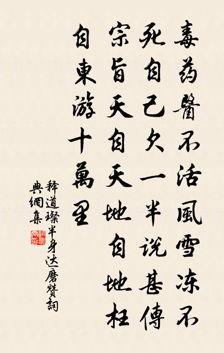 詩詞名句歷史字典書法欣賞書法字典國語詞典說文解字康熙字典古漢語字典標 題 作 者 詩 句 半身達磨贊作者:釋道璨 朝代:宋代半身達磨贊原文毒藥醫不活,風雪凍不死。自己欠一半,說甚傳宗旨。天自天,地自地,枉自東遊十萬里。詩詞問答問:半身達磨贊的作者是誰?答:釋道璨問:半身達磨贊寫於哪個朝代?答:宋代釋道璨半身達磨贊書法欣賞半身達磨贊書法作品詩詞推薦九月一日梅堯臣〔宋代〕授衣念祖節,闔棺傷故人。故人昔送我,把酒湍水濱。只道後期易,豈知無會因。死生意不及,欲語鼻先辛。既乏虞美人(寄李公定)王千秋〔宋代〕流蘇斗帳泥金額。我亦花前客。謫仙標韻勝瓊枝。一詠一觴、常是得追隨。自從風借雲帆便。冷落青樓宴。石橋風送莫內翰五首釋慧空〔宋代〕試問同參參底事,華亭秋晚水如天。離鉤三寸無人會,風起蘆花落釣船。西湖道院董嗣杲〔宋代〕名祠相接啟殊庭,巧對南屏萬疊青。深院冷侵雲砌竹,虛舟閒載錦池萍。廊頭道士書符簡,門外遊人挈酒瓶。分坐瑞鷓鴣·榴花五月眼邊趙彥端〔宋代〕榴花五月眼邊明。角簟流冰午夢清。江上扁舟停畫槳,雲間一笑濯塵纓。主人杯酒留連意,倦客關河去住情。都付沁園春方岳〔宋代〕平仄度此曲,俾歌之歲在永和,癸丑暮春,修禊蘭亭。有崇山峻岭,茂林修竹,清流湍激,映帶山陰。曲水流觴,浣花溪馬俌〔宋代〕浣花溪邊濯錦衣,百花滿潭溪水香,寶奩散盡有霜戟,草秣匹馬不可當,當時濯衣只偶爾,豈似取履張子房。烈烈涌金門王鎡〔宋代〕涌金門外看花朝,步去船歸不見遙。一派笙歌來水上,鷺鷥飛過第三橋。舟中大醉偶賦長句陸游〔宋代〕過江何敢號高流,偶與俗人風馬牛。畫楫新搖嚴瀨月,清尊又醉戴溪秋。壯心無復在千里,老氣尚能橫九州。古寺中書令裴公輓歌詞二首溫庭筠〔唐代〕王儉風華首,蕭何社稷臣。丹陽布衣客,蓮渚白頭人。銘勒燕山暮,碑沉漢水春。從今虛醉飽,無復污車茵。箭下林園秋夜作李嶷〔唐代〕林臥避殘暑,白雲長在天。賞心既如此,對酒非徒然。月色遍秋露,竹聲兼夜泉。涼風懷袖裡,茲意與誰傳。即席陸游〔宋代〕稚荷出水榴花開,長苖圜鼙送舉杯。村鄰相樂君勿笑,要是安健無凶災。蘇幕遮馬鈺〔元代〕鬧角兒,梳得好。妙手奇功,悟後呈些巧。個個疏來無倚靠。各各惺惺,蟣虱須教少。張打油,李*老。見我風狂次韻樂先生吳中見寄八首范成大〔宋代〕粟囊聊復寄三餐,埋沒緇塵懶濯冠。紅紫百般紛過眼,鄉山歲晚自蒼官。江陵愁望寄子安 / 江陵愁望有寄魚玄機〔唐代〕楓葉千枝復萬枝,江橋掩映暮帆遲。憶君心似西江水,日夜東流無歇時。六月十七日大暑殆不可過然去伏盡秋初皆不過陸游〔宋代〕赫日炎威豈易摧,火雲壓屋正崔嵬。嗜眠但喜蘄州簟,畏酒不禁河朔杯。人望息肩亭午過,天方悔禍素秋來。細思楚茨佚名〔先秦〕楚楚者茨,言抽其棘。自昔何為,我藝黍稷。我黍與與,我稷翼翼。我倉既盈,我庾維億。以為酒食,以享以祀。東歸留別幕中同舍孫應時〔宋代〕相從樂復樂,別離良獨難。傳觴秉明燭,起舞清夜闌。一醉何足辭,百年能幾歡。後會渺何許,相思江月寒。長橋張亢〔宋代〕雲收霧霽水風高,百丈虹橋氣勢豪。疑是玉龍藏爪距,潛來江上看波濤。送魏中丞還河北皇甫冉〔唐代〕寧知貴公子,本是魯諸生。上國風塵舊,中司印綬榮。辛勤戎旅事,雪下護羌營。名句推薦今夕不登樓,一年空過秋。高觀國《菩薩蠻·何須急管吹雲暝》 料得年年腸斷處,明月夜,短松岡。蘇軾《江城子·乙卯正月二十日夜記夢》 知己知彼,將心比心。佚名《增廣賢文·上集》 何時更杯酒,再得論心胸。李白《魏郡別蘇明府因北游》 天下有道,卻走馬以糞。天下無道,戎馬生於郊。老子《老子·德經·第四十六章》 至若窮陰凝閉,凜冽海隅,積雪沒脛,堅冰在須。李華《弔古戰場文》 細腰爭舞君沉醉,白日秦兵天下來。李涉《楚宮怨二首·其一》 隋堤三月水溶溶。背歸鴻,去吳中。蘇軾《江神子·恨別》 於安思危,危則慮安。劉向《戰國策·楚四·虞卿謂春申君》 但去莫復問,白雲無盡時。王維《送別》