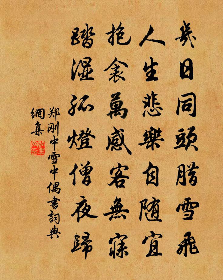 詩詞名句歷史字典書法欣賞書法字典國語詞典說文解字康熙字典古漢語字典標 題 作 者 詩 句 雪中偶書作者:鄭剛中 朝代:宋代雪中偶書原文幾日同頭臘雪飛,人生悲樂自隨宜。抱衾萬感客無寐,踏濕孤燈僧夜歸。詩詞問答問:雪中偶書的作者是誰?答:鄭剛中問:雪中偶書寫於哪個朝代?答:宋代鄭剛中雪中偶書書法欣賞雪中偶書書法作品詩詞推薦上廣東運副馬少卿壽十口號曾豐〔宋代〕平星轉作上台星,獨運璇璣握玉衡。蹀躞穩行黃道闊,熒煌長伴紫微明。秋日山居好十首舒岳祥〔宋代〕秋日山居好,疏明入畫峰。獵憐依寺鹿,樵護倚祠松。雁起西風笛,人居夕照舂。東山久不到,勝具一枝筇。策試夜潛紀長句於都堂西南隅(後首一作薛能詩)韋承貽〔唐代〕褒衣博帶滿塵埃,獨自都堂納卷回。蓬巷幾時聞吉語,棘籬何日免重來。三條燭盡鍾初動,九轉丹成鼎未開。殘月送覺新上人還越周弼〔宋代〕古越多精藍,名僧遞相接。青林瓶盂聚,丹壑樓觀疊。今乘秋濤便,莫待寒雨涉。何處聞鳴蛩,虛廊掃黃葉。初夏遊謝公岩徐璣〔宋代〕又取紗衣換,天晴起細風。清陰花落後,長日鳥啼中。水國乘舟樂,岩扉有路通。州民多到此,獨自憶髯公。和譚雲翔送雙桂韻王志道〔宋代〕雙柱婆娑天上花,殷勤分送士元家。捷鈐果副聯韉祝,謁謝當期穀旦差。送陳七還廣陵萬齊融〔唐代〕風流誰代子,雖有舊無雙。歡酒言相送,愁弦意不降。落花馥河道,垂楊拂水窗。海潮與春夢,朝夕廣陵江。減字木蘭花(貽亢之)吳則禮〔宋代〕淮山清夜。鏡面平鋪纖月掛。端是生還。同倚西風十二欄。休論往事。投老相逢真夢寐。兩鬢疏疏。好在松江一尺舟行入剡崔顥〔唐代〕鳴棹下東陽,回舟入剡鄉。青山行不盡,綠水去何長。地氣秋仍濕,江風晚漸涼。山梅猶作雨,溪橘未知霜。謝客木蘭花慢 壽中齊三月廿七日程文海〔元代〕春光明媚日,萬紅紫,斗芳菲。算幾許韶華,脂消粉褪,蝶懶蜂稀。誰知半山解道,道綠陰、幽草勝花時。天與誕句韓縝〔宋代〕劍外吾能說,山川大抵同。君行在巴徼,民俗半夷風。偈頌七十六首釋子益〔宋代〕瞿曇色相比金容,雨後青山插半空。覿面當機如不薦,桃花依舊笑春內。郡事多冗命繩翁拉彥翔則明德素游趙園彥翔歸程公許〔宋代〕簡編得趣自熟,軒冕於我何加。喜為勝游著句,示須歸賦落霞。厄台李廌〔宋代〕今古俱無忌憚情,厄台猶敢尚為名。裔孫不復重瞳聖,俗目俱同瞽叟盲。見慍仲由空骯髒,膾肝盜跖尚彭亨。聖人跋尤延之左司所藏光堯御書歌楊萬里〔宋代〕鸞台長史老野僧,月前病鶴霜後蠅。文書海里袞不了,黑花亂髮雙眼晴。故人同舍尤太史,敲門未揖心先喜。袖中人月圓 吳門懷古張可久〔元代〕山藏 * 雲藏寺,池上老梅枝,洞庭歸興,香柑紅樹,鱸銀絲,白家池館,吳宮花草,可似當時,最憐人處,啼鳥和友人惠詩陳普〔宋代〕萬事無非理數成,吾徒但向此研精。介鱗有分當鹹若,麟鳳何緣許瘦生。愧我詩書空盜竊,喜群學易有功程。相逢海仙花詩王禹偁〔宋代〕何年移植在僧家,一簇柔條綴彩霞。錦帶為名卑且俗,為君呼作海仙花。又贈一絕劉筠〔宋代〕粉白朱紅翡翠翹,漢宮等級不相饒。風波若未乖前約,一死何辭更抱橋。偈頌六十首釋曇華〔宋代〕心自本來心,本心非有法。有法有本心,非心非本法。名句推薦勸君頻入醉鄉來,此是無愁無恨處。晏幾道《玉樓春·雕鞍好為鶯花住》 無邊落木蕭蕭下,不盡長江滾滾來。杜甫《登高》 公乎躍馬揚玉鞭,滅沒高蹄日千里。溫庭筠《拂舞詞 / 公無渡河》 聲一無聽,物一無文左丘明《國語·鄭語·史伯為桓公論興衰》 再折柳穿魚,賞梅催雪。詹玉《齊天樂·送童瓮天兵後歸杭》 攜手藕花湖上路。一霎黃梅細雨。朱淑真《清平樂·夏日游湖》 秋叢繞舍似陶家,遍繞籬邊日漸斜。元稹《菊花》 一者階於道,幾於神。姜子牙《六韜·文韜·兵道》 安得五彩虹,駕天作長橋。李白《焦山望寥山》 禹廟空山里,秋風落日斜。杜甫《禹廟》