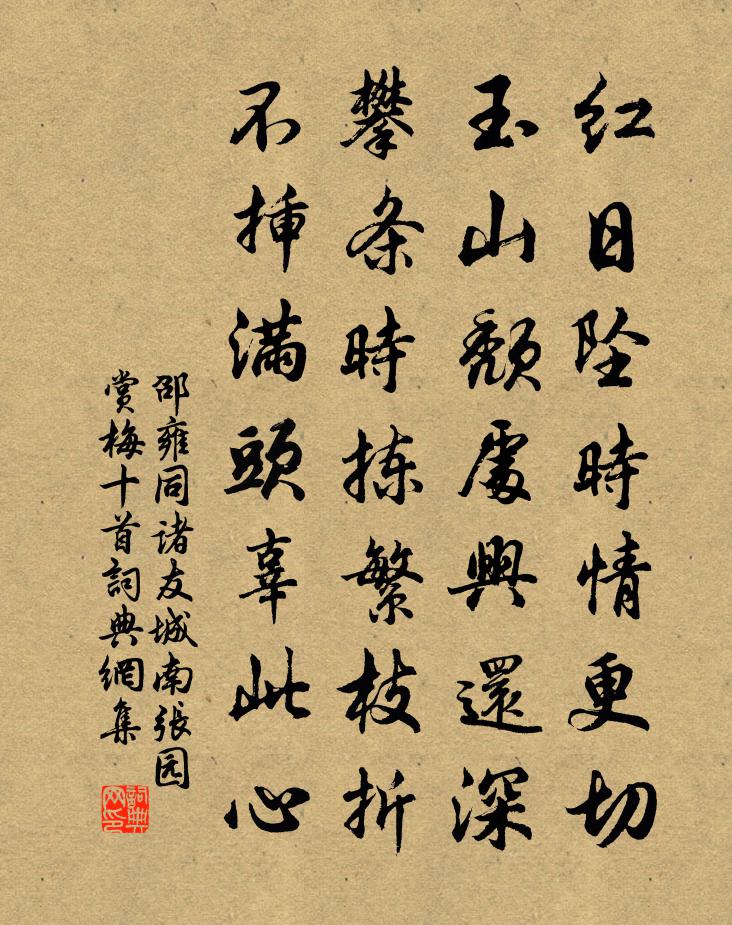 詩詞名句歷史字典書法欣賞書法字典國語詞典說文解字康熙字典古漢語字典標 題 作 者 詩 句 同諸友城南張園賞梅十首作者:邵雍 朝代:宋代同諸友城南張園賞梅十首原文紅日墜時情更切,玉山頹處興還深。攀條時揀繁枝折,不插滿頭辜此心。詩詞問答問:同諸友城南張園賞梅十首的作者是誰?答:邵雍問:同諸友城南張園賞梅十首寫於哪個朝代?答:宋代邵雍同諸友城南張園賞梅十首書法欣賞同諸友城南張園賞梅十首書法作品詩詞推薦逍遙詠宋太宗〔宋代〕仙經無限意,龍虎返丹砂。采綴陰陽理,終期歲月賒。求來皆有應,不信固難夸。忙說閒清境,真誠悟幾家。泐潭暹上人出示延福頌古三首索鄙語因用其韻釋慧空〔宋代〕馬駒踏殺天下人,炙地熏天氣轉腥。百歲翁翁開口笑,江西從此足人行。送桂帥鍾尚書赴召樂雷發〔宋代〕老依牙纛撚吟髭,又折梅花話別思。五嶺不遮鸞鳳詔,四方都誦鱒魴詩。人才晉魏凋零後,國事江淮倥傯時。賴有龍笛曲曹勛〔宋代〕美人滿酌金屈卮,勸我行樂當及時。艷歌流舞揚光暉。揚光輝,照春日。壽萬春,歡未畢。寄荔枝與盛參政田從易〔宋代〕櫻桃真小子,龍眼是凡姿。橄欖為下輩,枇杷作客兒。秋露王安石〔宋代〕日月凋何急,荒庭露送秋。初疑宿雨泫,稍怪曉霜稠。曠野將馳獵,華堂已御裘。空令半夜鶴,抱此一端愁。水調歌(次方時父癸卯五月四日)趙以夫〔宋代〕競渡楚鄉事,夸勝錦纏頭。湖光淥淨,轉勝雪浪舞潛虬。剛道琉璃寶苑,移作水晶珠闕,鰲頂出中流。一釣驚天地晚春宴韋道遜〔唐代〕日斜賓館晚,春輕麥候初。檐暄巢幕燕,池躍戲蓮魚。石聲隨流響,桐影傍岩疏。誰能千里外,獨寄八行書。蜜酒歌(並敘)蘇軾〔宋代〕西蜀道士楊世昌,善作蜜酒,絕醇釅。余既得其方,作此歌遺之。真珠為漿玉為醴,六月田夫汗流泚。不如春瓮自留侯廟曾國藩〔清代〕小智徇聲榮,達人志江海。咄咄張子房,身名大自在。信美齊與梁,幾人飽胔醢。留邑茲岩疆,亮無懷璧罪。國讎古遊俠呈軍中諸將(一作遊俠篇)崔顥〔唐代〕少年負膽氣,好勇復知機。仗劍出門去,孤城逢合圍。 * 遼水上,走馬漁陽歸。錯落金鎖甲,蒙茸貂鼠衣。還家五日與陳真卿飲梅堯臣〔宋代〕五日逢南國,三年別舊都。招魂傳楚客,撫節見靈巫。蒿艾因時采,蛟龍為俗驅。清樽與鵝炙,忻此故人俱。又答賀客白居易〔唐代〕銀章暫假為專城,賀客來多懶起迎。似掛緋衫衣架上,朽株枯竹有何榮?廣東黃漕改除廣西帥過郡送行曾豐〔宋代〕眼醒管蓬島飽瀛管洲,他水管他山何足管游。郎宿自闌朝北極,使車誰枉指南州。浩浩湯湯廣諸海,無人能與相融趙知監惠牡丹二首鄭剛中〔宋代〕遠沖嵐霧香如故,再照春陽色轉紅。親手滿瓶添淨水,一時回獻梵王宮。五絕呈李惟學山長王奕〔宋代〕隻影隨陽逐稻粱,故山元自富蒼筤。孤雄不作山樑夢,晚歲收聲在鳳岡。漁父詞/漁父惠洪〔宋代〕講虎天華隨玉麈。波心月在那能取。旁舍老僧偷指注。回頭覷。虛空特地能言語。歸對學徒重自訴。從前見解都欺喜子書思登第葛密〔宋代〕傳家何用富金籯,教子何如只一經。慶曆科名今已繼,更教來葉嗣前磬。逸再為婺女之行既別出郭矣夜不能寐成六絕句趙蕃〔宋代〕去歲諸公祖敬之,我曾同席共委蛇。相逢儻復蒙相問,為道東歸鬢益絲。七夕泛舟盧照鄰〔唐代〕鳳杼秋期至,鳧舟野望開。微吟翠塘側,延想白雲隈。石似支機罷,槎疑犯宿來。天潢殊漫漫,目暮獨悠哉。名句推薦山檣谷塹依然在,弱吐強吞盡已空。杜牧《題武關》 天勢圍平野,河流入斷山。暢當《登鸛雀樓》 正西望長安,下見江水流。李白《秋浦歌十七首》 書痴者文必工,藝痴者技必良。蒲松齡《聊齋志異·卷二·阿寶》 王師北定中原日,家祭無忘告乃翁。陸游《示兒》 漠漠蕭蕭,香凍梨花雨。吳大有《點絳唇·送李琴泉》 悠悠天宇曠,切切故鄉情。張九齡《西江夜行》 烏鵲倦棲,魚龍驚起,星斗掛垂楊。陳亮《一叢花·溪堂玩月作》 奉勸世間夫婦,固不可彼此相仇,亦不可過於情篤。沈復《浮生六記·坎坷記愁》 事不三思終有悔,人能百忍自無憂。馮夢龍《醒世恆言·卷三十四》