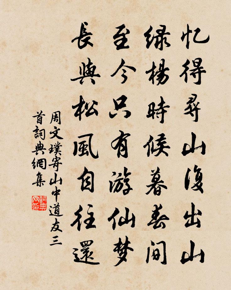 詩詞名句歷史字典書法欣賞書法字典國語詞典說文解字康熙字典古漢語字典標 題 作 者 詩 句 寄山中道友三首作者:周文璞 朝代:宋代寄山中道友三首原文憶得尋山復出山,綠楊時候暮春間。至今只有遊仙夢,長與松風自往還。詩詞問答問:寄山中道友三首的作者是誰?答:周文璞問:寄山中道友三首寫於哪個朝代?答:宋代周文璞寄山中道友三首書法欣賞寄山中道友三首書法作品詩詞推薦寄題程元成紛事山居三詠葵心堂楊萬里〔宋代〕人笑戎葵定自痴,不愁曦景蠶兼遲。便令隔霧光難到,也則傾心苦為誰。衛足平生非我志,向陽一點只天知。話頭高郵別秦觀三首蘇轍〔宋代〕蒙蒙春雨濕邗溝,蓬底安眠畫擁裘。知有故人家在此,速將詩卷洗閒愁。筆端大字鴉棲壁,袖裡清詩句琢冰。送我唐多令(城歸泊湖山)陳著〔宋代〕倦枕寄漁鄉。篷低被怯霜。月窺人、多少思量。自是欲眠眠不穩,禁聽得、雁聲雙。和夢早催行。歸來梅竹窗。小題楊誠齋南海集二首袁說友〔宋代〕詩以變成雅,騷以變達意。變其權者徒,中有至當義。水清石自見,變定道乃契。文章豈無底,過此恐少味。答林泉白居易〔唐代〕好住舊林泉,回頭一悵然。漸知吾潦倒,深愧爾留連。欲作棲雲計,須營種黍錢。更容求一郡,不得亦歸田。原壤歌先秦無名〔先秦〕貍首之斑然。執女手之卷然。鷓鴣天石孝友〔宋代〕屏障重重翠幕遮。蘭膏煙暖篆香斜。相思樹上雙棲翼,連理枝頭並蒂花。敧鳳髻,嚲烏紗。雲慵雨困興無涯。箇中故樞密簽書贈正議大夫王彥霖輓詞二首蘇轍〔宋代〕傾蓋晚相親,東西省戶鄰。聽君占諫草,繼我出詞綸。京尹聲初浹,樞廷跡尚新。鄞鄲炊未熟,榮謝隔逡巡。句曹組〔宋代〕茅屋蕭然野水東。頌古八首釋道顏〔宋代〕椎鑼擂鼓轉船頭,席捲波翻喊激流。洗腳上船乘快便,順風相送下揚州。春暮劉應時〔宋代〕愁里青春去,年來白髮加。細書欺老眼,爛飯愜衰牙。寧夢穴中蟻,不疑杯里蛇。南窗時隱几,一縷篆煙斜。高宗時語佚名〔唐代〕左相宣威沙漠,右相馳譽丹青。三館學生放散,五台令史經明。懷古呈通守鄭定齋王柏〔宋代〕北方有大井,深潛幾萬尋。煎為東阿膠,瑩徹如球琳。持此一寸微,可救千丈渾。世道一以濁,貪風方襄陵。酒樓劉過〔宋代〕夜上青樓去,如迷沿府深。枝歌千調曲,客雜五方音。藕白玲瓏玉,柑黃磊落金。酣歌恣蕭散,無復越中吟。大風寒微晴方回〔宋代〕窮旅寬愁思,嚴寒作淡晴。終須開日色,何可欠風聲。地白猶含凍,天青漸放明。吳門稍和暖,應有故人迎。休沐日蘇籀〔宋代〕洗硯酬緘復論文,金書瑤笈忌羶葷。搔頭冷枕遺簪弁,浣垢涼床潔帨帉。煬灶篳門無量燠,夏畦褐父若為芸。鴻飛蠟梅四絕句陳與義〔宋代〕奕奕金仙面,排行立曉晴。殷勤夜來雪,少住作珠瓔。早發赴洞庭舟中作白居易〔唐代〕閶門曙 * 蒼蒼,星月高低宿水光。棹舉影搖燈燭動,舟移聲拽管弦長。漸看海樹紅生日,遙看包山白帶霜。出郭疏山一覽亭曾幾〔宋代〕青雲梯盡得朱欄,不但令人六月寒。無限江南好山水,庵摩勒果掌中看。縣齋張耒〔宋代〕只合門如野叟家,市朝聲利苦喧譁。但知得醉頻沽酒,何處逢春不見花。暗樹五更雞報曉,晚庭三疊鼓催衙。知君名句推薦柳徑無人,墮絮飛無影。張先《翦牡丹(舟中聞雙琵琶·般涉調)》 日下壁而沉彩,月上軒而飛光。江淹《別賦》 人法地,地法天,天法道,道法自然。老子《老子·道經·第二十五章》 斜風細雨作春寒。對尊前。朱淑真《江城子·賞春》 露清枕簟藕花香,恨悠揚。顧敻《虞美人·觸簾風送景陽鍾》 興國在於務農。陳壽《三國志·魏書·辛毗楊阜高堂隆傳》 柳葉隨歌皺,梨花與淚傾。黃庭堅《南歌子·槐綠低窗暗》 閨中少婦不知愁,春日凝妝上翠樓。王昌齡《閨怨》 七夕年年信不違,銀河清淺白雲微,蟾光鵲影伯勞飛。毛文錫《浣溪沙·七夕年年信不違》 欲尋芳草去,惜與故人違。孟浩然《留別王侍御維 / 留別王維》