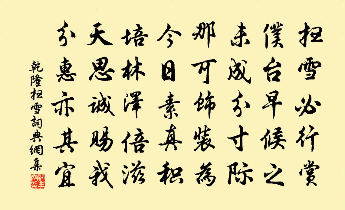 詩詞名句歷史字典書法欣賞書法字典國語詞典說文解字康熙字典古漢語字典標 題 作 者 詩 句 掃雪作者:乾隆 朝代:清代掃雪原文掃雪必行賞,仆台早候之。未成分寸際,那可飾裝為。今日素真積,培林澤倍滋。天思誠賜我,分惠亦其宜。詩詞問答問:掃雪的作者是誰?答:乾隆問:掃雪寫於哪個朝代?答:清代乾隆掃雪書法欣賞掃雪書法作品詩詞推薦送程給事知越州吳充〔宋代〕曾乘使君馬,數上豫章樓。北闕領新命,西山追舊遊。使星催縣弩,鄉月伴仙舟。卻顧區區者,風波鬢已秋。送田使君都統離夔赴合州陽枋〔宋代〕英雄才略暫臨夔, * 依紅詫小兒。肯同稠人認毛遂,甘從走督得神師。魚城人喜景星出,象澦猿驚仙仗移。七十代公慶上郭帥王灼〔宋代〕昔年先廟謁汾陽,提筆從公寫短牆。再別巴江油戟下,七逢天竺桂枝香。宦途自許安仁拙,浮俗誰憐處士狂。客舍宿路北李廌〔宋代〕晚日明青嶂,春風送馬蹄。數朝秦嶺北,今夜洛陽西。禁水綠波滿,蕪城碧草齊。客心歸更速,解轡恨棲雞。達磨贊釋崇岳〔宋代〕直指西來,分明禍胎。渡江面壁,偷心未息。從茲皮髓分張,轟起青天霹靂。定風波·重陽蘇軾〔宋代〕與客攜壺上翠微,江涵秋影雁初飛,塵世難逢開口笑,年少,菊花須插滿頭歸。酩酊但酬佳節了,雲嶠,登臨不用月下大醉星侄作墨索書迅筆題為醉矣行方岳〔宋代〕吾醉矣,吾醉矣,醉語雖強難舉似。何年開闢有乾坤,日月左旋如磨螘。尊盧赫胥一聚塵,檮杌春秋幾張紙。道家鷓鴣天·守得蓮開結伴遊晏幾道〔宋代〕守得蓮開結伴遊。約開萍葉上蘭舟。來時浦口雲隨棹,采罷江邊月滿樓。花不語,水空流。年年拼得為花愁。明朝贈鵲陸游〔宋代〕為梁星渚自何年?毛羽摧傷不怨天。知我齋余常施食,翩然飛下北窗前。白日晁公溯〔宋代〕白日寒無色,黃流漲未平。雲低催夕暝。江濁污秋清。尚覺物多累,敢期詩有聲。窮愁今至骨,書或似虞卿。暑中雜興方岳〔宋代〕不慣山中夜月寒,滿窗樹影蘚花乾。移床近壁不敢臥,恐是龍蛇之屈蟠。意外吟邵雍〔宋代〕事出意外,人難智求。自非妄動,惡用多愁。既有誤中,寧無暗投。能知此說,天下何憂。梅雨陂澤皆滿陸游〔宋代〕雨暗迷行路,溪深沒舊痕。汪汪牛湩白,盎盎酒醅渾。暖浸千畦稻,橫通十里村。群蛙更堪笑,鼓吹鬧黃昏。送方書記兼簡府主葉適〔宋代〕我昔防江之下流,獨許蔡子專軍謀。未能奏效累絲髮,已復負謗叢山丘。小范兵精思慮遠,片言坐折群疑滿。幕僚劍閣燕肅〔宋代〕劍聳秋峰積靄昏,關城遙向望中分。觸新百堵連青嶂,依舊千家住白雲。松檜影隨岩寺出,管弦聲雜澗聲聞。道傍祠周翼之〔宋代〕荒祠古道邊,喬木翠森然。疊石為香案,攀藤掛紙錢。一時靈有跡,千載祀猶傳。草草陳牛酒,深期大有年。昭君怨周紫芝〔宋代〕滿院融融花氣。紅繡一簾垂地。往事憶年時。只春知。風又暖。花漸滿。人似行雲不見。無計奈離情。惡銷凝。夜宿方允迪家雨雪大作朱翌〔宋代〕肺腑群山襟帶江,近人鷗鳥日成行。每來問道維摩室,何幸濃薰班氏香。雨腳雪花方間作,燈紅酒綠正爭光。更煩送盧尚書赴靈武張蠙〔唐代〕西北正傳烽候急,靈州共喜信臣居。從軍儘是清才去,屬郡無非大將除。新地進圖移漢界,古城遺碣見蕃書。山川旅悶十首方回〔宋代〕彼姝復此粲,人面外堪看。鸚鵡雖能語,芙蓉豈耐寒。舌酣元可畏,背毀更多端。昵昵徒為耳,雲龍許控摶。名句推薦若待得君來向此,花前對酒不忍觸。蘇軾《賀新郎·夏景》 好一似食盡鳥投林,落了片白茫茫大地真乾淨。曹雪芹《紅樓夢·第五回》 水何澹澹,山島竦峙曹操《觀滄海》 日照新妝水底明,風飄香袂空中舉。李白《採蓮曲》 結交在相知,骨肉何必親。佚名《箜篌謠》 今夫山一卷石之多,及其廣大,草木生之,禽獸居之,寶藏興焉。子思《中庸·第二十六章》 料因循誤了,殘氈擁雪,故人心眼。張炎《解連環·孤雁》 猶喜閏前霜未下,菊邊依舊舞身輕。司空圖《白菊三首》 以小人之慮,度君子之心。劉義慶《世說新語·雅量》 長風幾萬里,吹度玉門關。李白《關山月》