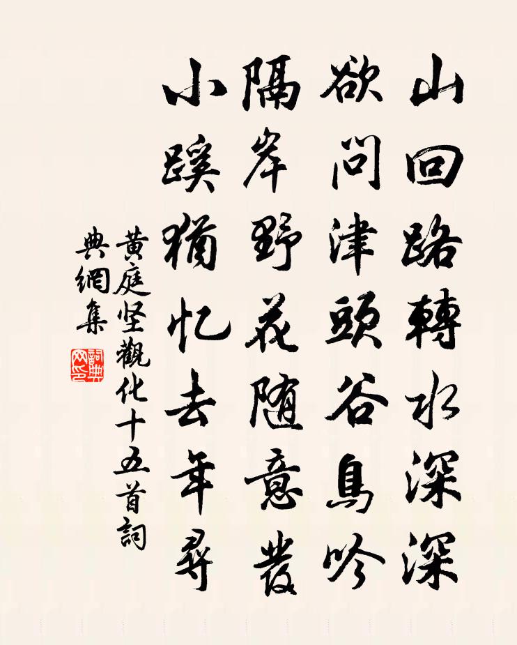 詩詞名句歷史字典書法欣賞書法字典國語詞典說文解字康熙字典古漢語字典標 題 作 者 詩 句 觀化十五首作者:黃庭堅 朝代:宋代觀化十五首原文山迴路轉水深深,欲問津頭谷鳥吟。隔岸野花隨意發,小蹊猶憶去年尋。詩詞問答問:觀化十五首的作者是誰?答:黃庭堅問:觀化十五首寫於哪個朝代?答:宋代問:黃庭堅的名句有哪些?答:黃庭堅名句大全黃庭堅觀化十五首書法欣賞觀化十五首書法作品詩詞推薦次德茂湖中韻李流謙〔宋代〕秋風早已來吹人,朝數暮數唯歸程。白湖粘天行未了,單舸夜泊令人驚。更闌剪燭共愁語,酒醒彈鋏為商聲。篙兒偈頌二十二首釋妙倫〔宋代〕庭前黃葉墜,嶺上白雲屯。風味無多子,何人共我論。中峰劉拯〔宋代〕躡徑登高亭,天遠不敢局。疏簾卷檐花,百里在舉目。江橫縞帶明,山隱螺髻綠。啼鳥破長煙,飛泉漱寒玉。雲回送丁子齊主簿葉適〔宋代〕明經六十未收科,自取南官計若何。來歲須將一點霸,浮家今厭百程過。預愁菊蕊行中破,還喜梅花到後多。從古秋晚雲陽驛西亭蓮池許渾〔唐代〕心憶蓮池秉燭游,葉殘花敗尚維舟。煙開翠扇清風曉,水泥紅衣白露秋。神女暫來雲易散,仙娥初去月難留。空懷隋柳汪遵〔唐代〕夾浪分堤萬樹余,為迎龍舸到江都。君看靖節高眠處,只向衡門種五株。漁家傲石正倫〔宋代〕春入桃腮生嫵媚。妝成日日行雲意。貪聽新聲翻歇指。工尺字。窗前自品瓊簫試。玉碾鸞釵珠結桂。金泥絡縫乾紅持國遺食梅堯臣〔宋代〕乞食非為貧,妻病妾且死。晨爨不暖釜,朝飯亦輟匕。遺我我所恤,食我我所恥。我恥曾我求,我恤寧我止。應乏與夫同詠詩蘇檢〔唐代〕還吳東去過澄城,樓上清風酒半醒。想得到家春已暮,海棠千樹已凋零。依韻答惠勤上人梅堯臣〔宋代〕釋子本樂靜,宜不事物牽。我慚姑蘇守,復賞杼山然。三歲與之別,其學已增前。忽此有來贈,老拙謬耽研。水龍吟 西湖懷古陳德武〔宋代〕東南第一名州,西湖自古多佳麗。臨堤台榭,畫船樓閣,遊人歌吹。十里荷花,三秋桂子,四山晴翠。使百年南渡送徐洞清秀才入道葉適〔宋代〕方老昔為儒,仁義自愁煎。決策從道士,擺落科場緣。神仙事茫昧,良得日高眠。徐生嗣其風,永謝負郭田。白襴王梅泉生日惠詩次韻答之牟巘五〔宋代〕堪笑衰翁作計狂,又隨笭箵到魚梁。未秋早覺凋蒲柳,已老安能種豫章。誰似讀騷仍飲酒,有時贊易 * 香。梅邊避亂山家蕭澥〔宋代〕深村林麓冷颼颼,滿眼風光總是愁。日月羨渠雙喜鵲,自跳自擲樹梢頭。鶴林寺馮多福〔宋代〕春郊躬勸相,稅駕擬禪關。院古深藏竹,堂虛淨對山。日曛農父醉,雲伴老僧閒。暇日還攜茗,同來淪虎斑。中秋月王禹偁〔宋代〕明可監秋毫,供吟屬我曹。隔年方得見,終夕敢辭勞。冷向天心白,清臨露掌高。霖台相照處,寒色滿藍袍。浣溪沙元好問〔金代〕為愛劉郎駐玉華。暗將心事許煙霞。石田茅屋老生涯。鐵笛不須從二草,頭巾長擬掛三花。他年人說漫郎家。書嬾陸游〔宋代〕我性本迂疏,養生又無術,憂患自外至,疾病由中出。屏居絕造請,冀補東隅失。今觀世間事,如僧視沐櫛。閒身雪寒圍爐小集范成大〔宋代〕席簾紙閣護香濃,說有談空愛燭紅。高飣膻根澆杏酪,旋融雪汁煮松風。康年氣象冬三白,浮世功名酒一中。無事詩一首何逢原〔宋代〕萬偽何緣鬭一真,時間謾得面前人。生男種女多暗啞,果報元來必有因。名句推薦人生自是有情痴,此恨不關風與月。歐陽修《玉樓春·尊前擬把歸期說》 八百里分麾下炙,五十弦翻塞外聲。辛棄疾《破陣子·為陳同甫賦壯詞以寄之》 靈山多秀色,空水共氤氳。張九齡《湖口望廬山瀑布泉 / 湖口望廬山瀑布水》 秋來愁更深,黛拂雙蛾淺楊無咎《生查子·秋來愁更深》 妾本秦羅敷,玉顏艷名都。李白《陌上桑》 今春看又過,何日是歸年。杜甫《絕句二首》 把酒祝東風,且莫恁、匆匆去。王安石《傷春怨·雨打江南樹》 人生無根蒂,飄如陌上塵。陶淵明《雜詩》 居逆境中,周身皆針砭藥石,砥節礪行而不覺;處順境內,眼前盡兵刃戈矛,銷膏靡骨而不知。洪應明《菜根譚·概論》 穠艷一枝細看取,芳心千重似束。蘇軾《賀新郎·夏景》