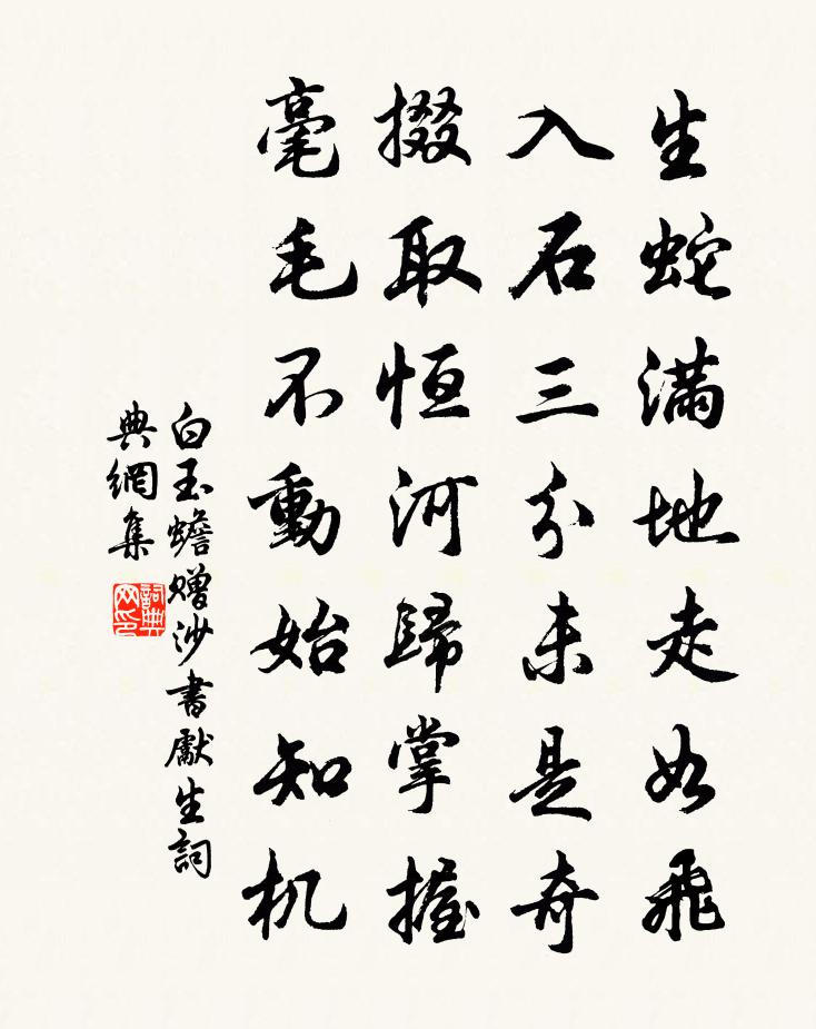 詩詞名句歷史字典書法欣賞書法字典國語詞典說文解字康熙字典古漢語字典標 題 作 者 詩 句 贈沙書先生作者:白玉蟾 朝代:宋代贈沙書先生原文生蛇滿地走如飛,入石三分未是奇。掇取恆河歸掌握,毫毛不動始知機。詩詞問答問:贈沙書先生的作者是誰?答:白玉蟾問:贈沙書先生寫於哪個朝代?答:宋代問:贈沙書先生是什麼體裁?答:七絕白玉蟾贈沙書先生書法欣賞贈沙書先生書法作品詩詞推薦喜魯直還用前韻再作晁說之〔宋代〕鷓鴣不入饌,松柏有常心。歸來應未老,但道古猶今。閒十詠仇遠〔宋代〕樹隔殘鍾遠欲無,野雲漠漠雨疏疏。飛蚊盡逐南風去,父子燈前共讀書。柳梢青 以上一百零三首,見石蓮庵匯刻遺山元好問〔金代〕玉嫩紅嬌。□花如月,斜裊金翹。楚女腰肢,小喬風韻,難比妖嬈。當年約住藍橋。便回首仙凡路遙。一曲清歌,九疊劉克莊〔宋代〕門戶重重繡幕遮,十分國艷屬侯家。誰知蔡琰燕山燕,愁聽胡笳對雪花。東皋十首晁補之〔宋代〕新植青桐小逕成,兩行萱草一時榮。春風百卉芳菲盡,長夏幽花卻稱情。早歸元稹〔唐代〕春靜曉風微,凌晨帶酒歸。遠山籠宿霧,高樹影朝暉。飲馬魚驚水,穿花露滴衣。嬌鶯似相惱,含囀傍人飛。端午內中帖子詞夫人閣王珪〔唐代〕日長珠箔漏聲稀,團扇新財越女機,進罷采絲三殿晚,萬年枝上亂鶯飛。憩楹塘驛二首楊萬里〔宋代〕夾路黃茅與樹齊,人行茅里似山雞。長松不與遮西日,卻送清陰過隔溪。贈同年陳長史員外劉禹錫〔唐代〕明州長史外台郎,憶昔同年翰墨場。一自分襟多歲月,相逢滿眼是淒涼。推賢有愧韓安國,論舊唯存盛孝章。所嘆偈頌七十六首釋子益〔宋代〕伏暑未收,金風漸作。彈指聲中,門開樓閣。送慧禪人往上江糴麻米釋正覺〔宋代〕石霜拈處最分明,萬萬千千一粒生。歸日飯香穿鼻吼,相呼作舞下堂行。歸次樊江陸游〔宋代〕芳草東西路,綠楊長短亭。人生豈匏繫,吾志本鴻冥。征袖朝沾雨,歸帆夜戴星。長魚幸能買,且復倒殘瓶。和安成彭清老五首彭龜年〔宋代〕山有喬松隰有台,胸中日月太平開。安車不入申公念,只恐詔從天上來。送孔郎中赴陝郊蘇軾〔宋代〕驚風擊面黃沙走,西出崤函脫塵垢。使君來自古徐州,聲振河潼殷關右。十里長亭聞鼓角,一川秀色明花柳。北臨村舍二首許渾〔唐代〕自翦青莎織雨衣,南峰煙火是柴扉。萊妻早報蒸藜熟,童子遙迎種豆歸。魚下碧潭當鏡躍,鳥還青嶂拂屏飛。花時寄馮舍人王禹偁〔宋代〕轉輸爭合滯才華,急詔重乘上漢查。繼我已吟紅藥樹,勸君曾賦海棠花。詞隨健笛光綸誥,詩落成都燦綺霞。應笑除夜懷劉朋山為坑司乾官朱南傑〔宋代〕失腳糟丘又一春,歲除牢落頗關情。誰家不換桃符句,比屋相聞竹爆聲。舊友未知能鑄冶,新年宜入孰陶成。來朝緋桃花李鹹用〔唐代〕茫茫天意為誰留,深染夭桃備勝游。未醉已知醒後憶,欲開先為落時愁。痴蛾亂撲燈難滅,躍鯉傍驚電不收。何事入關言懷黃滔〔唐代〕背將蹤跡向京師,出在先春入後時。落日灞橋飛雪裡,已聞南院有看期。卜運算元(園丁獻海棠)程大昌〔宋代〕春產不貪春,為厭春花泛。睡到深秋夢始回,素影翻春艷。意賞逐時新,舊事誰能占。解轉春光入酒杯,萸菊誰雲名句推薦佳人應怪我,別後寡信輕諾。柳永《尾犯·夜雨滴空階》 手攜稚子夜歸院,月冷空房不見人。白居易《為薛台悼亡》 毛羽不豐滿者不可以高飛劉向《戰國策·秦一·蘇秦始將連橫》 殘日東風,不放歲華去。吳文英《祝英台近·除夜立春》 恨舊愁新。有淚無言對晚春。淮上女《減字木蘭花·淮山隱隱》 罪人或免人罪,難為亦為也。來俊臣《羅織經·問罪卷第十》 愁無限,消瘦盡,有誰知?閒教玉籠鸚鵡念郎詩。納蘭性德《相見歡·落花如夢淒迷》 善有善報,惡有惡報。佚名《增廣賢文·上集》 三更月。中庭恰照梨花雪。賀鑄《子夜歌·三更月》 桐葉晨飄蛩夜語。旅思秋光,黯黯長安路。陸游《蝶戀花·桐葉晨飄蛩夜語》