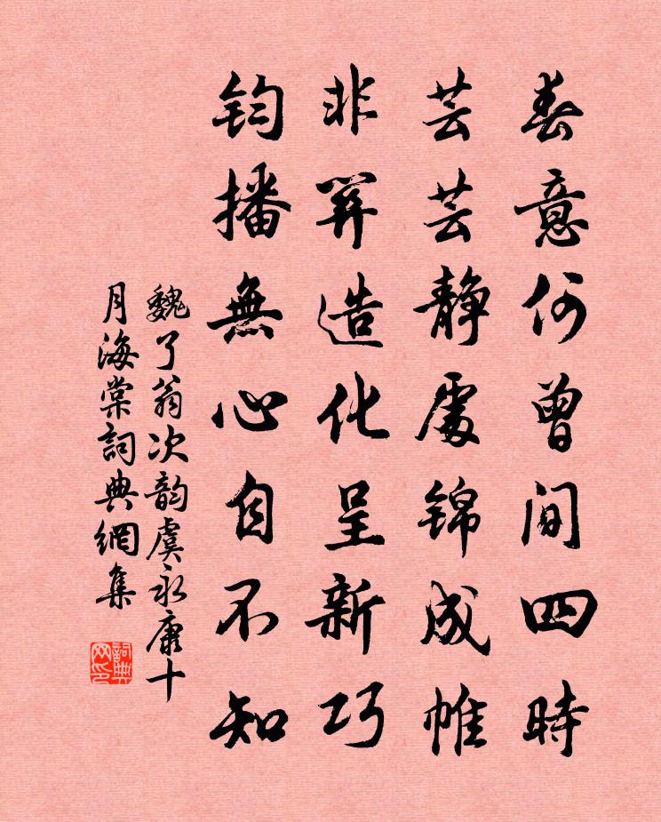 詩詞名句歷史字典書法欣賞書法字典國語詞典說文解字康熙字典古漢語字典標 題 作 者 詩 句 次韻虞永康十月海棠作者:魏了翁 朝代:宋代次韻虞永康十月海棠原文春意何曾間四時,芸芸靜處錦成帷。非關造化呈新巧,鈞播無心自不知。詩詞問答問:次韻虞永康十月海棠的作者是誰?答:魏了翁問:次韻虞永康十月海棠寫於哪個朝代?答:宋代魏了翁次韻虞永康十月海棠書法欣賞次韻虞永康十月海棠書法作品詩詞推薦不睡四首楊萬里〔宋代〕夜永無眠非為茶,無風燈影自橫斜。擁禂仰面書帷薄,數盡承塵一簟花。東堂初寒創意作竹屏障門屏腳偶得朽梅枝截用張耒〔宋代〕簡冊林中老蠹魚,年來窮謫尚耽書。竹屏風下憑烏幾,畫作柯山居士圖。臨安春雨初霽陸游〔宋代〕世味年來薄似紗,誰令騎馬客京華。小樓一夜聽春雨,深巷明朝賣杏花。矮紙斜行閒作草,晴窗細乳戲分茶。素衣客舟鄭獬〔宋代〕滄江落日動,宿鳥歸故山。托巢在高木,朝去夕必還。客舟逐南風,大雪留楚關。何日掃吾廬,種秫鄖溪間。句高似孫〔宋代〕啜樆正自強持酒,眾醉如何敢獨醒。和劉侍郎九日登女郎台程大昌〔宋代〕霜枝凋翠雁橫秋,莫倚危樓動旅愁。菊有清香樽有酒,茱萸不插也風流。跋劉敏叔畫楊誠齋先生探梅圖左謨〔宋代〕沖寒踏雪行溪路,對月看梅太瘦生。莫道親曾陪杖屨,只今見畫也心清。發孔鎮晨炊漆橋道中紀行十首楊萬里〔宋代〕不但秋原雨冒田,坐看平地路成川。隔田山下青松外,不見人家只見煙。鵲橋仙(七夕)謝懋〔宋代〕鉤簾借月,染云為幌,花面玉枝交映。涼生河漢一天秋,問此會、今宵孰勝。銅壺尚滴,燭龍已駕,淚浥西風不盡上海張蘊〔宋代〕夢斷三更鶴,蘆邊系短篷。聽潮看海月,坐石受天風。物至秋而化,年來我亦翁。長歌相勞事,猶喜此樽同。梅雨隳城自用前韻劉克莊〔宋代〕疊石黏灰事尚新,忽因沾漬減嶙峋。晉陽昔僅存三板,瓠子今誰助束薪。恃陋竊憂難御冠,加工卻恐倍勞民。狂生李後主童謠佚名〔唐代〕索得娘來忘卻家,後園桃李不生花。豬兒狗兒都死盡,養得貓兒患赤瘕。送於中丞使回紇冊立賈島〔唐代〕君立天驕發使車,冊文字字著金書。漸通青冢鄉山盡,欲達皇情譯語初。調角寒城邊色動,下霜秋磧雁行疏。旌旗陪程太師宴柳湖歸鄭獬〔宋代〕鳴珂曉日動,畫旗春風斜。馬蹄碧玉砧,踏破黃金沙。夾路盡高柳,屹如紺璧遮。草軟藉遊人,樹暖啼嬌鴉。長湖頌古十九首釋法全〔宋代〕八十翁翁著繡靴,踏開幽洞笑呵呵。傍人指點忘歸路,不覺腰間爛斧柯。陳公藻覓筍仍許作包子陳棣〔宋代〕玉版禪師來應供,錦繃稚子敢分珍。並包更藉桄榔屑,風味懸知定可人。山城秋日野望感事書懷詩五章呈吳龍圖文同〔宋代〕已是秋陰更夕曛,亂山高下起寒雲。危樓願見客何處,遠笛不知人厭聞。身外流年波渺渺,眼前生事葉紛紛。此愁上元觀燈胡仲弓〔宋代〕月掛牆頭楊柳枝,繁燈爛漫玉琉璃。綺羅盡學宮妝樣,歌舞休傳外國詞。滿路競看花灼灼,故京誰念黍離離。他年獻可造朝葛紹體〔宋代〕步步青雲肯憶家,西湖春訊到梅花。除書一紙飛來日,柳色鶯聲滿後衙。題禊帖圖方回〔宋代〕永和九年晉癸丑,禊帖至今家家有。遺墨一紙出昭陵,摹本宇宙同不朽。甲子循環十六周,甫近千歲未為久。之字名句推薦野老念牧童,倚杖候荊扉。王維《渭川田家》 情如之何,暮塗為客,忍堪送君。吳文英《沁園春·送翁賓暘游鄂渚》 觀其交遊,則其賢不肖可察也管仲《管子·權修》 借問漢宮誰得似,可憐飛燕倚新妝。李白《清平調·其二》 輪匠執其規、矩,以度天下之方圓墨子《墨子·天志(上)》 力拔山兮氣蓋世。時不利兮騅不逝。項羽《垓下歌》 夜合花開香滿庭,夜深微雨醉初醒。竇叔向《夏夜宿表兄話舊》 偶因一著錯,便為人上人。曹雪芹《紅樓夢·第二回》 綠陰青子老溪橋。羞見東鄰嬌小。吳文英《西江月·賦瑤圃青梅枝上晚花》 無為在歧路,兒女共沾巾。王勃《送杜少府之任蜀州 / 送杜少府之任蜀川》