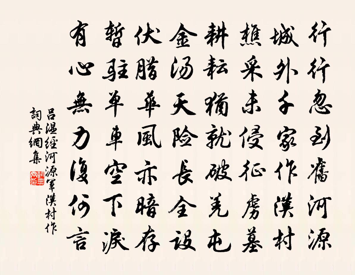 詩詞名句歷史字典書法欣賞書法字典國語詞典說文解字康熙字典古漢語字典標 題 作 者 詩 句 經河源軍漢村作作者:呂溫 朝代:唐代經河源軍漢村作原文行行忽到舊河源,城外千家作漢村。樵採未侵征虜墓,耕耘猶就破羌屯。金湯天險長全設,伏臘華風亦暗存。暫駐腳踏車空下淚,有心無力復何言。詩詞問答問:經河源軍漢村作的作者是誰?答:呂溫問:經河源軍漢村作寫於哪個朝代?答:唐代呂溫經河源軍漢村作書法欣賞經河源軍漢村作書法作品注釋全唐詩:卷371-10詩詞推薦南浦寇準〔宋代〕春色入垂楊,煙波漲南浦。落日動離魂,江花泣微雨。鄭丞相生日口號十首劉克莊〔宋代〕篚苞不復入修門,民力微蘇物漸蕃。見說海邊停{左魚右差}局,介鱗亦被相君恩。板佚名〔先秦〕上帝板板,下民卒癉。出話不然,為猶不遠。靡聖管管。不實於亶。猶之未遠,是用大諫。天之方難,無然憲憲。偈頌七十八首釋正覺〔宋代〕萬物自有功,當言用極處。事存函蓋合,理應箭鋒柱。醉吟白居易〔唐代〕醉來忘渴復忘飢,冠帶形骸杳若遺。耳底齋鍾初過後,心頭卯酒未消時。臨風朗詠從人聽,看雪閒行任馬遲。應被田舍即事十首劉克莊〔宋代〕兒女相攜看市優,縱談楚漢割鴻溝。山河不暇為渠惜,聽到虞姬直是愁。人惠酴醾姜特立〔宋代〕少年著意玩時芳,每愛風枝玉雪揚。老去此心渾忘卻,不堪猶作故時香。長思仙馬鈺〔元代〕遇重陽。牧青羊。不著虛名遠遠揚。惟修性日。慕荀揚。樂飄。豁豁洋洋豁豁洋。通玄風害佯。偈頌六十五首釋普濟〔宋代〕天晴日頭出,雨落階頭濕。寶陀岩上人,猶自不條直。書懷陳造〔宋代〕人間窮達命污隆,作意功名欲捕風。但見劉班誤車子,何曾鄧班誤車子,何曾鄧禹笑王融。官曹得飽餘何事,書課題壽安王主簿池館蘇頲〔唐代〕洛邑通馳道,韓郊在屬城。館將花雨映,潭與竹聲清。賢俊鸞棲棘,賓游馬佩衡。願言隨狎鳥,從此濯吾纓。竹所溫府教釋雲岫〔宋代〕君子居之何陋有,清虛冷澹最深幽。春風歸在鞭頭了,早晚龍孫又出頭。新雪八韻(一作閒居新雪)薛能〔唐代〕大雪滿初晨,開門萬象新。龍鍾雞未起,蕭索我何貧。耀若花前境,清如物外身。細飛斑戶牖,乾灑亂松筠。正色百一詩 十七應璩〔魏晉〕洛水禁罾罟。魚鱉不為殖。空令自相啖。吏民不得食。甲辰人日病中,吟六言六首以自嘲范成大〔宋代〕攢眉輒作山字,啾耳惟聞水聲。人應見憐久病,我亦自厭餘生。奉和趙王西京路春旦詩庾信〔南北朝〕直城龍首抗。橫橋天漢分。風烏疑近日。露掌定高雲。新渠還入渭。舊鼎更開汾。漢獵熊攀檻。秦田雉失羣。宜年贈孫花翁翁甫〔宋代〕我生頭髮未燥時,花間已歌花翁詩。我發既長今漸白,猶見花翁好顏色。舉酒祝翁壽百年,我為詩孫戲翁邊。句李堯夫〔唐代〕向外疑無地,其中別有天。方外共推為道友,關中獨自占詩家。炎暑鬱蒸無處避,涼風訊息幾時來。太乙宮即事王同祖〔宋代〕金殿重重畫不開,盤窠蒼柏兩行栽。角門東畔瞻宸幾,仙仗曾迎翠輦來。過新開湖五首楊萬里〔宋代〕漁郎艇子入重湖,老眼殷懃看著渠。看去看來成怪事,化為獨鴈立橫蘆。名句推薦發言玄遠,口不臧否人物。房玄齡《晉書·列傳·第十九章》 因病得閒殊不惡,安心是藥更無方。蘇軾《病中游祖塔院》 落葉滿空山,何處尋行跡。韋應物《寄全椒山中道士》 善用兵者不以短擊長,而以長擊短。司馬遷《史記·淮陰侯列傳》 暮雨忽來鴻雁杳,莽關山、一派秋聲里。龔自珍《金縷曲·癸酉秋出都述懷有賦》 志之難也,不在勝人,在自勝。韓非及後人《韓非子·喻老》 越鳥巢乾後,歸飛體更輕。李商隱《晚晴》 南園春半踏青時,風和聞馬嘶。歐陽修《阮郎歸·南園春半踏青時》 綠淨春深好染衣。際柴扉。賀鑄《釣船歸·綠淨春深好染衣》 一樹梨花一溪月,不知今夜屬何人?佚名《雜詩·舊山雖在不關身》