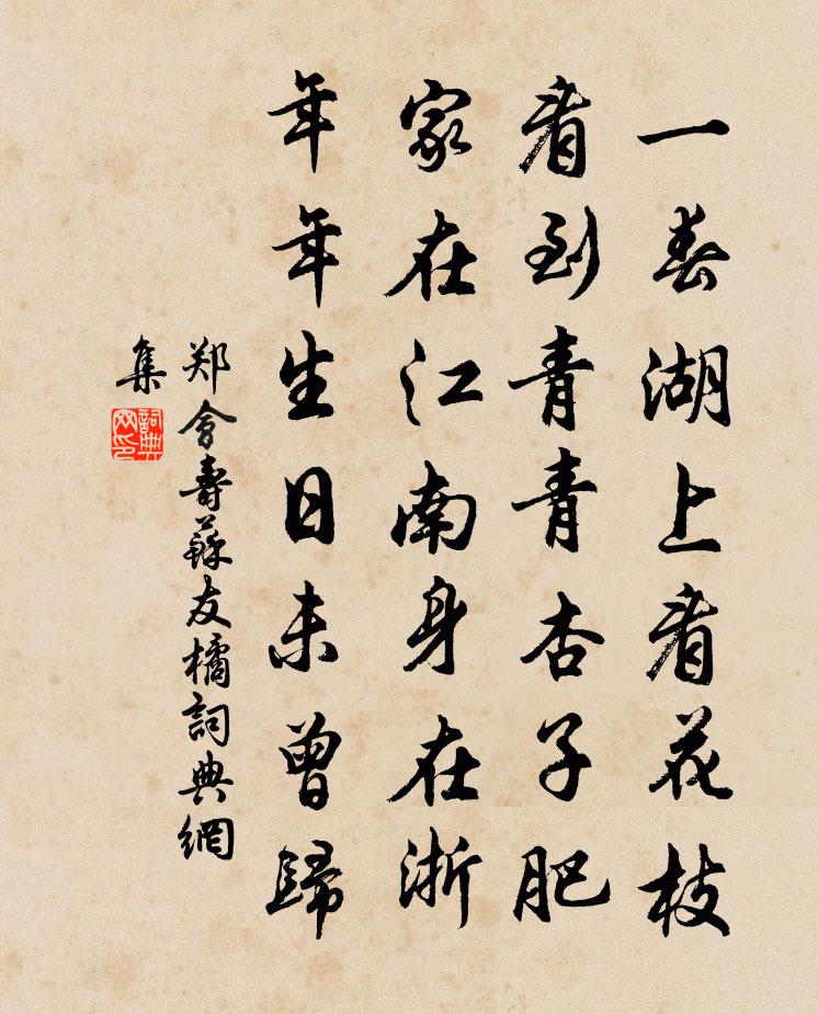 詩詞名句歷史字典書法欣賞書法字典國語詞典說文解字康熙字典古漢語字典標 題 作 者 詩 句 壽蘇友橘作者:鄭會 朝代:宋代壽蘇友橘原文一春湖上看花枝,看到青青杏子肥。家在江南身在浙,年年生日未曾歸。詩詞問答問:壽蘇友橘的作者是誰?答:鄭會問:壽蘇友橘寫於哪個朝代?答:宋代鄭會壽蘇友橘書法欣賞壽蘇友橘書法作品詩詞推薦少年游晏殊〔宋代〕霜花滿樹,蘭凋蕙慘,秋艷入芙蓉。胭脂嫩臉,金黃輕蕊,猶自怨西風。前歡往事,當歌對酒,無限到心中。更憑句程師孟〔宋代〕最愛荔枝初熟後,人間都在赤城間。送知全禪師南遊劉得仁〔唐代〕師譽振京城,談空萬乘聽。北行山已雪,南去木猶青。夜岳禪銷月,秋潭汲動星。回期不可定,孤鶴在高冥。送江水曹還遠館謝朓〔南北朝〕高館臨荒途,清川帶長陌。上有流思人,懷舊望歸客。塘邊草雜紅,樹際花猶白。日暮有重城,何由盡離席!定風波·江水沉沉帆影閻選〔唐代〕江水沉沉帆影過,游魚到晚透寒波。渡口雙雙飛白鳥,煙裊,蘆花深處隱漁歌。扁舟短棹歸蘭浦,人去,蕭蕭竹徑徐君季純常德教授廨中名一室日如舟取東坡為趙蕃〔宋代〕知君雅趣在滄洲,遊戲名齋亦以舟。舊識盈川川上路,幾時乘月下嚴州。偶成李流謙〔宋代〕驕陽前日擬鎔金,積雨逢秋卻厭淫。本自乘除無德怨,枉勞嗔旱復嗔霖。訪新城宰万俟紹之〔宋代〕野花香細綠陰成,風著征衫暑尚輕。流水有聲如學語,亂山無數不知我。柘林葉盡蠶初熟,麥隴人行雉不驚。少駐夢筆驛姚宏〔宋代〕一宵短夢驚流俗,千里高名掛里閭。遂使晚生矜此意,痴眠不讀半行書。姚江道中趙汝績〔宋代〕漉酒蒸糕饋歲時,紛紛兒女換新衣。隣翁七十看鵝鴨,日暮破船撐未歸。夢後得宋中道書梅堯臣〔宋代〕宵夢宋子語,晝得宋子書。書意與夢語,曾不異往初。昔我遭家難,逢子亦在廬。我南君大梁,千里非隔疏。念處山居五首白玉蟾〔宋代〕竹風瑟瑟野猿號,月下酣眠不脫蓑。恐至丹爐傷白蟻,懶燒松燭惜飛蛾。贈惟政禪師蔣堂〔宋代〕禪客尋常入舊都,黃牛角上掛瓶盂。有時帶笠穿雲去,便好和雲作畫圖。簡宗弟無逸稼主簿王邁〔宋代〕朅來纏是早春時,過眼園林囀子規。看絕交書君介癖,讀離騷賦我狂痴。斷無清夢飛蓬島,剩有冥搜到草池。聞說殘月寇準〔宋代〕半夜沉清影,宵殘猶伴吟。已甘垂樹杪,由得掛天心。淡色迷蓬戶,餘光映宿禽。誰家傷早別,凝思共沉沉。和范元作五絕胡寅〔宋代〕挾策博塞殊,愚智相千萬。反躬誠且樂,此事要早辦。嘉定府汪元量〔宋代〕郡樓著眼蜀天寬,分得巴江水一灣。大小峨眉相對立,梨花山接海棠山。寄題明州太守錢君倚眾樂亭鄭獬〔宋代〕使君何所樂,樂在南湖濱。有亭若孤鯨,覆以青玉鱗。四面擁荷花,花氣搖紅雲。使君來游攜芳樽,兩邊佳客坐翠用前韻招蕃叟弟仍和蕃叟癸卯二絕陳傅良〔宋代〕大饗須三飯,中黃起四維。欲追千古意,眼底合深思。螢詩陸龜蒙〔唐代〕肖翹雖振羽,戚促盡疑冰。風助流還急,煙遮點漸凝。不須輕列宿,才可擬孤燈。莫倚隋家事,曾煩下詔征。名句推薦樓殿無人春畫長。燕子歸來依舊忙。謝克家《憶君王·依依宮柳拂宮牆》 二月春花厭落梅。仙源歸路碧桃催。晏幾道《浣溪沙·二月春花厭落梅》 寄治亂於法術,托是非於賞罰韓非及後人《韓非子·大體》 西湖春色歸,春水綠於染歐陽修《春日西湖寄謝法曹歌》 梅花散彩向空山,雪花隨意穿簾幕。王旭《踏莎行·雪中看梅花》 山遠翠眉長。高處淒涼。菊花清瘦杜秋娘。吳文英《浪淘沙·九日從吳見山覓酒》 靜女其孌,貽我彤管。佚名《靜女》 我軍青坂在東門,天寒飲馬太白窟。杜甫《悲青坂》 年年陌上生秋草,日日樓中到夕陽。晏幾道《鷓鴣天·醉拍春衫惜舊香》 解釋春風無限恨,沉香亭北倚闌乾。李白《清平調·其三》