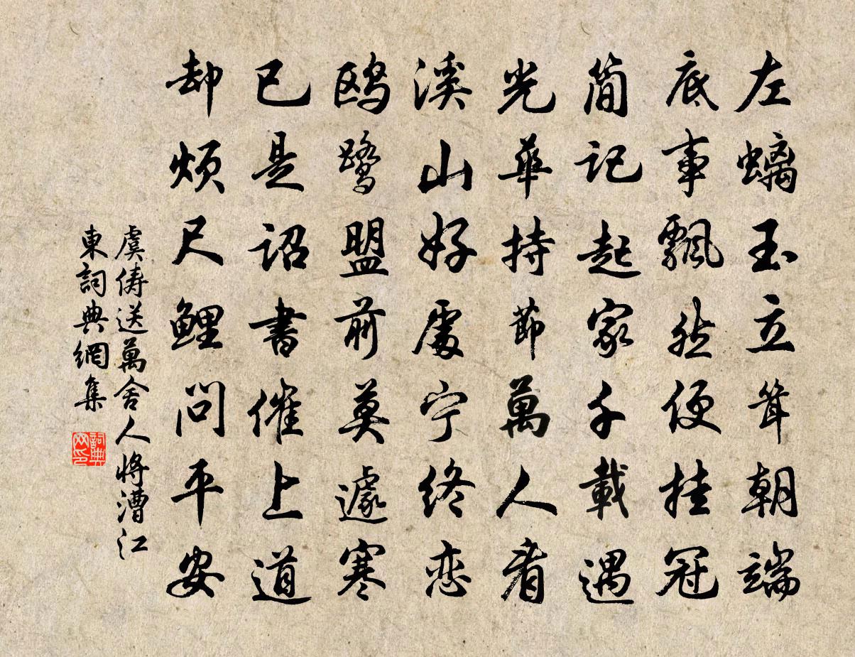 詩詞名句歷史字典書法欣賞書法字典國語詞典說文解字康熙字典古漢語字典標 題 作 者 詩 句 送萬舍人將漕江東作者:虞儔 朝代:宋代送萬舍人將漕江東原文左螭玉立聳朝端,底事飄然便掛冠。簡記起家千載遇,光華持節萬人看。溪山好處寧終戀,鷗鷺盟前莫遽寒。已是詔書催上道,卻煩尺鯉問平安。詩詞問答問:送萬舍人將漕江東的作者是誰?答:虞儔問:送萬舍人將漕江東寫於哪個朝代?答:宋代虞儔送萬舍人將漕江東書法欣賞送萬舍人將漕江東書法作品詩詞推薦宴桃源/如夢令陳允平〔宋代〕閒倚瑣窗工繡。春困兩眉頻皺。獨自下香街,攀折畫橋煙柳。晴晝。晴晝。偏稱玉樓歌酒。偈六十九首釋道寧〔宋代〕秋風秋雨頗相宜,萬水千山木葉飛。堪笑靈雲回首處,何須花發始忘機。秋風蕭索,秋山葉落。秋雨霖漓,秋天寥留別廉守蘇軾〔宋代〕編萑以苴豬,瑾塗以塗之。小餅如嚼月,中有酥與飴。懸知合浦人,長誦東坡詩。好在真一酒,為我醉宗資。奉和對山僧(一作同杜相公對山僧)皇甫冉〔唐代〕吏散重門掩,僧來閉閣閒。遠心馳北闕,春興寄東山。草長風光里,鶯喧靜默間。芳辰不可住,惆悵暮禽還。蓬萊客 拆心字起馬鈺〔元代〕猿急。猿不動真吾客。真吾客。傳靈榭,金間隔。真修煉非凡測。珠光瑩難塵溺。難塵溺。生靈焰,消煙息。遷居臨皋亭蘇軾〔宋代〕我生天地間,一蟻寄大磨。區區欲右行,不救風輪左。雖雲走仁義,未免違寒餓。劍米有危炊,針氈無穩坐。豈無築城詞二首陸龜蒙〔唐代〕城上一培土,手中千萬杵。築城畏不堅,堅城在何處。莫嘆將軍逼,將軍要卻敵。城高功亦高,爾命何勞惜。九溪十八磵周文璞〔宋代〕九溪十八磵,冷見帝青苔。洗足僧書石,臨流客放杯。案頭松葉響,身畔野花開。百六辭歌吹,清游始一回。釣台李廌〔宋代〕釣國固有術,直鉤寧漫勞。吾常鄙龍伯,豈復羨琴高。濯足風波地,游心虎豹韜。誰雲無是子,天下自囂囂。頌證道歌證道歌釋印肅〔宋代〕定慧圓明不滯空,黃幡直下起清風。當時不得印宗老,盧能有過且無功。書黃筌畫翎毛花蝶圖二首蘇軾〔宋代〕短翎長喙喜喧卑,曳練雙翔亦自奇。賴有黃鸝斗嬛好,獨依蘚石立多時。綠陰青子已愁人,忍見中庭燕麥新。周悵江上有感何應龍〔宋代〕江上秋深客未歸,荻花楓葉兩依依。傷心最是長橋路,落日西風一鴈飛。峽山飛來寺章得象〔宋代〕澄江詰曲峽中天,遠使歸時駐畫船。久別忽經星一紀,暫來才見月三弦。勞生草草真徒爾,陳跡依依亦愴然。回首華城西北雉堞最高,崔相公首創樓台,錢左丞白居易〔唐代〕高居稱君子,瀟灑四無鄰。丞相棟樑久,使君桃李新。凝情看麗句,駐步想清塵。況是寒天客,樓空無主人。水調歌頭(懷山中)徐沖淵〔宋代〕窮達付天命,生死見交情。人今老矣,□□狗苟與蠅營。贏得一頭霜雪。閒卻五湖風月。鷗鳥負前盟。顏厚已如甲背面美人圖高啟〔明代〕欲呼回首不知名,背立東風幾許情。莫道畫師元不見,傾城雖見畫難成。又游靈岩祖無擇〔宋代〕紅塵滿馬三回到,青嶂迎人萬疊開。卻被野僧相顧笑,區區還是舊時來。資聖寺林夔孫〔宋代〕華峰跨蒼穹,下有雲一壑。翬飛二百秋,蜂巢幾千落。靈泉際空留,宿霧臨除薄。山呈萬古姿,竹隕六月籜。當年秋夜有懷皮日休〔唐代〕夢裡憂身泣,覺來衣尚濕。骨肉煎我心,不是謀生急。如何欲佐主,功名未成立。處世既孤特,傳家無承襲。明朝偈頌一百五十首釋心月〔宋代〕一人跨三腳驢,一人騎三角虎。三家村里交肩,萬仞崖頭移步。名句推薦水流花謝兩無情,送盡東風過楚城。崔塗《春夕》 我欲穿花尋路,直入白雲深處,浩氣展虹霓。黃庭堅《水調歌頭·遊覽》 日暮鄉關何處是?煙波江上使人愁。崔顥《黃鶴樓 / 登黃鶴樓》 西風來勸涼雲去,天東放開金鏡。史達祖《齊天樂·中秋宿真定驛》 年年遊子惜余春,春歸不解招遊子。賀鑄《惜余春·急雨收春》 人生百年有幾,念良辰美景,休放虛過。元好問《驟雨打新荷》 願我如星君如月,夜夜流光相皎潔。范成大《車遙遙篇》 寒蟬淒切,對長亭晚,驟雨初歇。柳永《雨霖鈴·寒蟬淒切》 水溢芙蓉沼,花飛桃李蹊。薛道衡《昔昔鹽》 此生此夜不長好,明月明年何處看。蘇軾《陽關曲 / 中秋月》