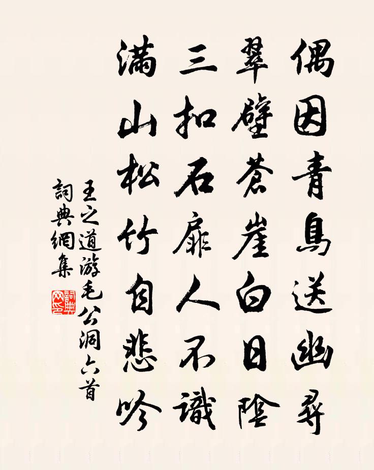 詩詞名句歷史字典書法欣賞書法字典國語詞典說文解字康熙字典古漢語字典標 題 作 者 詩 句 游毛公洞六首作者:王之道 朝代:宋代游毛公洞六首原文偶因青鳥送幽尋,翠壁蒼崖白日陰。三扣石扉人不識,滿山松竹自悲吟。詩詞問答問:游毛公洞六首的作者是誰?答:王之道問:游毛公洞六首寫於哪個朝代?答:宋代王之道游毛公洞六首書法欣賞游毛公洞六首書法作品詩詞推薦散花注重晚泊陳造〔宋代〕略眼毛山夾,枯涸不可留。風帆劈箭去,遼少吹一漚。長年面死灰,死爭如赴仇。一飯六十里,幸泊散花洲。呼婦頌古二十首釋了一〔宋代〕殿上從來好功德,如何侍者卻疑惑。趙州露出赤心肝,問著依然墨漆黑。詠懷白居易〔唐代〕冉牛與顏淵,卞和與馬遷。或罹天六極,或被人刑殘。顧我信為幸,百骸且完全。五十不為夭,吾今欠數年。知分同尹少稷賦岩桂韓元吉〔宋代〕江南秋盡猶無菊,只有幽香滿岩谷。紛紛千樹散黃金,翠葉離披剪寒玉。繁枝疑從缺月墮,嫩葉不受微風觸。芳枝次韻和景彝閏臘二十五日省宿梅堯臣〔宋代〕君嘗編史似吳兢,又值甘泉馬踏冰。重臘雪花方漫漫,宿廳書架自層層。桉頭美酒初溫火,簾底微風欲動燈。永夜游東山待月王炎〔宋代〕只有曲生為侶,夜涼同迓冰輪。未審素娥知否,惟予與影三人。上黃端明壽詩以竚期三入後一品見玄孫為韻李呂〔宋代〕姓安本無雙,山林今見一。動必合禮經,心焉在王室。暮春始聞雷陳普〔宋代〕倉庚杜宇已喧卑,出地奔空獨爾遲。六合中間皆起處,一更前後恰來時。吝蝸封閉俄驚破,迷蝶沈酣恐未知。菌蠢頌古一百二十一首釋宗杲〔宋代〕腦後見腮村僧,大開眼了作夢。雖然趁得老鼠,一棒打破油瓮。西郊李廌〔宋代〕黃花作秋色,槁莢作秋聲。殘春有秋意,奈此惻惻情。喬木點新翠,古壠集飄英。午風薰徑草,麥浪搖新晴。脂車瓦店雨作四首楊萬里〔宋代〕詩人長怨沒詩材,天遣斜風細雨來。領了詩材還又怨,問天風雨幾時開。頌證道歌證道歌釋印肅〔宋代〕語默動靜體安然,謝三拋下釣魚船。剛道參方不出嶺,痴人猶尚走如煙。朝中措佚名〔宋代〕嚴霜封草樹凋紅。葉落小園空。何事洛陽花面,卻來冠冕秋風。尊前羞損,籬邊野菊,池上芙蓉。莫放花歸崑閬,竹翠姜特立〔宋代〕竹翠涼虛寢,爐薰養道情。日長無一事,燕坐有餘清。挽提乾趙君陳棣〔宋代〕識君童稚過成人,旋見從師學日新。一舉文場收雋譽,十年仕路固清貧。豪添徐邈中賢興,瘦減相如病渴身。如善效白體二首張耒〔宋代〕功名富貴付悠悠,高臥山城又過秋。燕坐香燈為靜侶,閒行麋鹿是同游。青黃草木新霜過,瀟灑溪山夜雨收。回首夜起思子虡陸游〔宋代〕我久依耕隴,兒方吊戰場。臥聞風浩蕩,起視月蒼茫。老境綈袍暖,貧家菜粥香。惟愁殺風景,無酒作重陽。沈國錄席上用趙監丞韻仲並〔宋代〕晚來無計障風饕,美酒十千價未高。成敗兩奩供夜戰,醉醒一斗付春醪。流杯指日重修禊,琢句如公可命騷。多謝贈俊公道人詩范雲〔南北朝〕秋蓬飄秋甸。寒藻泛寒池。風條振風響。霜葉斷霜枝。幸及清江滿。無使明月虧。月虧君不來。相期竟悠哉。三月二十五夜達旦不能寐陸游〔宋代〕愁眼已無寐,更堪衰病嬰?蕭蕭窗竹影,磔磔水禽聲。捶楚民方急,煙塵虜未平。一身那敢計,雪涕為時傾!名句推薦武公不但歌淇澳,賢女猶能唁衛侯。姜塘《摘星樓九日登臨》 親愛我,孝何難。親憎我,孝方賢。李毓秀《弟子規·入則孝》 因人成事,其功不難。魏徵《隋書·列傳·卷七》 白髮戴花君莫笑,六么催拍盞頻傳。歐陽修《浣溪沙·堤上遊人逐畫船》 野客預知農事好,三冬瑞雪未全消。戴復古《除夜》 料峭春風吹酒醒,微冷,山頭斜照卻相迎。蘇軾《定風波·三月七日》 醉後涼風起,吹人舞袖回。李白《與夏十二登岳陽樓》 福無雙至,禍不單行。張南莊《何典·第三回》 白雲初下天山外,浮雲直向五原間。盧思道《從軍行》 聲樂之入人也深,其化人也速。荀子《荀子·樂論》