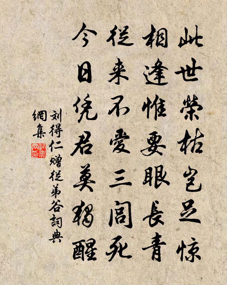 詩詞名句歷史字典書法欣賞書法字典國語詞典說文解字康熙字典古漢語字典標 題 作 者 詩 句 贈從弟谷作者:劉得仁 朝代:唐代贈從弟谷原文此世榮枯豈足驚,相逢惟要眼長青。從來不愛三閭死,今日憑君莫獨醒。詩詞問答問:贈從弟谷的作者是誰?答:劉得仁問:贈從弟谷寫於哪個朝代?答:唐代問:贈從弟谷是什麼體裁?答:七絕劉得仁贈從弟谷書法欣賞贈從弟谷書法作品注釋全唐詩:卷545-33詩詞推薦送董判官高適〔唐代〕逢君說行邁,倚劍別交親。幕府為才子,將軍作主人。近關多雨雪,出塞有風塵。長策須當用,男兒莫顧身。西壁畫松宋祁〔宋代〕數株森立寫皴堅,霜骨鱗膚千萬年。秦帝從官徒自苦,取封不及大夫賢。古杭感事王鎡〔宋代〕入北鑾輿竟不回,銜花輦路長蒼苔。九重禁地為僧舍,六代園陵變劫灰。宋國衣冠春草綠,趙宮珠翠野花開。雖然和浦勉道轉運判官巡行出關韻袁說友〔宋代〕濤雷殷晝候前驅,駟馬橋邊使者車。風約江聲喧笑語,山迎雨腳傍閻閭。城頭北海傾樽後,馬耳西風攬轡初。關外游海珠寺呂定〔宋代〕何年神物抱珠游,遺向滄浪第一洲。五色化成金世界,六鰲擎出寶香樓。光涵蛟室星辰動,影落龍宮日月浮。萬古仲舅尚書生朝樓鑰〔宋代〕去年生朝燕稽山,館舍朗朗屋百閒。紅裙合樂飲徹旦,坐上眾客皆酡顏。今年生朝半歸路,竹輿蕭蕭曉沖雨。回頭陪任漕胡倉登滕王閣秋屏列岫吳芾〔宋代〕滕閣秋屏已快哉,更登列岫少徘徊。溶溶一水檐前去,隱隱千帆坐上來。每恨長年成契闊,頗欣今日得追陪。能並題僧惠升壁宋祁〔宋代〕何年飛虎錫,此地鎖鷹房。水入禪心定,花飄供裓香。高談犀飾麈,清啜茗成槍。千騎嘗留此,籠紗照屋樑。憶王孫王丹桂〔元代〕四時流轉急如梭。百歲韶華屈指過。惟願人人出愛河。養沖和。功滿與山巨源絕交書嵇康〔魏晉〕康白:足下昔稱吾於潁川,吾常謂之知言。然經怪此意尚未熟悉於足下,何從便得之也?前年從河東還,顯宗、阿龜山禱雨徐夢發〔宋代〕久困焦熬里,持香謁二禪。會留一宿覺,了得寸心緣。鶴識小溪路,鍾聞上界天。龍湫分勺水,法海遍三千。送趙吉州判院器之移利路提刑楊萬里〔宋代〕趙侯邁往隆準孫,未年五十尃三城。千里秋毫無遁情,兩眼洞照如秋鷹。何須奮髯走百吏,棠陰畫寂清如水。年年紅樓春趣曹雪芹〔清代〕 一語末了, 只聽窗外竹子上一聲響,恰似窗屜子倒了一般,眾人嚇了一跳。丫鬟們出去瞧時,簾外丫鬟嚷道無悶·催雪吳文英〔宋代〕霓節飛瓊,鸞駕弄玉,杳隔平雲弱水。倩皓鶴傳花,衛姨呼起。莫待粉河凝曉,趁夜月、瑤笙飛環佩。正蹇驢吟影欲知歸期近呈天啟鄧忠臣〔宋代〕欲知毛歸期近,毛行行重攜毛手。掖垣毛隔華省,明日難邂逅。作者六七人,崢嶸竦神秀。藏蟄龍虎姿,風雲即騰秋晚孤山周端臣〔宋代〕山夾寒雲晚不收,蘋花洲渚雁聲秋。西湖處士無訊息,落日丹楓處處愁。最高樓(催春)蔣捷〔宋代〕新春景,明媚在何時。宜早不宜遲。軟塵巷陌青油幰,重簾深院畫羅衣。要些兒,晴日照,暖風吹。一片片、雪兒懷鹿門縣名離合二首皮日休〔唐代〕山瘦更培秋後桂,溪澄閒數晚來魚。台前過雁盈千百,泉石無情不寄書。十里松蘿陰亂石,門前幽事雨來新。野霜寄題洪州慈濟師西軒司馬光〔宋代〕登入臨勝絕,悵息未成游。山氣高閃霽,湖光碧照秋。煙疏茶灶迥,燈冷竹房幽。安得聊憑檻,蕭然洗客愁。觀梅方岳〔宋代〕蒼煙喬木野人家,數醃山籬一徑斜。此老不知何面目,只將空手對梅花。名句推薦君子敵小人,亦小人也。小人友君子,亦君子也。來俊臣《羅織經·制敵卷第五》 江闊雲低、斷雁叫西風。蔣捷《虞美人·聽雨》 習見善則安於為 善,習見惡則安於為惡。歐陽修《新五代史·列傳·雜傳第三十九》 煙柳畫橋,風簾翠幕,參差十萬人家。柳永《望海潮·東南形勝》 天街小雨潤如酥,草色遙看近卻無。韓愈《早春呈水部張十八員外 / 初春小雨 / 早春》 長相思,摧心肝。李白《長相思三首》 離愁萬種,醉鄉一夜頭白。施耐庵《念奴嬌·天南地北》 落葉聚還散,寒鴉棲復驚。李白《三五七言 / 秋風詞》 隔座送鉤春酒暖,分曹射覆蠟燈紅。李商隱《無題·昨夜星辰昨夜風》 欲心難厭如溪壑,財物易盡若漏卮。程登吉《幼學瓊林·卷三·人事》