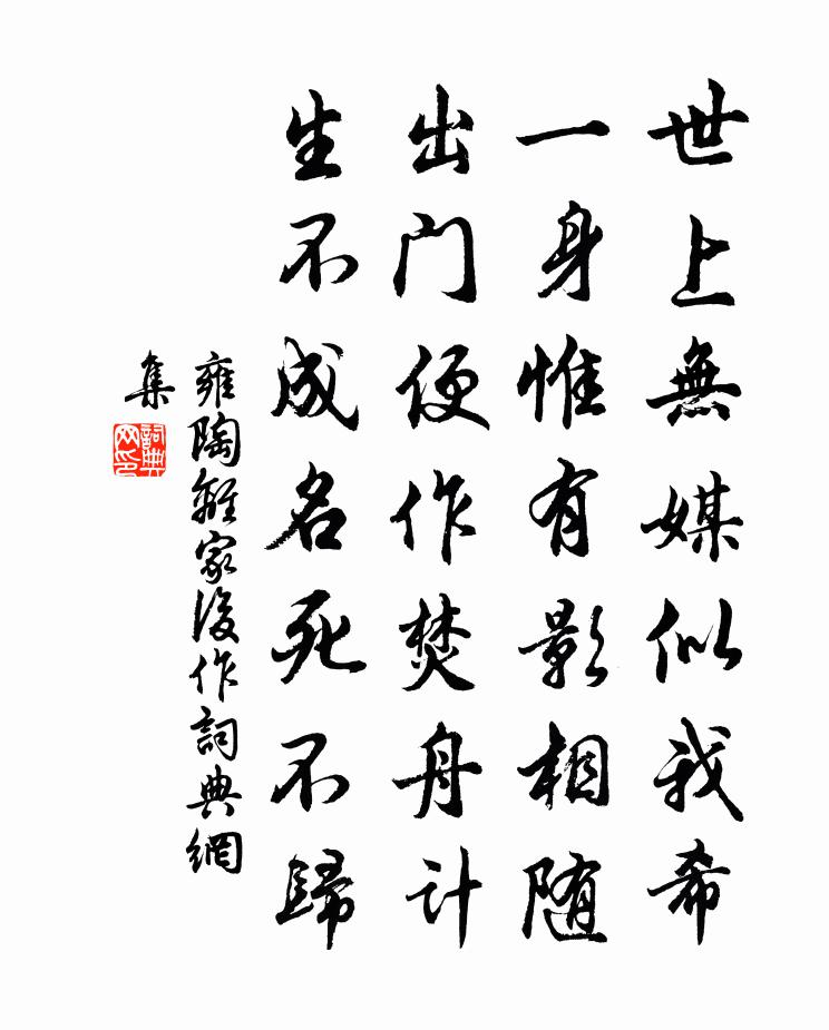 詩詞名句歷史字典書法欣賞書法字典國語詞典說文解字康熙字典古漢語字典標 題 作 者 詩 句 離家後作作者:雍陶 朝代:唐代離家後作原文世上無媒似我希,一身惟有影相隨。出門便作焚舟計,生不成名死不歸。詩詞問答問:離家後作的作者是誰?答:雍陶問:離家後作寫於哪個朝代?答:唐代問:離家後作是什麼體裁?答:七絕雍陶離家後作書法欣賞離家後作書法作品注釋全唐詩:卷518-64詩詞推薦行住坐臥三十二頌釋印肅〔宋代〕黃金布地非為富,白玉橫街惹寇徒。心地平堅塵不入,修羅萬仇手難摸。次韻石湖居士游虎丘陳造〔宋代〕山靈知我欲巾車,岫幌雲扃已袚除。竹葆松幢平幾席,碧煙紅影認林廬。飯分禪供清無敵,飲屬詩流興有餘。莫話秋日晚思李商隱〔唐代〕桐槿日零落,雨余方寂寥。枕寒莊蝶去,窗冷胤螢銷。取適琴將酒,忘名牧與樵。平生有游舊,一一在煙霄。遣懷魚玄機〔唐代〕閒散身無事,風光獨自游。斷雲江上月,解纜海中舟。琴弄蕭梁寺,詩吟庾亮樓。叢篁堪作伴,片石好為儔。燕雀種田行趙友直〔宋代〕春雨一犁足郊原,南村北村齊種田。拋秧落水時競捷,老者在後少者前。日暮天寒完未得,比鄰來相助插田。比鄰滴滴金晁端禮〔宋代〕龐兒周正心兒得。眼兒單、鼻兒直。口兒香、發兒黑。腳兒一折。從來薄命多阻隔。未曾有恁相識。除非燒香做功郡圃曉步因登披僊閣四首楊萬里〔宋代〕李花半落雪成堆,未後桃花錄續開。白錦地衣紅錦障,侵晨供張等儂來。次韻陳肇芳竿贈李相士許月卿〔宋代〕相心然後相人形,試相何時可太平。集思廣益真宰相,開誠布公肝膽傾。先相君子與小人,小人枉了君子贏。見吾題金州西園九首石庭姚合〔唐代〕布石滿山庭,磷磷潔還清。幽人常履此,月下屐齒鳴。藥草枝葉動,似向山中生。過王判官西津所居岑參〔唐代〕勝跡不在遠,愛君池館幽。素懷岩中諾,宛得塵外游。何必到清谿,忽來見滄洲。潛移岷山石,暗引巴江流。樹密蜂兒楊萬里〔宋代〕密蜂不食人間倉,玉露為酒花為糧。作蜜不忙採花忙,蜜成猶帶百花香。蜜成萬蜂不敢嘗,要輸蜜國供蜂王。蜂王鹽梅李龍高〔宋代〕世味明知可口難,到頭終不換寒酸。直須袖卻和羹手,何必貪居鼎鼐間。鷓鴣天 水仙詞沈禧〔元代〕邂逅江妃澤畔逢。何年謫降蕊珠宮。輕綃翦袂羅裁襪,秋水為神玉作容。清淺處,月明中。凌波微步欲飄空。三生初冬即事白玉蟾〔宋代〕搘頤默默靠柴扉,頓放詩題塞翠微。三徑寒松含宿雨,一川衰草臥斜暉。孤煙白處丫峰露,亂葉紅邊個鳥歸。觸目古龍孺人曹氏輓詞林亦之〔宋代〕寒原何處哭,下馬欲銷魂。白日數行淚,黃柑十里村。傳家猶墨綬,聘婦盡朱門。似此何多恨,空漚不要論。次韻張恕春莫蘇轍〔宋代〕只言城市無佳處,亦有南湖幾度游。好雨晴時三月盡,啼鶯到後百花休。老猿好飲常連臂,野馬依人自絡頭。不肯杏園聯句李絳〔唐代〕杏園千樹欲隨風,一醉同人此暫同。 ——群上司空老態忽忘絲管里,衰顏宜解酒杯中。 ——李絳曲江日暮殘紅謝王軒西施〔唐代〕妾自吳宮還越國,素衣千載無人識。當時心比金石堅,今日為君堅不得。郭中山居方乾〔唐代〕莫見一瓢離樹上,猶須四壁在林間。沈吟不寐先聞角,屈曲登高自有山。濺石迸泉聽未足,亞窗紅果臥堪攀。公卿和王昭符進士贈洞庭趙先生高駢〔唐代〕為愛君山景最靈,角冠秋禮一壇星。藥將雞犬雲間試,琴許魚龍月下聽。自要乘風隨羽客,誰同種玉驗仙經。煙霞名句推薦春雲不變陽關雪,桑葉先知胡地秋。李昂《從軍行》 惻隱之心,人皆有之孟子《孟子·告子章句上·第六節》 今施人薄而望人厚,則人唯恐其有賜於己也。墨子《墨子·49章 魯問》 長幼有序。孟子《孟子·滕文公章句上·第四節》 報導先生歸也,杏花春雨江南。虞集《風入松·寄柯敬仲》 黃河落天走東海,萬里寫入胸懷間。李白《贈裴十四》 巧媳婦煮不得沒米粥馮夢龍《警世通言·卷十二》 撼山易,撼岳家軍難。脫脫《宋史·列傳·卷一百二十四》 秦樓月,年年柳色,灞陵傷別。李白《憶秦娥·簫聲咽》 何處合成愁。吳文英《唐多令·惜別》