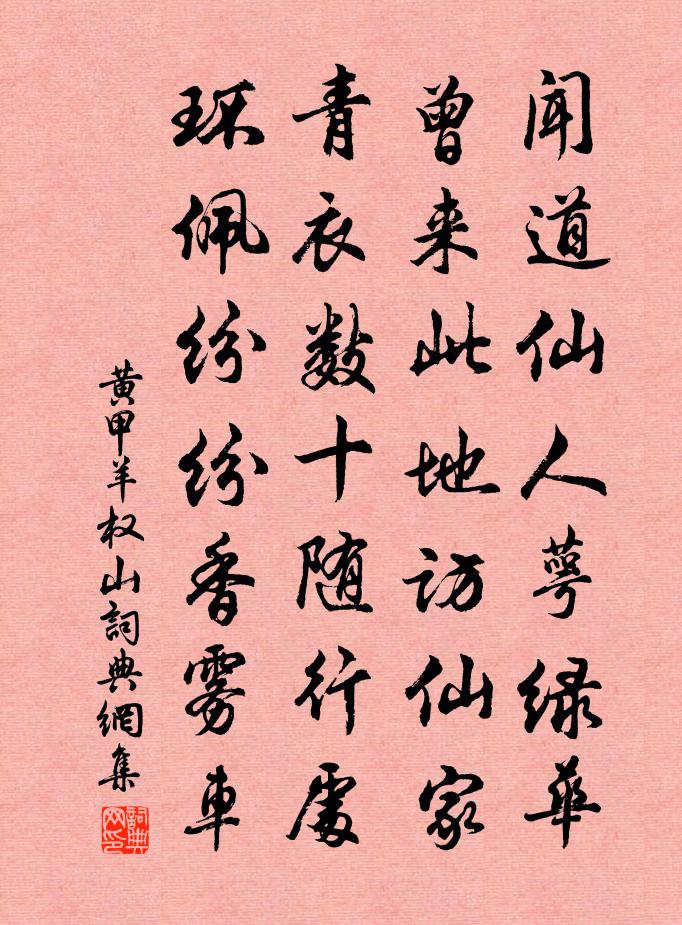 詩詞名句歷史字典書法欣賞書法字典國語詞典說文解字康熙字典古漢語字典標 題 作 者 詩 句 羊權山作者:黃甲 朝代:宋代羊權山原文聞道仙人萼綠華,曾來此地訪仙家。青衣數十隨行處,環佩紛紛香霧車。詩詞問答問:羊權山的作者是誰?答:黃甲問:羊權山寫於哪個朝代?答:宋代黃甲羊權山書法欣賞羊權山書法作品詩詞推薦小重山(春雪小醉)毛滂〔宋代〕門外東風糝玉塵。曲房花氣藹,博山春。小槽珠滴桂椒芬。梅蕊綻,誰共醉中聞。睡起靜無人。曲屏橫遠翠,錦為歲晚懷鏡湖舊隱慨然有作陸游〔宋代〕公府還家鬢未秋,鏡湖南畔決歸休。讀書精舍豈輕出,採藥名山成遠遊。白墮興來猶小醉,青精材足更何求。俗間生查子洪适〔宋代〕七月到盤洲,枕簟新涼早。岸曲側黃葵,沙際排紅蓼。團團歌扇疏,整整爐煙裊。環坐待橫參,要乞珠絲巧。瀟湘夜雨(和潘都曹九日詞)周紫芝〔宋代〕江繞淮城,雲昏楚觀,一枝煙笛誰橫。曉風吹帽,霜日照人明。暗惱潘郎舊恨,應追念、菊老殘英。秋空晚,茱萸和李雁湖晚春即事八首吳泳〔宋代〕杏花漠漠柳陰陰,彷佛前年禮殿深。賴有詩書緣不心,青燈細雨短長吟。達磨贊釋了惠〔宋代〕西土不拘,東土不管。口邊落節,臂邊拔本。自攜只履賦歸歟,腳下至今猶未穩。失調名周密〔宋代〕(前缺)商,西風只在垂楊外。贈詩僧方岳〔宋代〕瀑泉癩可能詩最,畢竟難為本色僧。要識廬山真面目,一溪明月冷於冰。新熱送同邸歸客有感二首楊萬里〔宋代〕瘦不緣詩不為春,只教懸罄未教行。清和天理不歸去,六月長途作麽生。宿王尊師隱居於鵠〔唐代〕夜愛雲林好,寒天月里行。青牛眠樹影,白犬吠猿聲。一磬山院靜,千燈溪路明。從來此峰客,幾個得長生。洛陽早春憶吉中孚校書、司空曙主簿因寄清江上人盧綸〔唐代〕值迥逢高駐馬頻,雪晴閒看洛陽春。鶯聲報遠同芳信,柳色邀歡似故人。酒貌昔將花共艷,鬢毛今與草爭新。年來黃陵題詠三首史正志〔宋代〕廟塑湘妃少女容,誰知百歲奉重瞳。從今好事詩騷客,莊肅錄存念慮中。得瑞香於四明曾幾〔宋代〕錦樹轉欒海角州,移春檻里見風流。兩三翠蓋張前面,千百香囊綴上頭。絕代紅梅相對好,妒人山麝莫來休。衰翁句老農〔宋代〕倖存耕雨地,況值養花時。和子直聞運使兵部駐節京口寄呈如晦陳襄〔宋代〕南徐新政煥秋陽,九日登臨喜觴。送酒客尋方外士,觀風人是省中郎。千家弦管聞謠俗,萬頃湖山入燕堂。使節未行香子(馬上有感)趙長卿〔宋代〕驕馬花驄。柳陌經從。小春天、十里和風。個人家住,曲巷牆東。好軒窗,好體面,好儀容。燭灺歌慵。斜月朦朧送水雲歸吳翁懿淑〔宋代〕金門夜醉紫霞觴,乞得黃冠還故鄉。一似陳摶歸華岳,又如李泌過衡陽。次韻弟觀授學陳子得家陳著〔宋代〕憶昨依依話別端,瀟瀟暮雨滿山寒。去家幸是老親健,坐館當如初宦看。歸夢隨風揚綠袂,吟情逐日寫詩闌。從今記夢陸游〔宋代〕久住人間豈自期,斷砧殘角助淒悲。征行忽入夜來夢,意氣尚如年少時。絕塞但驚天似水,流年不記鬢成絲。此身偈頌一百六十首釋宗杲〔宋代〕才方八月中秋,又是九月十五。唯有這個不遷,一眾耳聞目睹。名句推薦凡人之患,蔽於一曲,而闇於大理。荀子《荀子·解蔽》 生當作人傑,死亦為鬼雄。李清照《夏日絕句》 至今思項羽,不肯過江東。李清照《夏日絕句》 知足不辱,知止不殆,可以長久。老子《老子·德經·第四十四章》 且樂生前一杯酒,何須身後千載名?李白《行路難三首》 一叫一迴腸一斷,三春三月憶三巴。李白《宣城見杜鵑花 / 子規》 別離滋味濃於酒。著人瘦。此情不及牆東柳。春色年年如舊。張耒《秋蕊香·簾幕疏疏風透》 居身務期質樸,教子要有義方。朱柏廬《朱子家訓·全文》 竹樹無聲或有聲,霏霏漠漠散還凝。杜荀鶴《春日山中對雪有作》 恐是仙家好別離,故教迢遞作佳期。李商隱《辛未七夕》